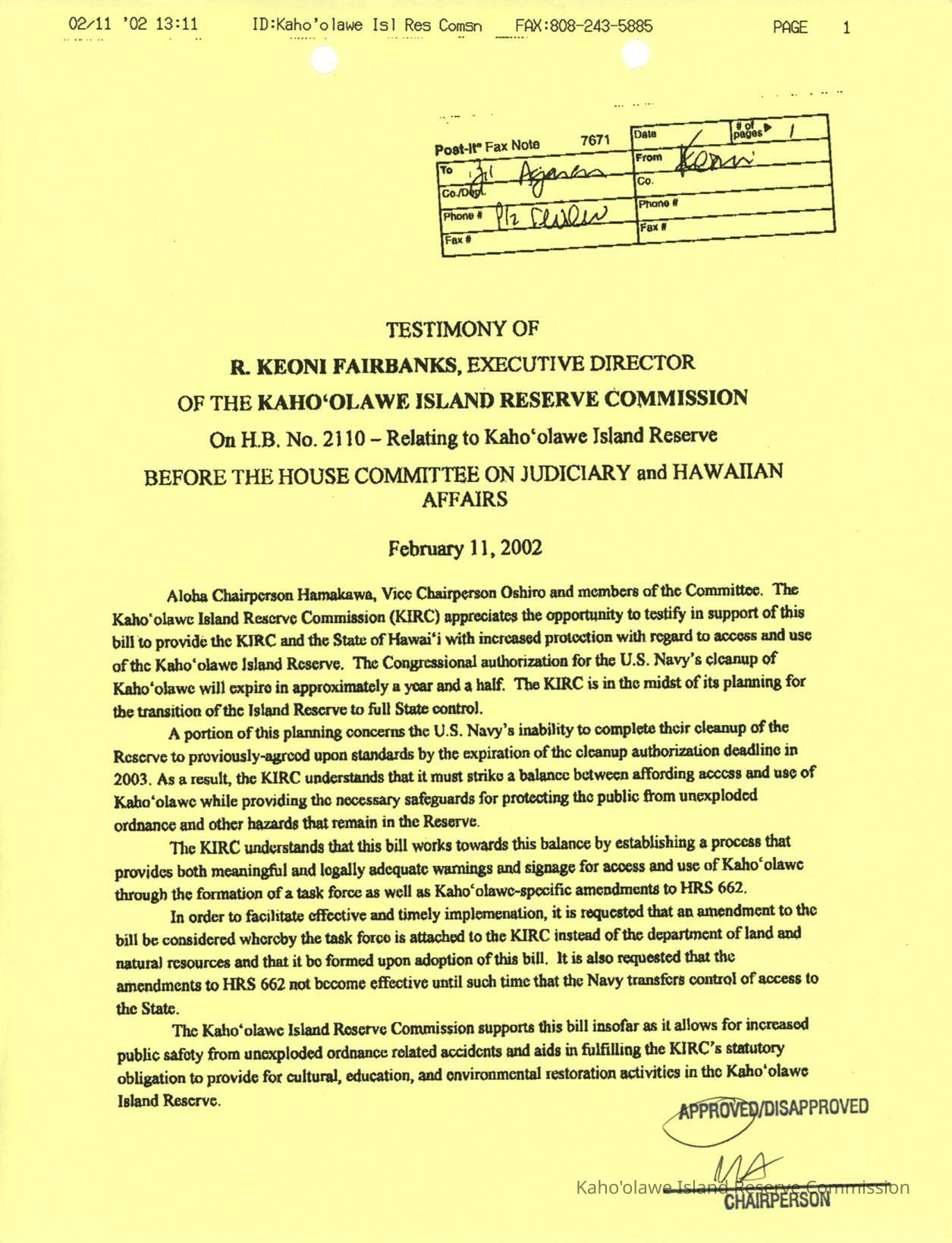 Faxed copy of Testimony of R. Keoni Fairbanks, Executive Director of the Kaho'olawe Island Reserve Commission On H.B. No. 2110-Relating to Kaho'olawe Island Reserve Before the House Committee on Judiciary and Hawaiian Affairs.Creator