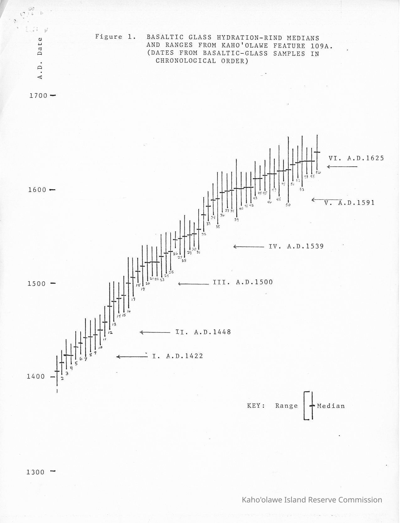 Figure 1: Basaltic glass hydration-rind medians and ranges from Kaho'olawe Feature 109A (dates from basaltic-glass samples in chronological order) and Figure 2: Concentrations of artifacts and other items in Kaho'olawe Feature 109A. Two black and white xerographically copied pagesDate(s) of Creation