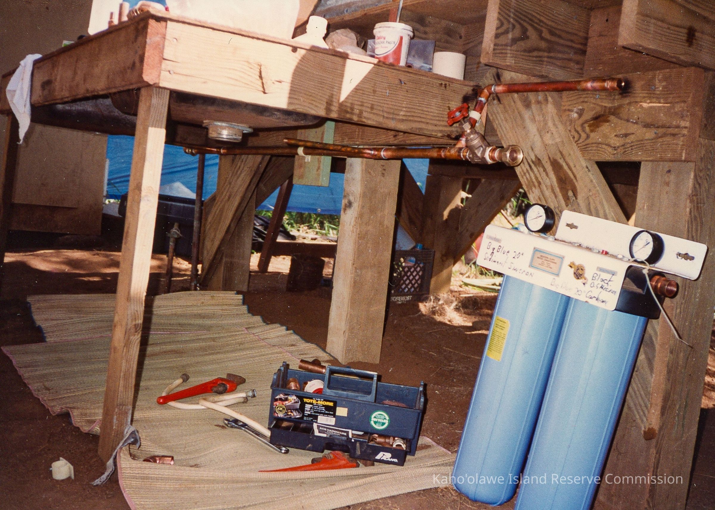 Color photo of blue filters and black toolbox next to wooden table. This photo was probably taken at Wailuna in Hakioawa 'Ili. The hand-written notation on the previous page in the original photo album read ""November 14-17 1993; Advance Crew Before Makahiki."