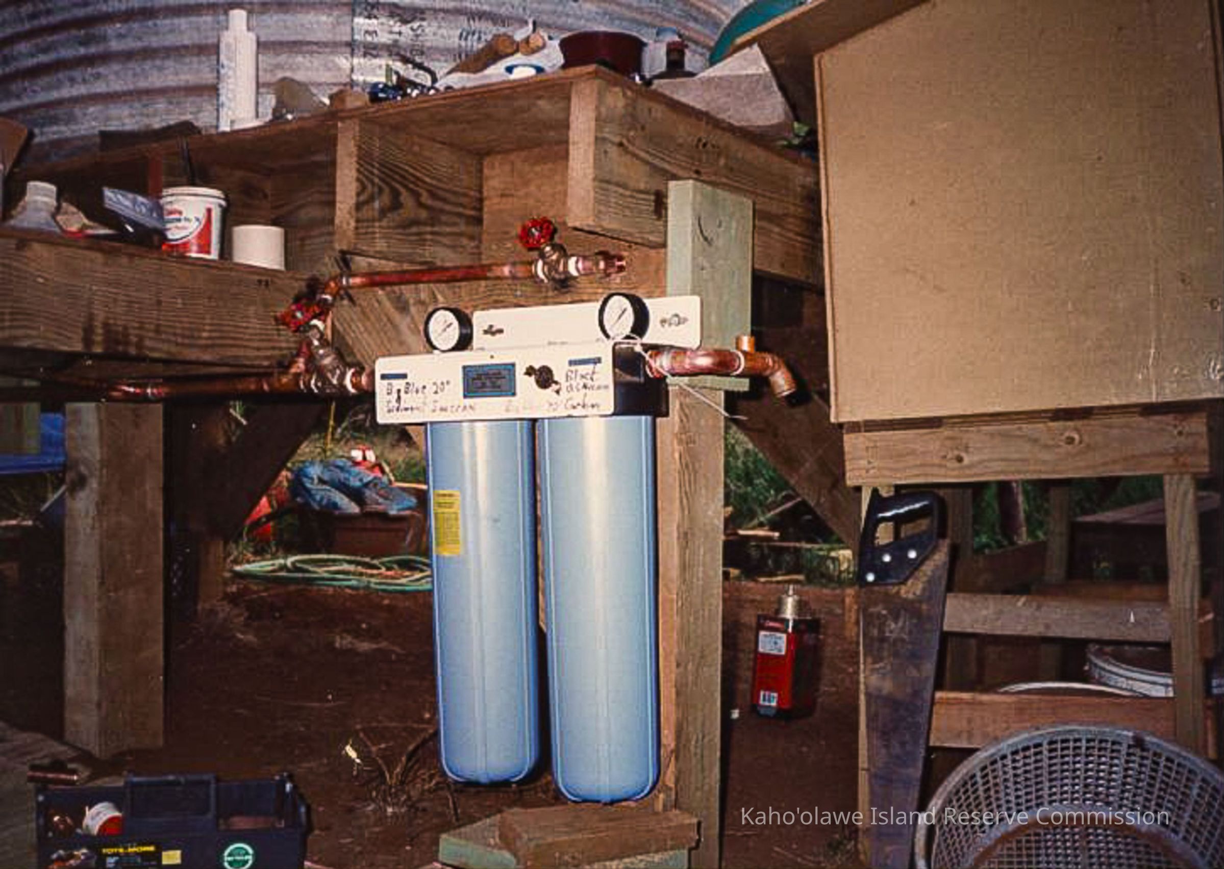 Color photo of blue tanks or filters (possible water filtration cylinders) with black and white gauges on top attached to a wooden frame. Copper pipes are attached to them. The wood structure is located next a circular metal structure. The photo was probably taken at Wailuna in Hakioawa 'Ili. The hand written notation on the original photo album page reads "November 14-17 1993; Advance Crew Before Makahiki."