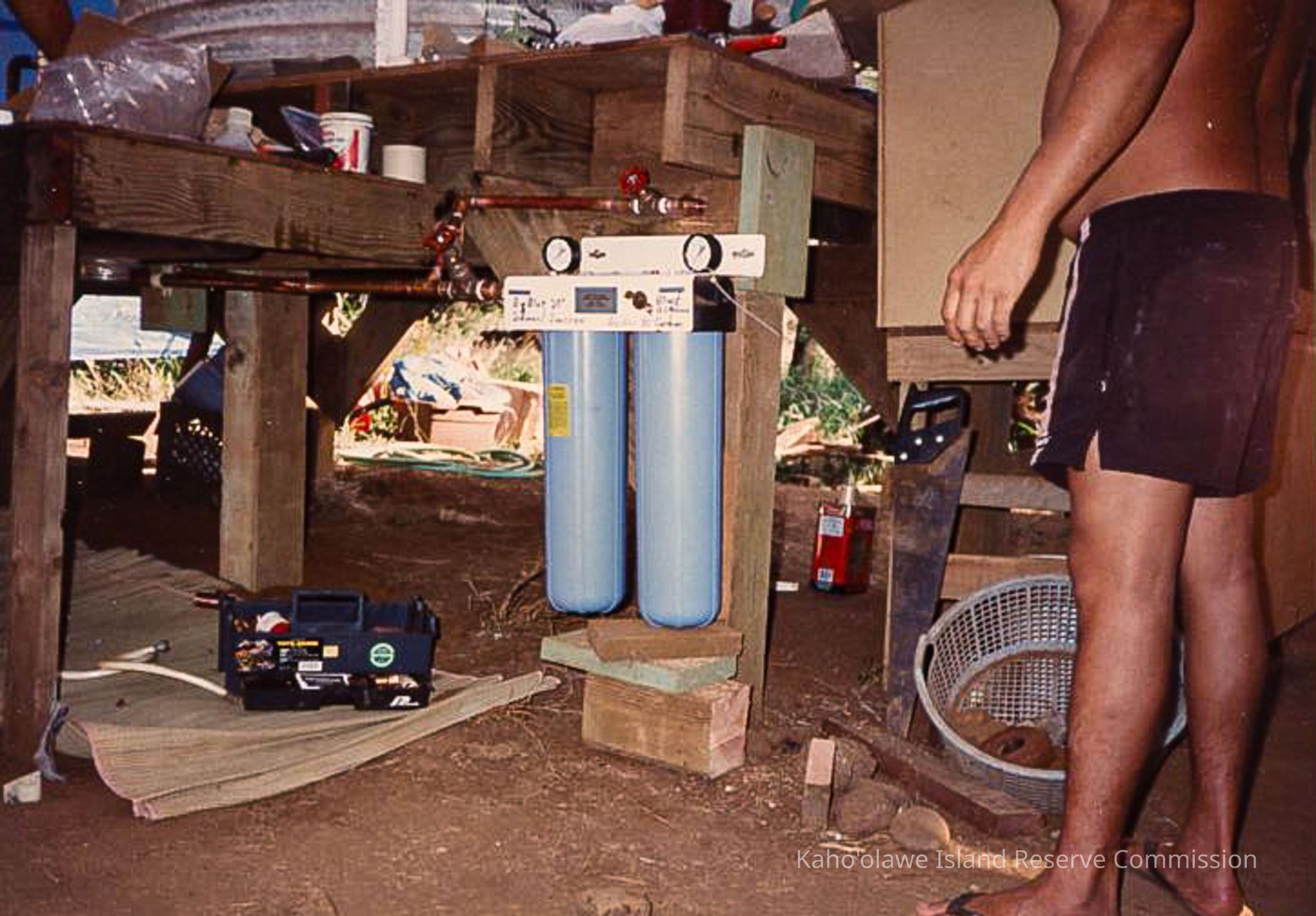A blue filter system attached to a wooden structure with an unknown person's legs and saw to the right. A black container is to the left. Handwritten notation on the original photo album reads: "November 14-17 1993; Advance Crew Before Makahiki."