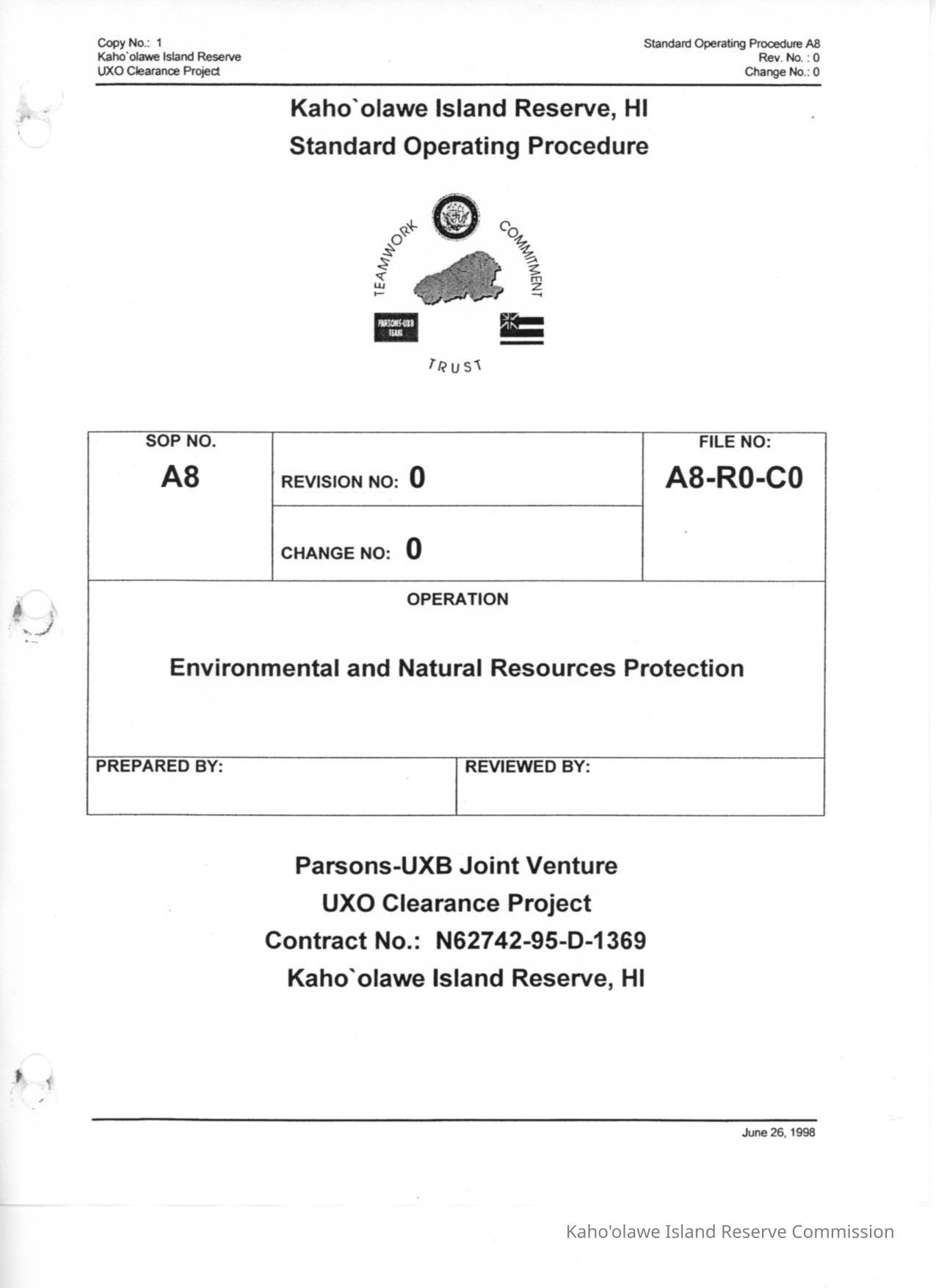 Copy of Kahoolawe Island Reserve, HI, Standard Operating Procedure, SOP No. A8, File No. A8-R0-C0, Environmental and Natural Resources Protection.Creator