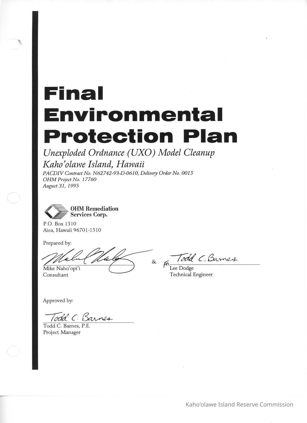 Final Environmental Protection Plan, Unexploded Ordnance (UXO) Model Cleanup, Kahoolawe Island, Hawaii,Creator