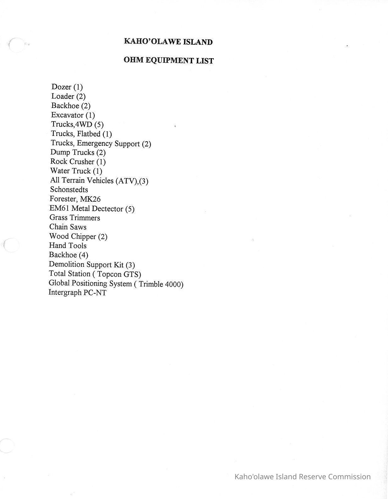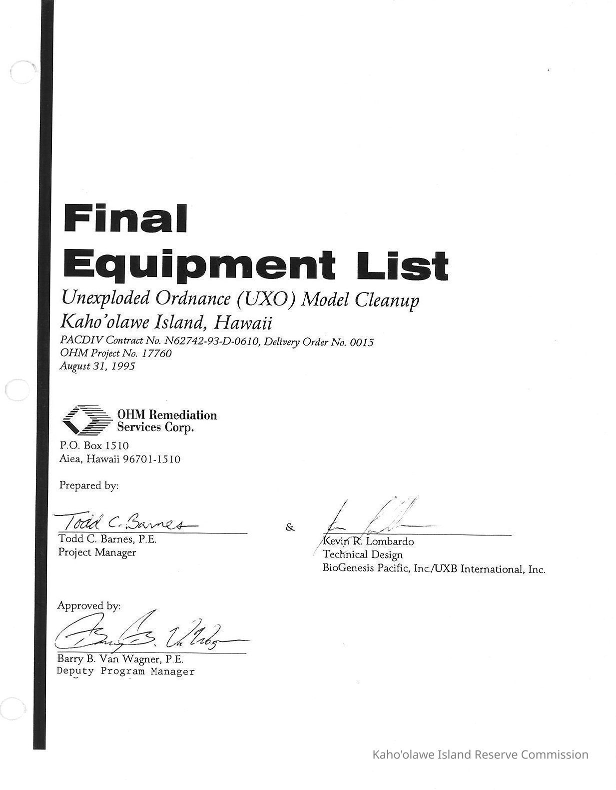 Final Equipment List, Unexploded Ordnance (UXO) Model Cleanup, Kahoolawe, Island, HawaiiCreator