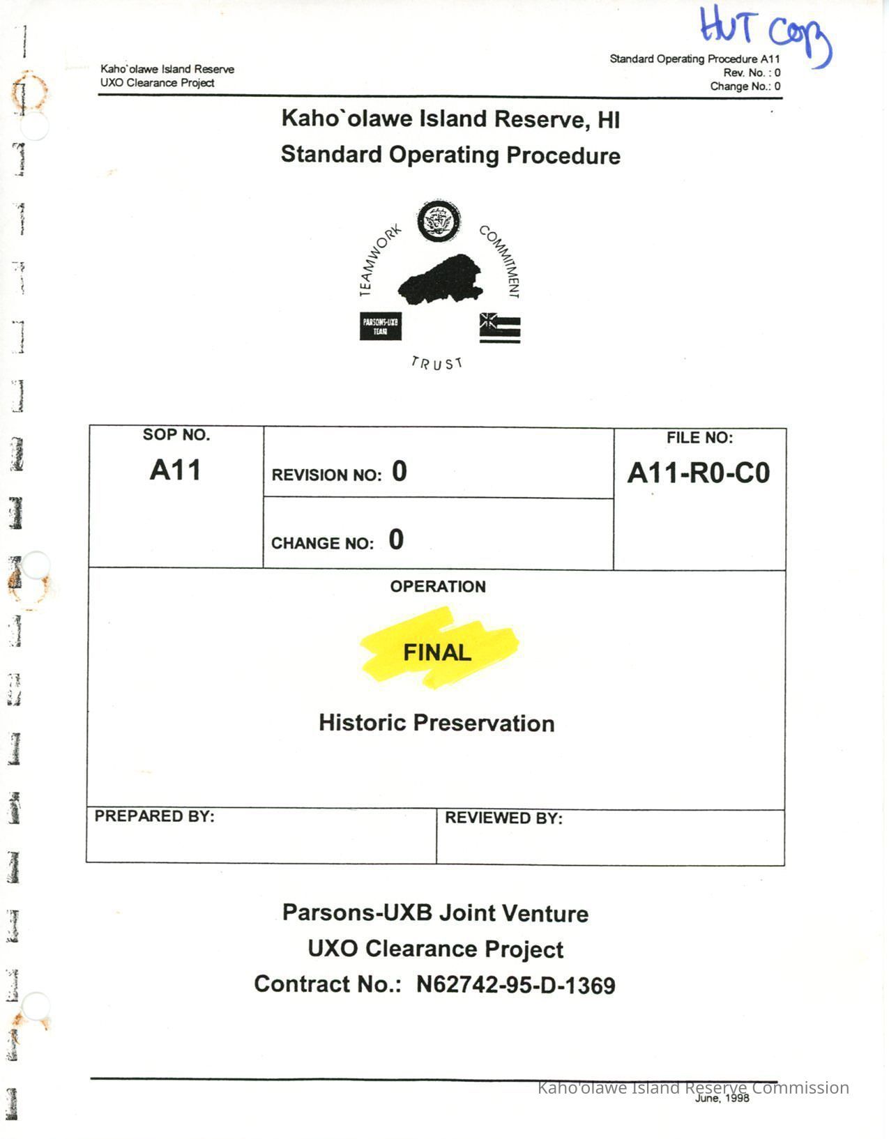 Copy of Kahoolawe Island Reserve, HI, Standard Operating Procedure, Final Historic Preservation, Parsons-UXB Joint Venture, UXO Clearance Project, Contract No.: N62742-95-D-1369.Creator