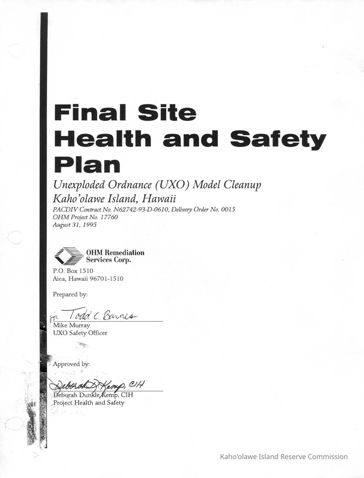 Final Site Health and Safety Plan, Unexploded Ordnance (UXO) Model Cleanup , Kahoolawe Island, Hawaii.Creator