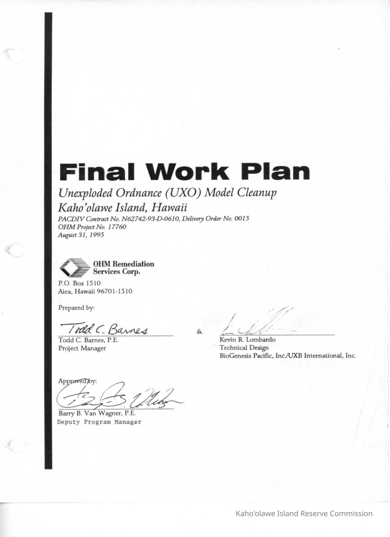 Final Work Plan, Unexploded (UXO) Model Cleanup, Kahoolawe Island, Hawaii. PACDIV Contract No. N62742-93-D-0610, Delivery Order No. 0015, OHM Project NO. 17760.