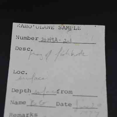 Fragments of a fish hook (made of either bone or shell)--appears to have originally been recovered as one piece based on the artifact slip and its entry in the Sample Collection Record.Collection