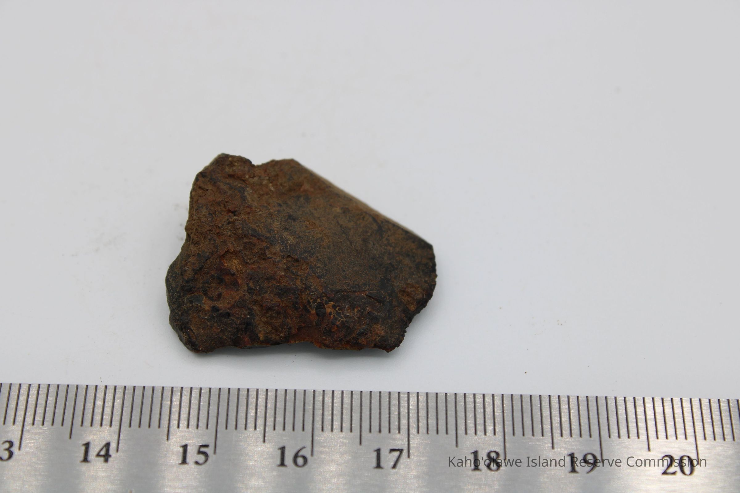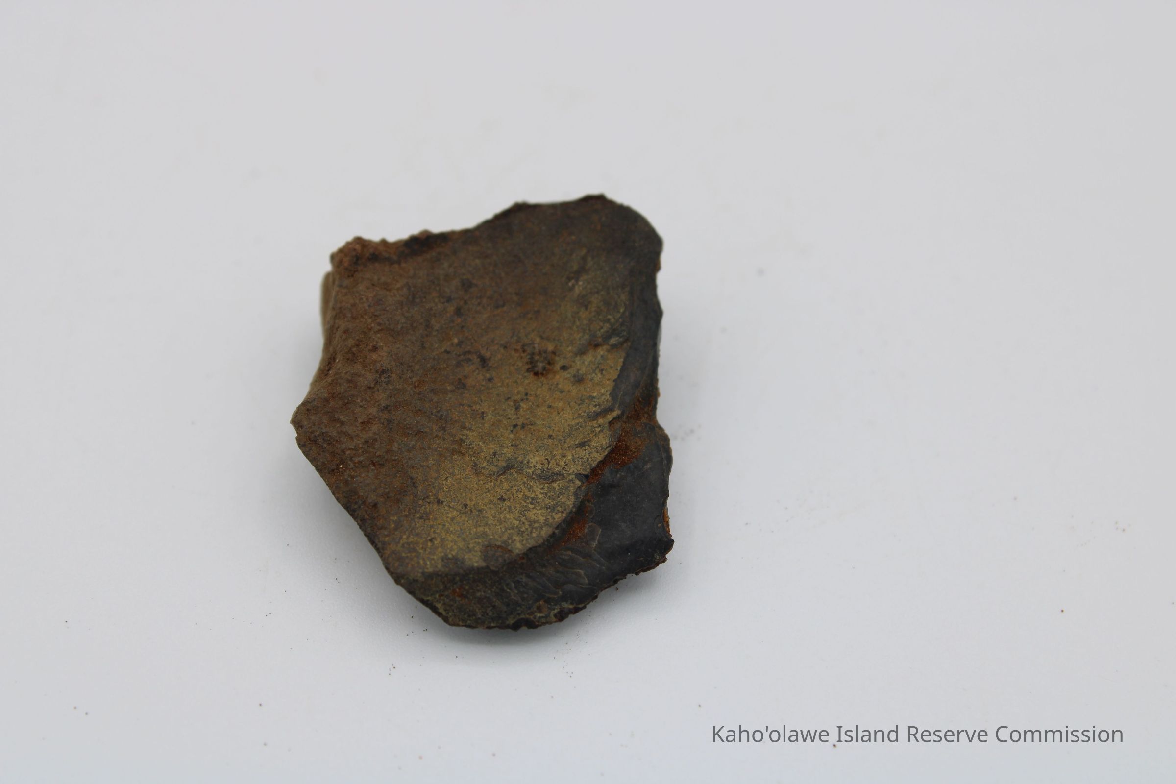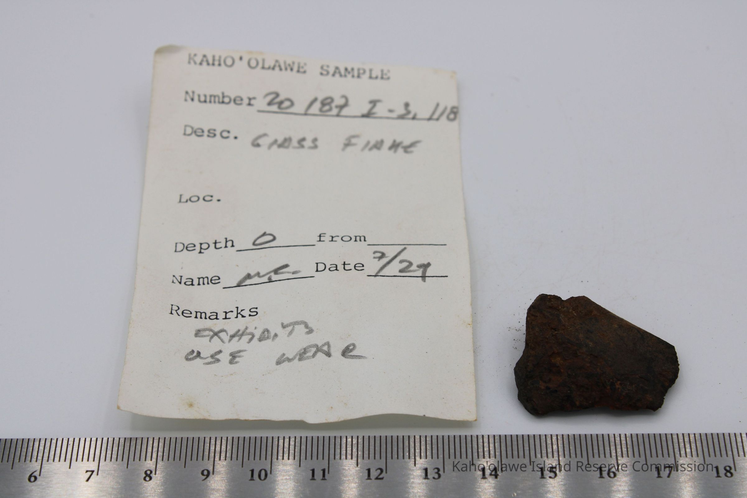 Irregularly-shaped flake of basaltic glass with concaved side. Artifact slip notes "exhibits use wear."Collection