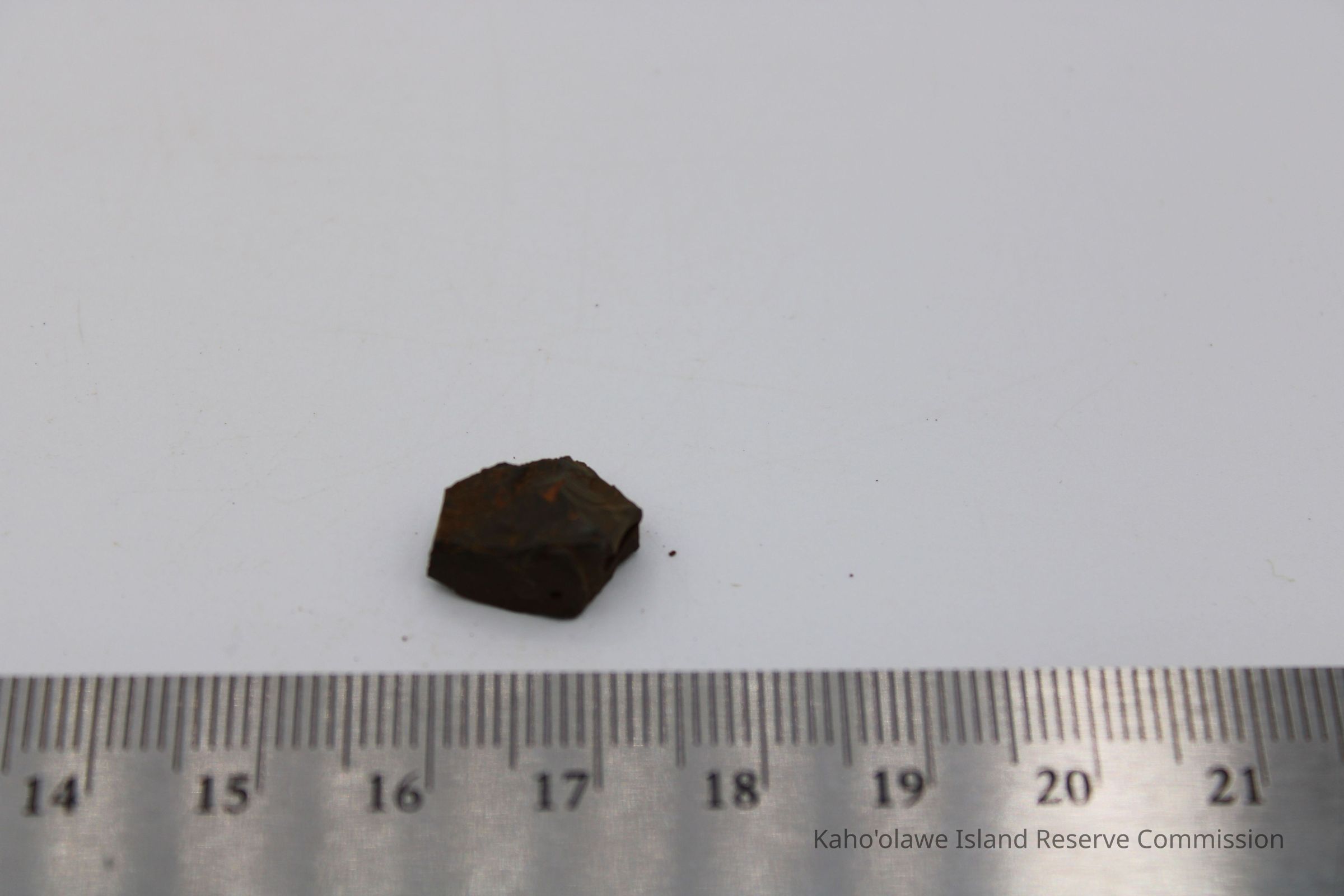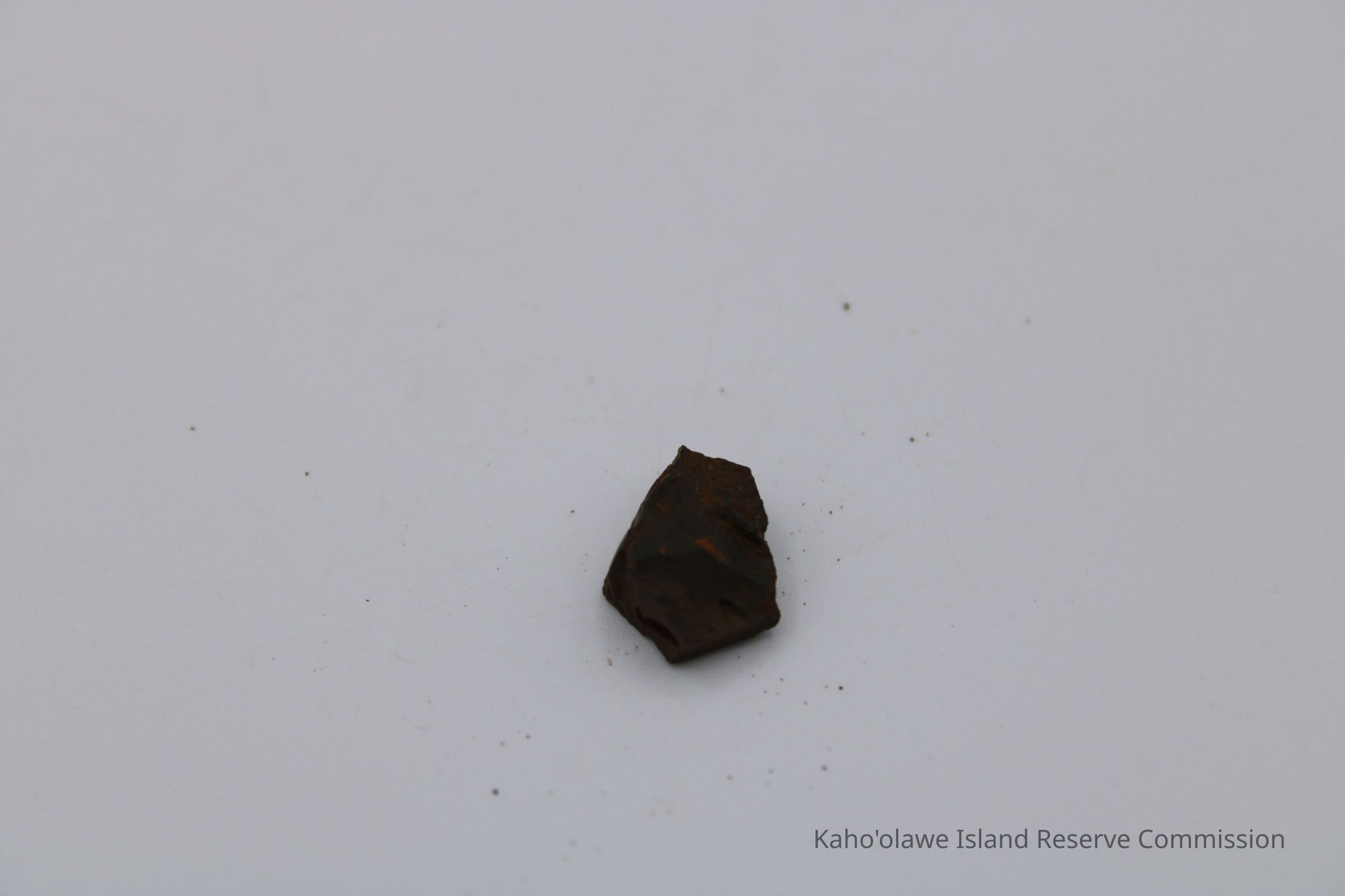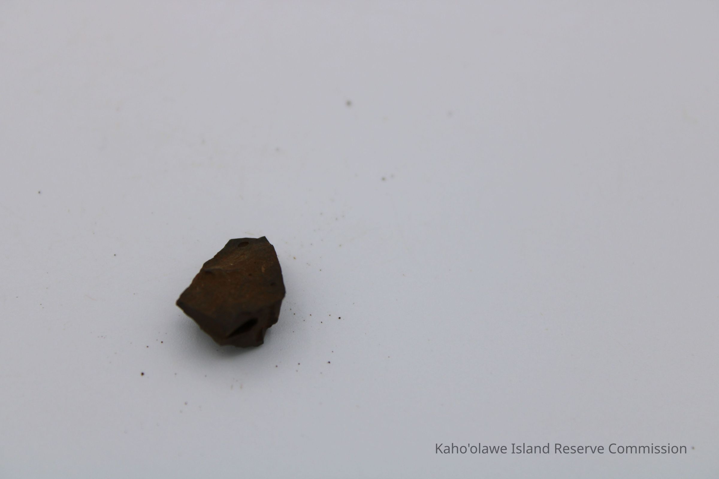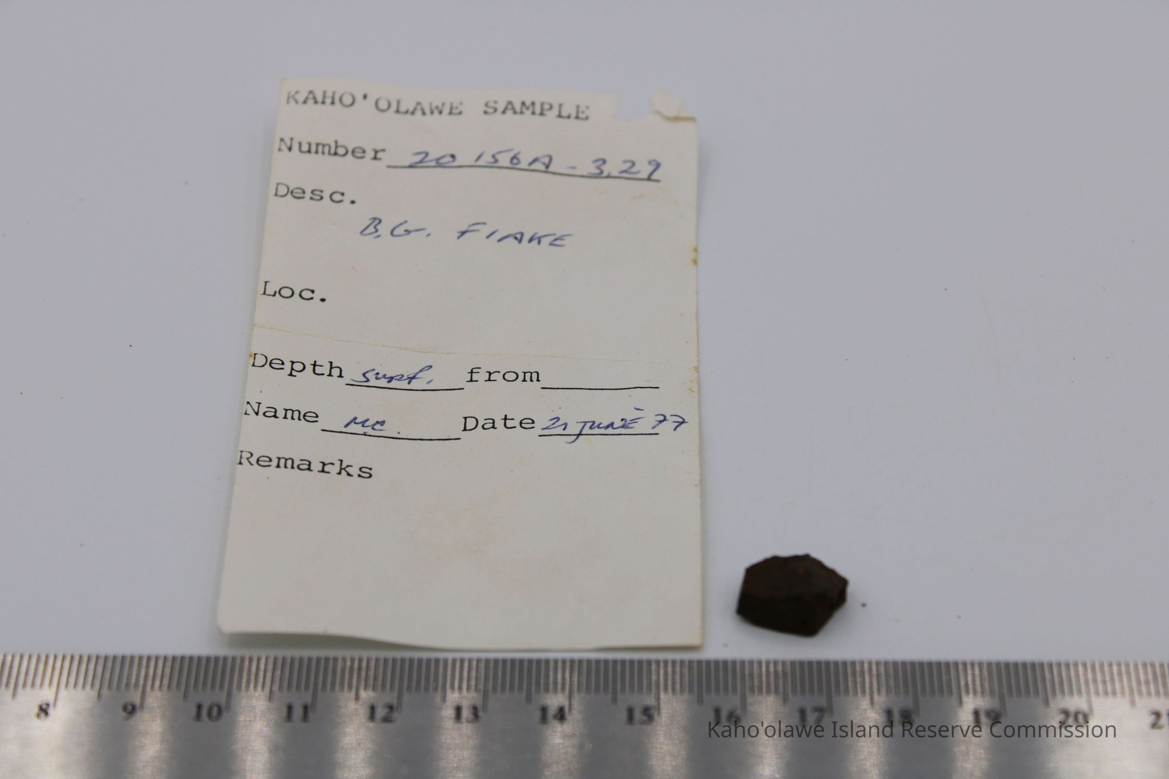 Small, irregularly-shaped flake of basaltic glass; collected at 3:40 pm with soil temperature of 26 degree C per Sample Collection Record, [Hawai'i] State Historic Preservation Office.Collection