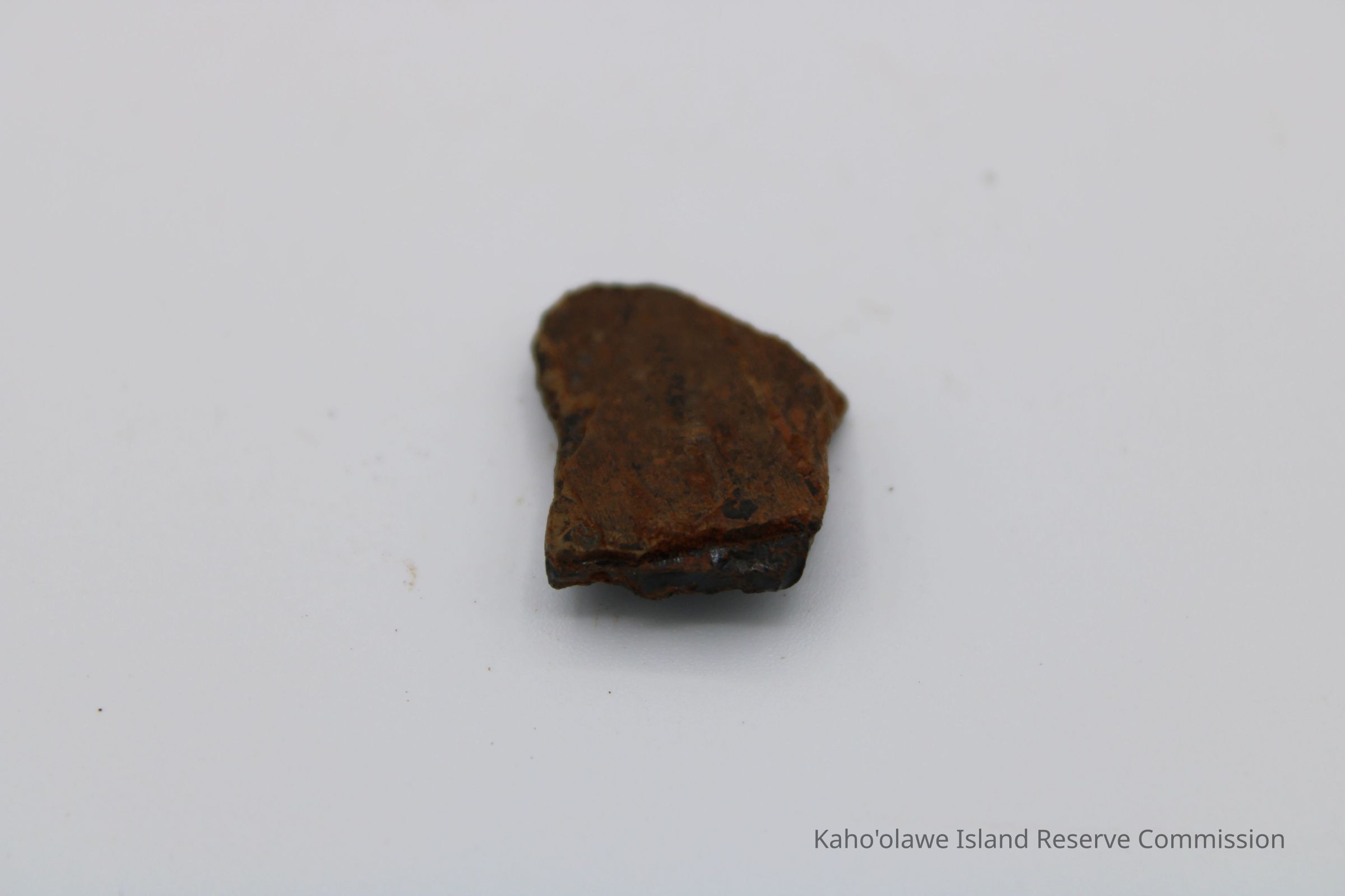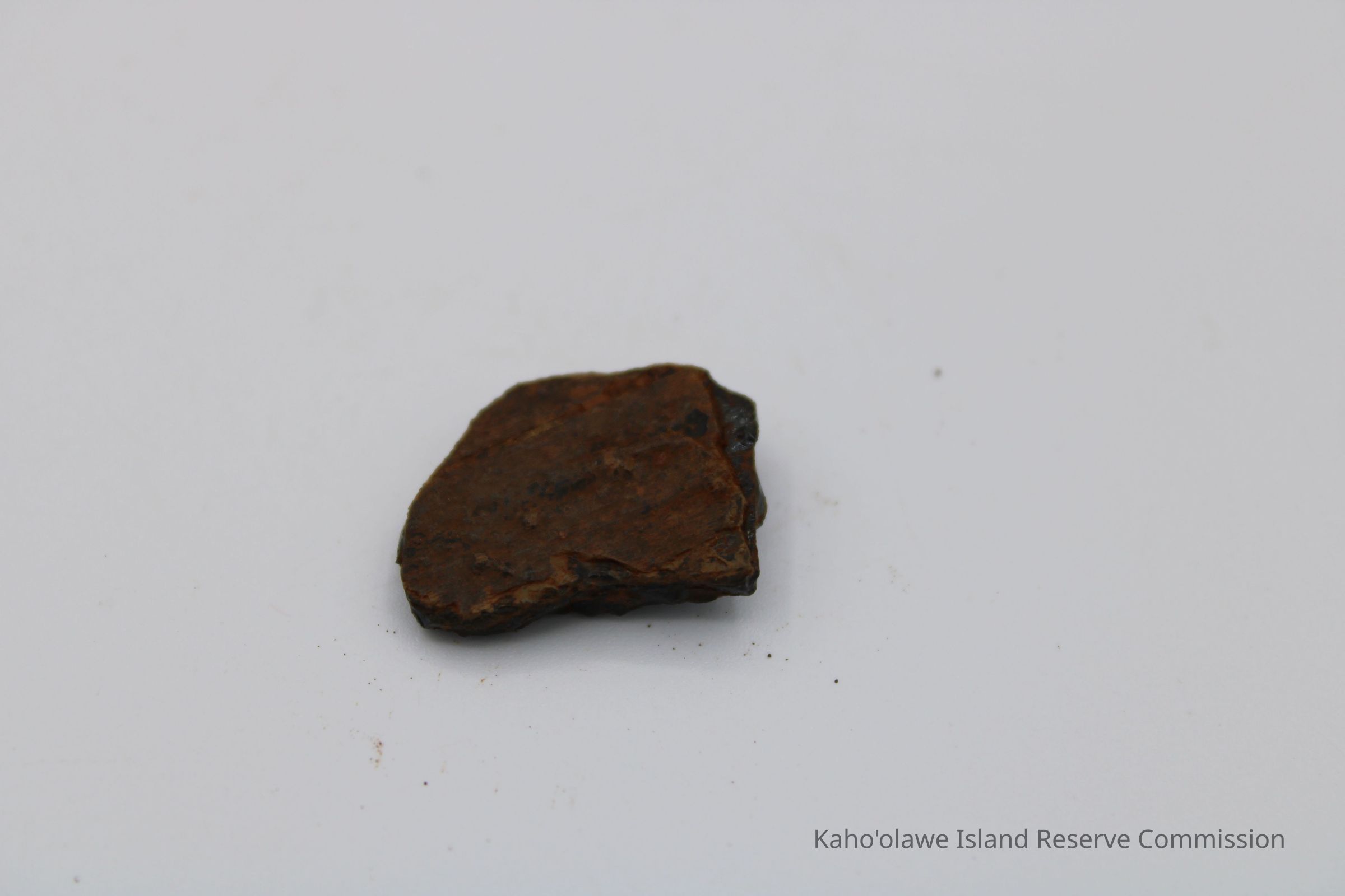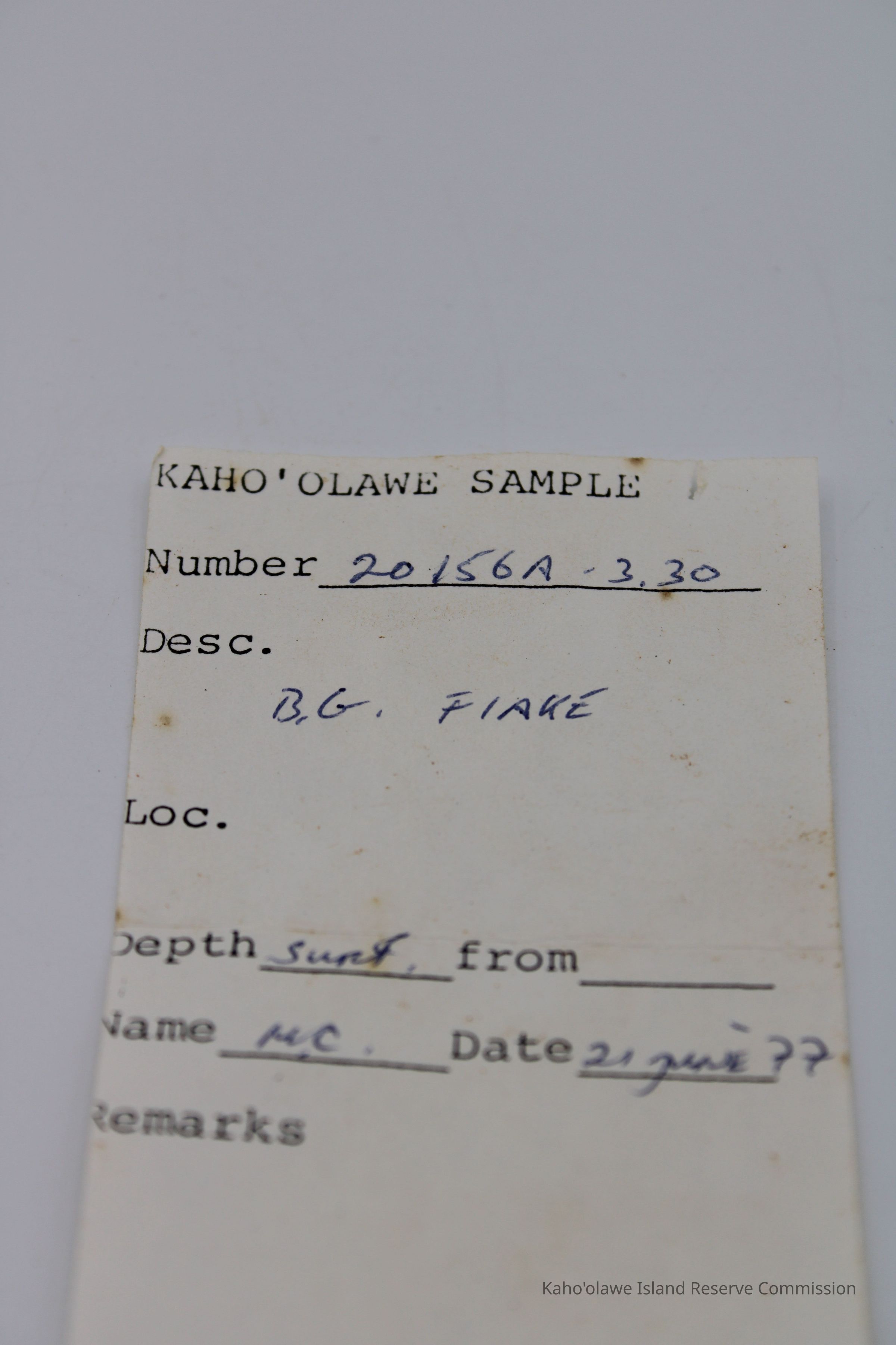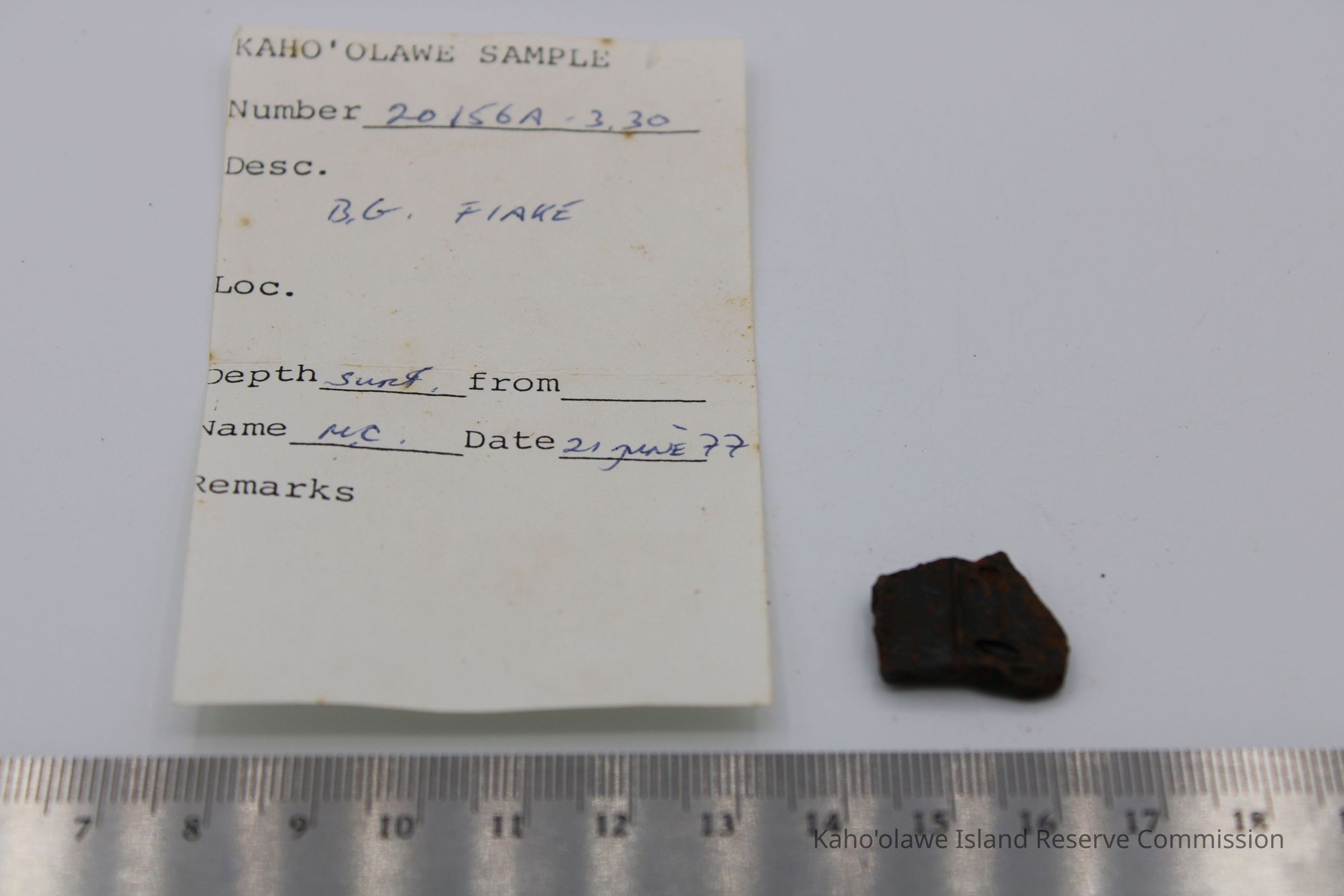 Small, irregularly shaped flake of basaltic glass; collected at 3:40 pm with soil temperature of 27 degrees C per Sample Collection Record, [Hawaiʻi] State Historic Preservation Office.Collection
