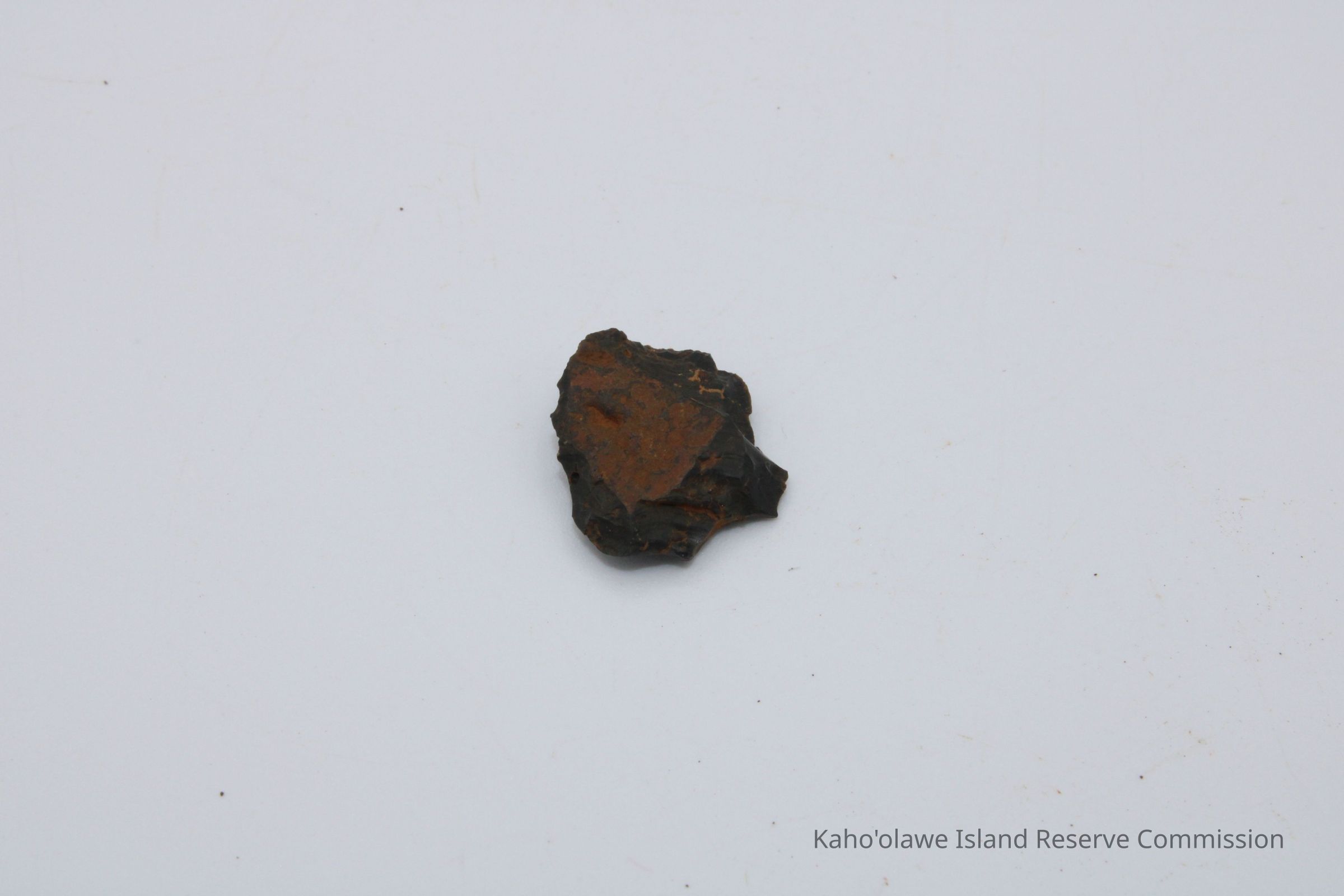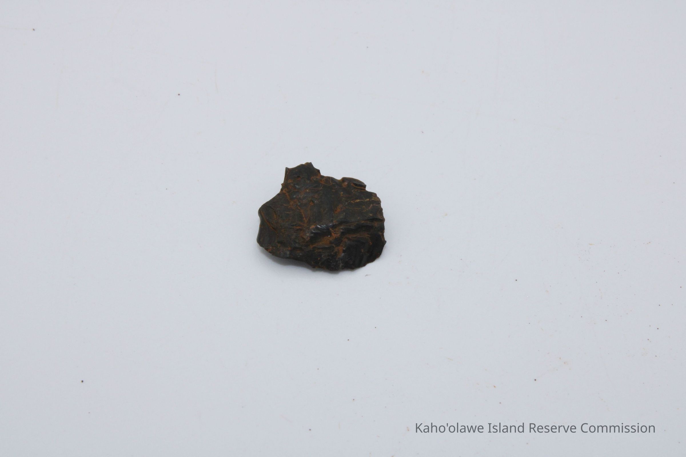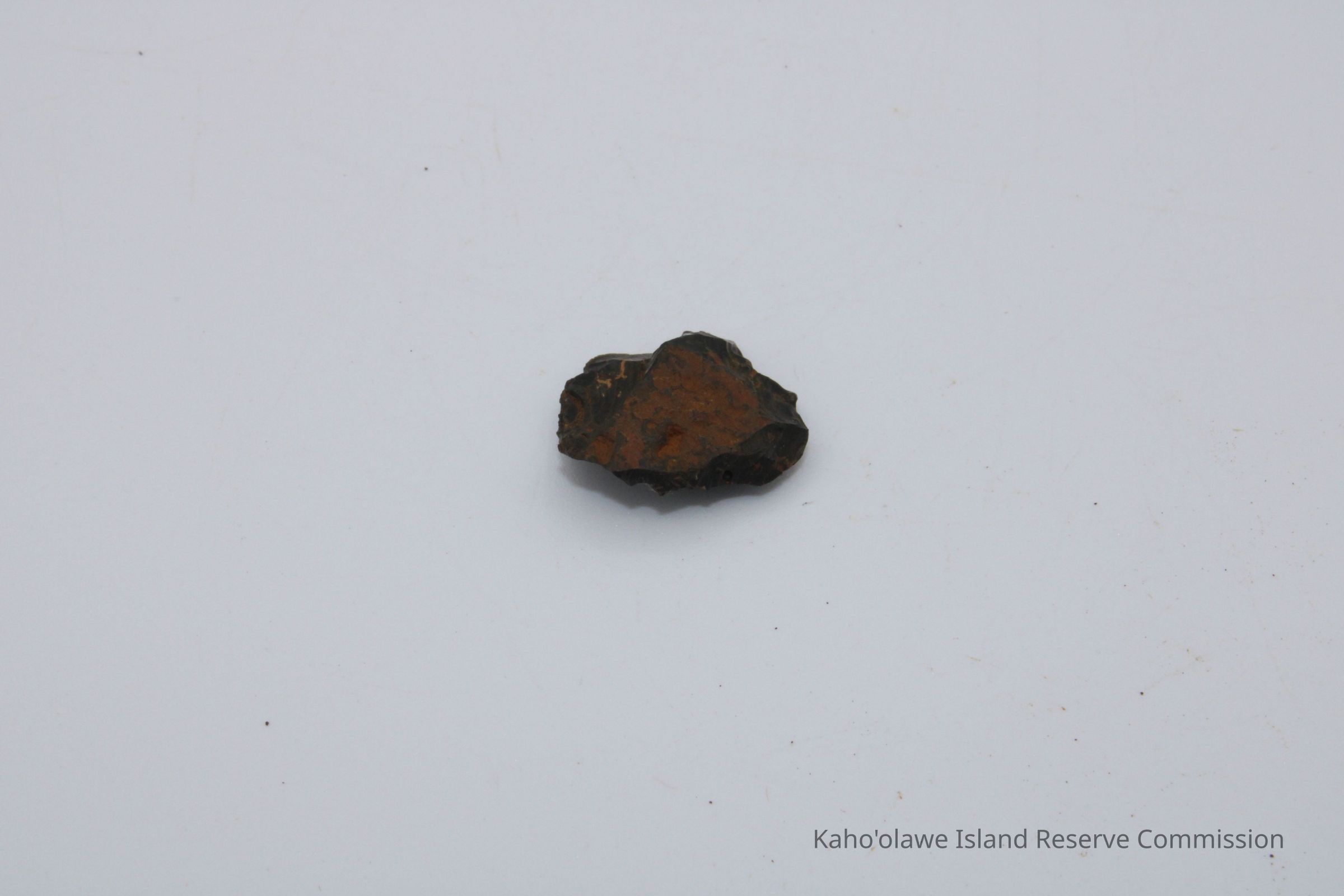 Tiny circular shaped flake of basaltic glass; appears to have been worked on both sides with sharp edges. Collected at 3:40 pm with soil temperature C per Sample Collection Record, [Hawai'i] State Historic Preservation Office.Collection