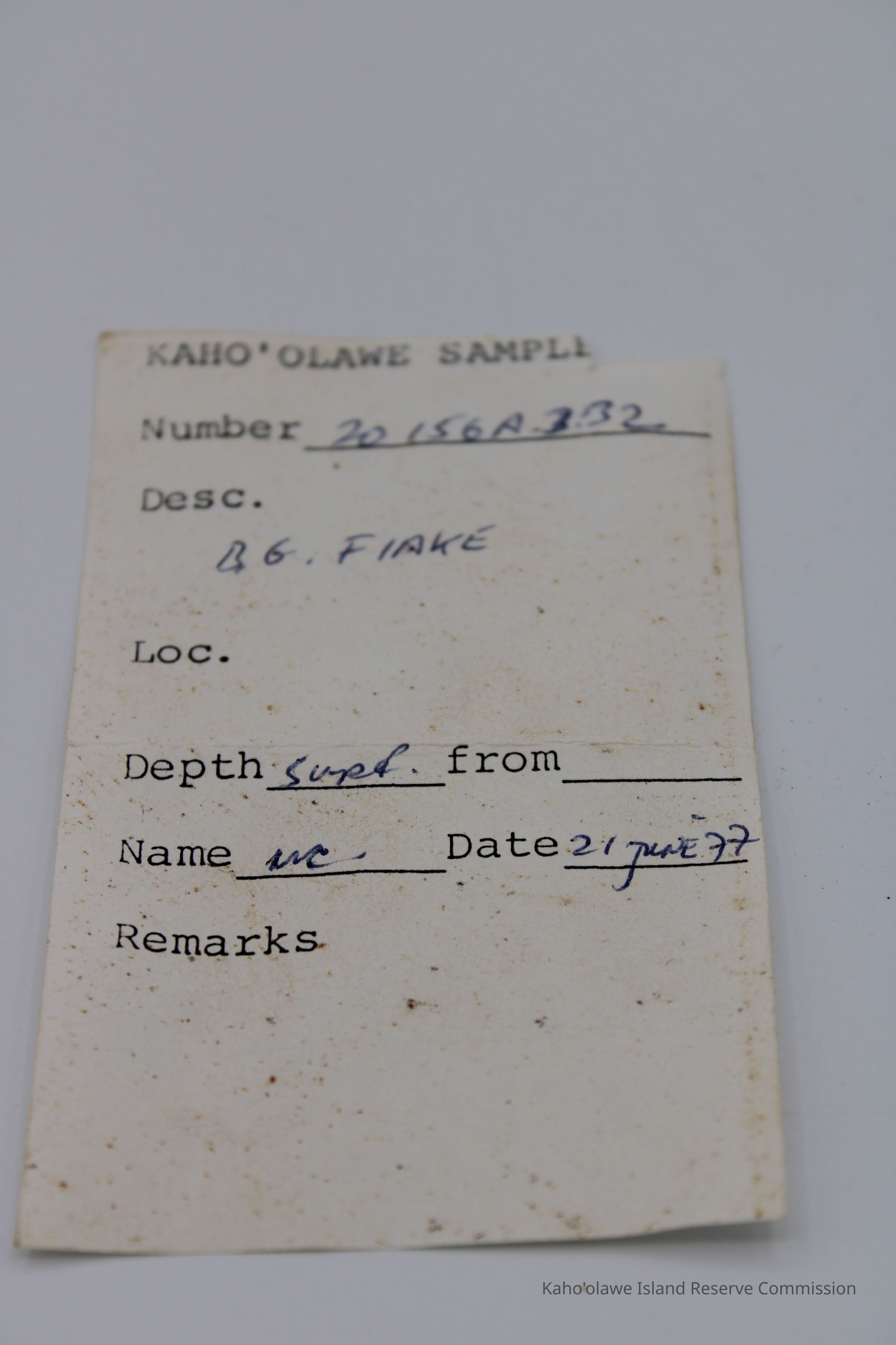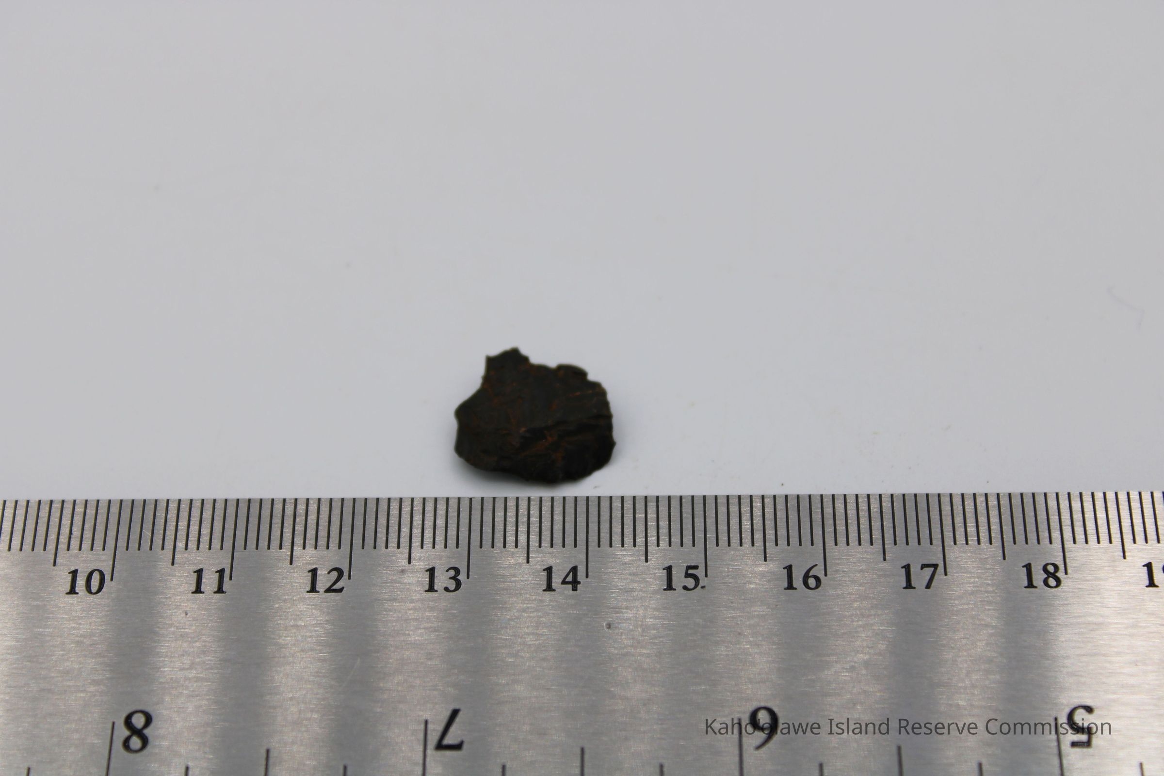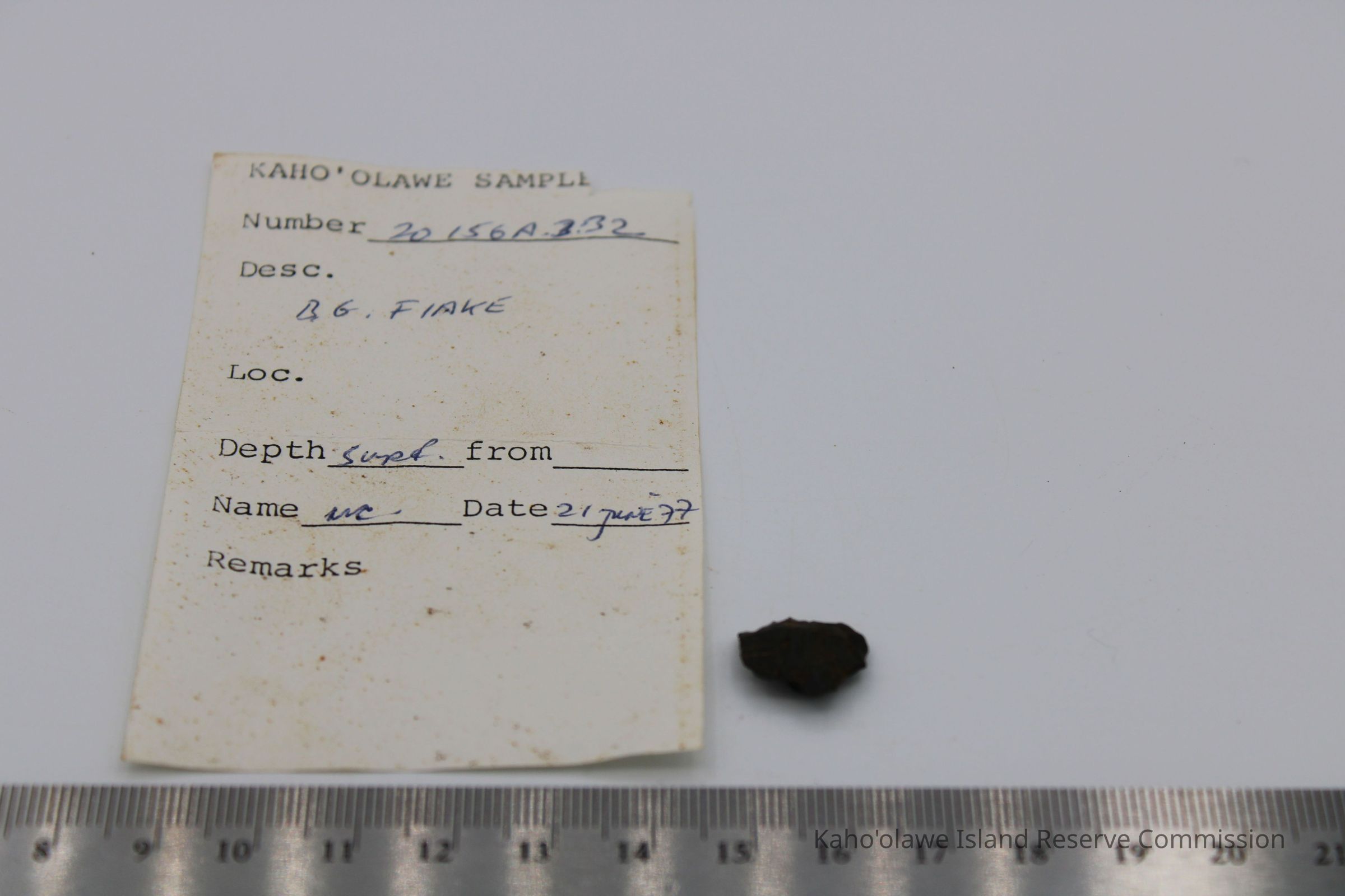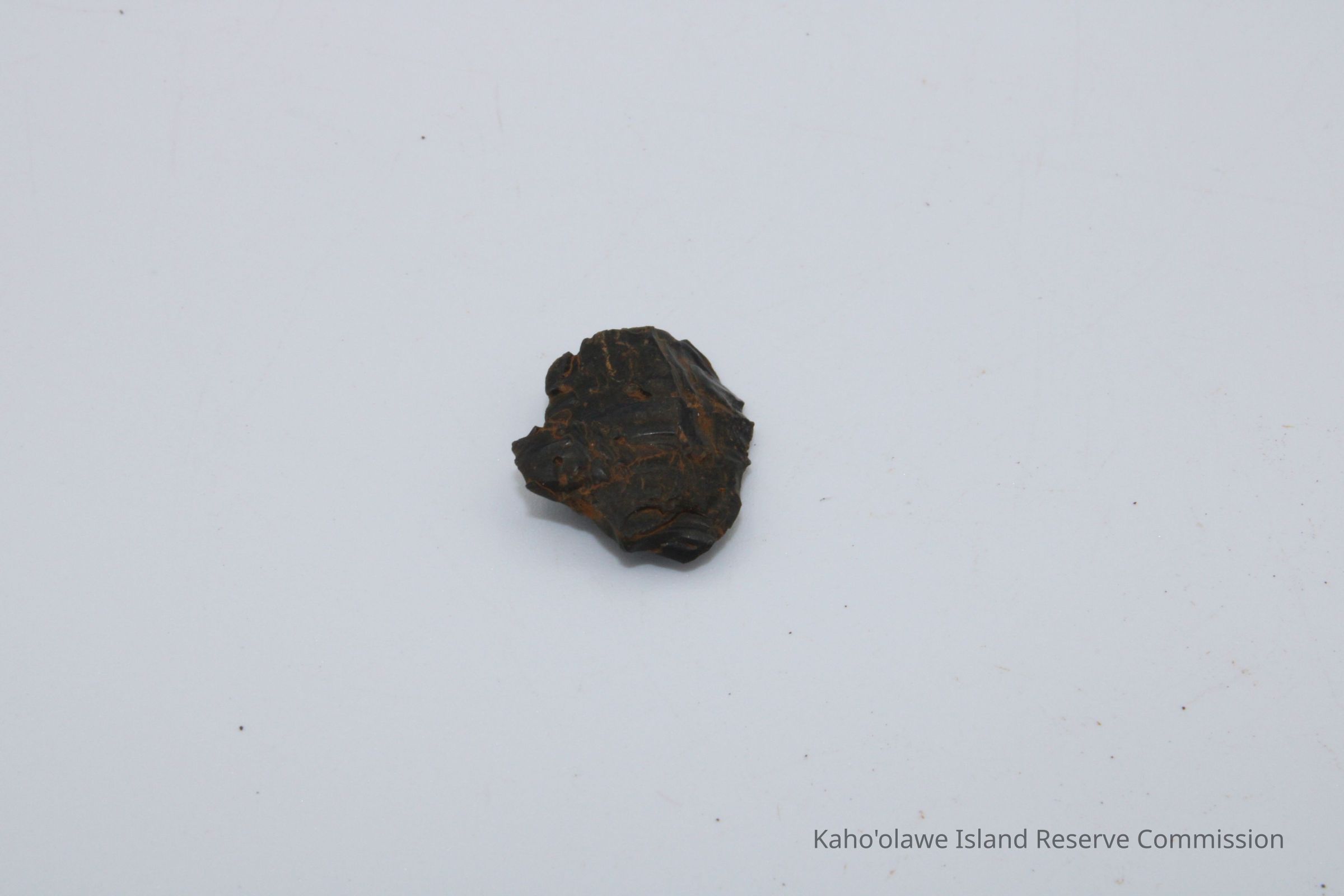 Tiny circular shaped flake of basaltic glass; appears to have been worked on both sides with sharp edges. Collected at 3:40 pm with soil temperature C per Sample Collection Record, [Hawai'i] State Historic Preservation Office.Collection