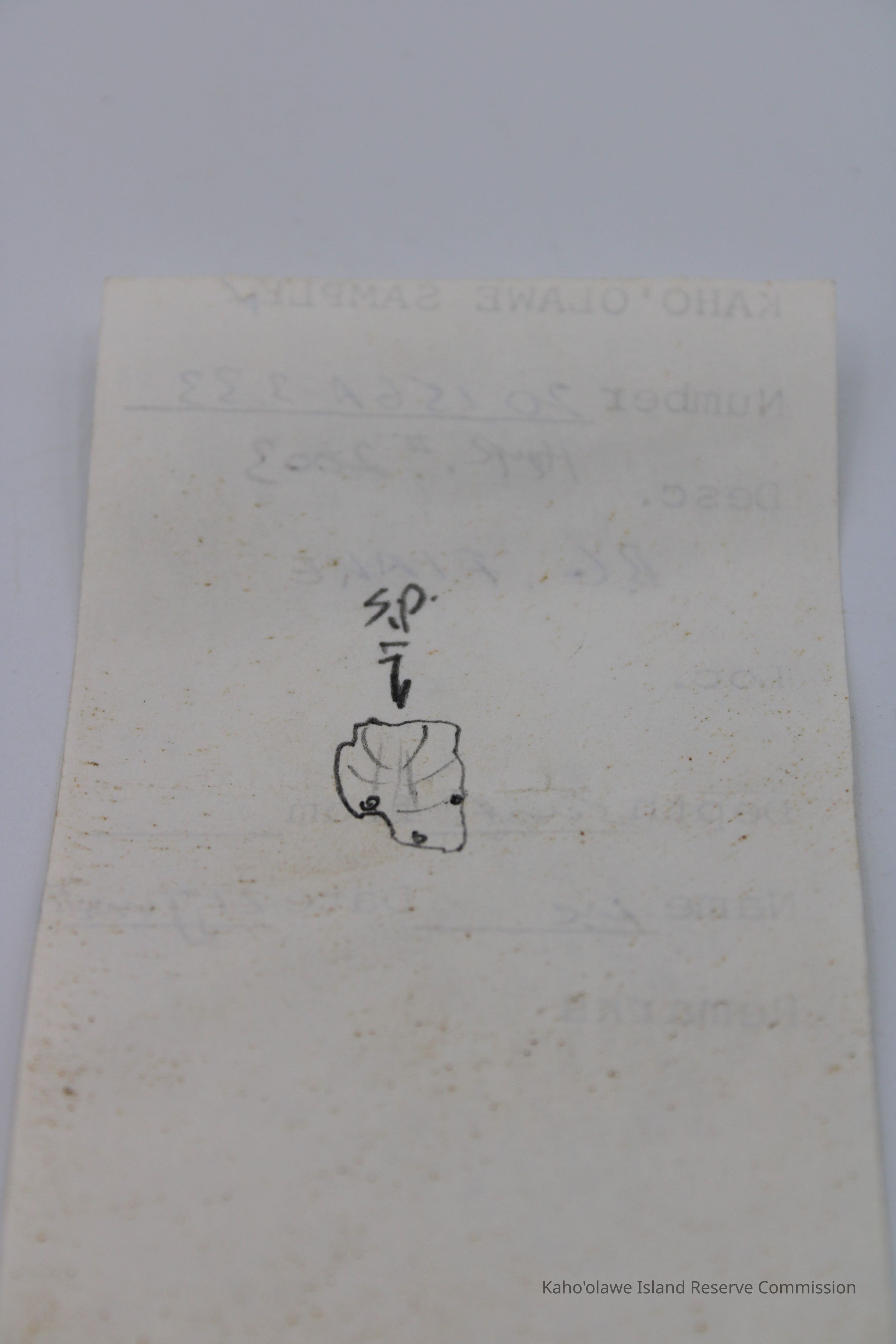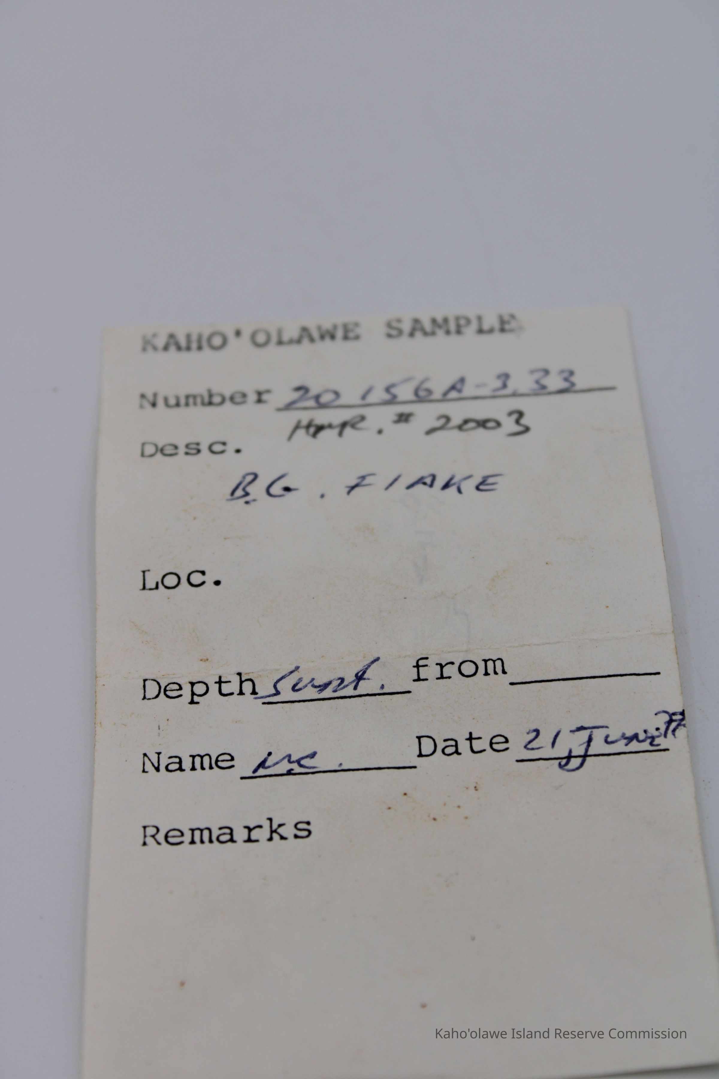 Basaltic glass flake; collected at 3:40 pm with soil temperature of 27 degrees C. Only the bag & slip present per Sample Collection Record, [Hawai'i] State Historic Preservation Office.Collection