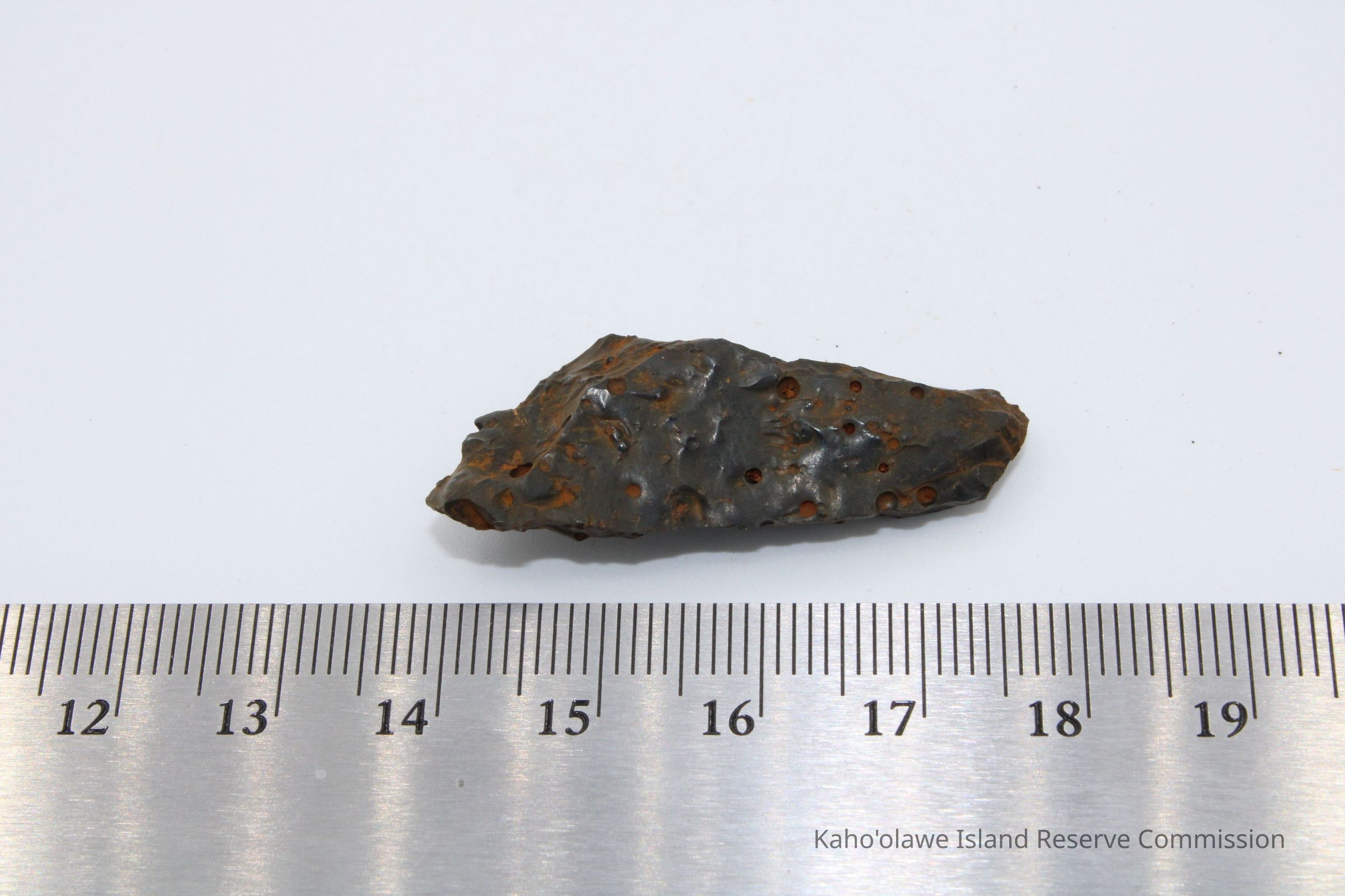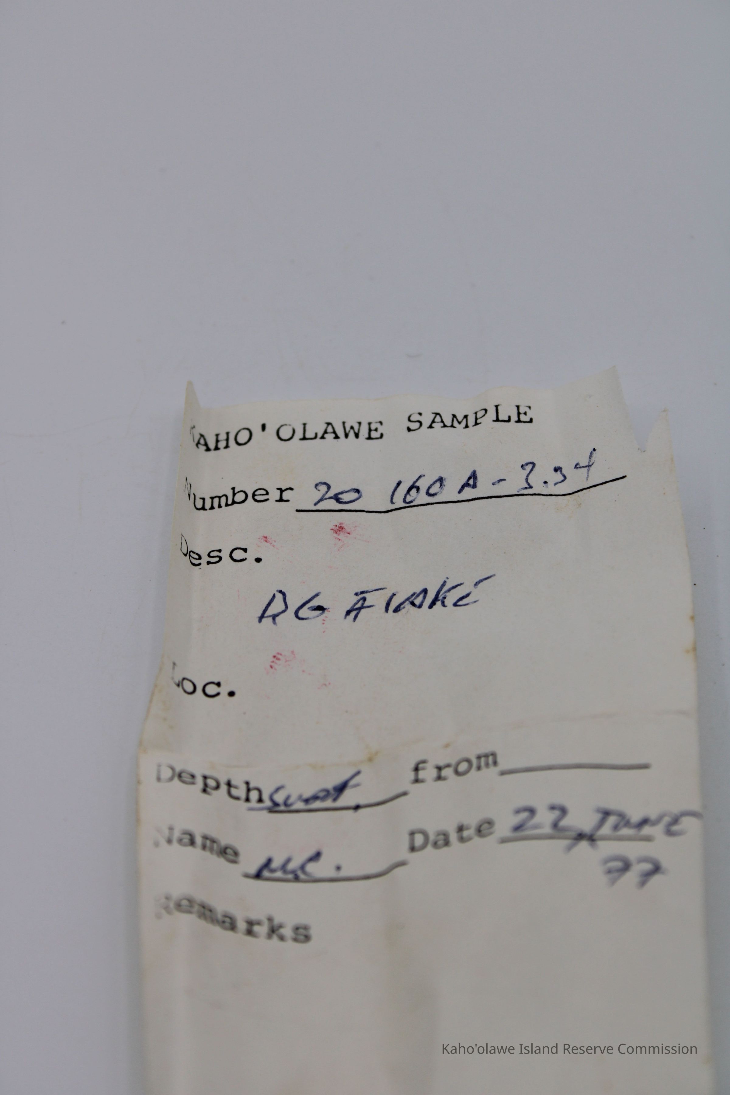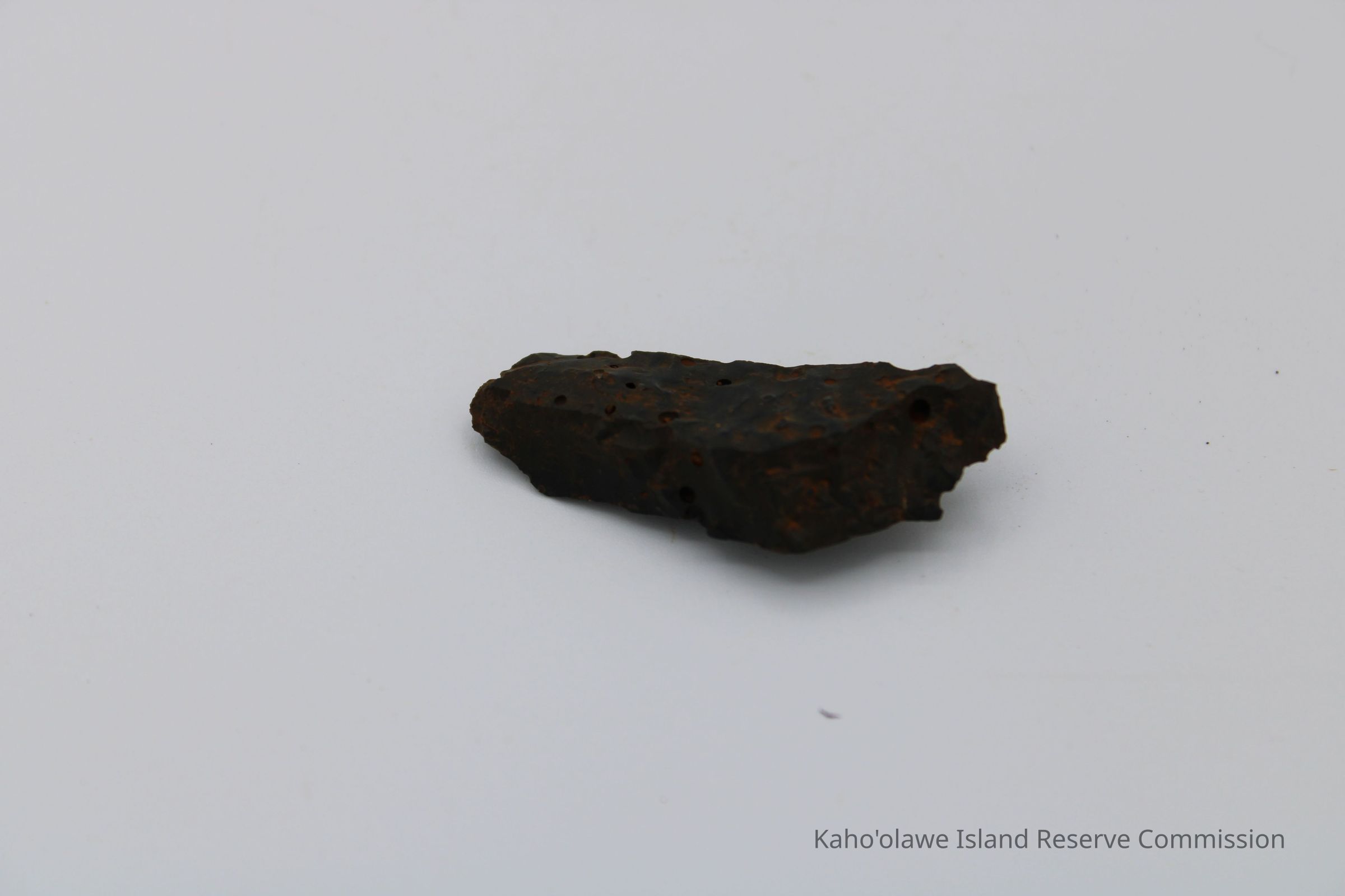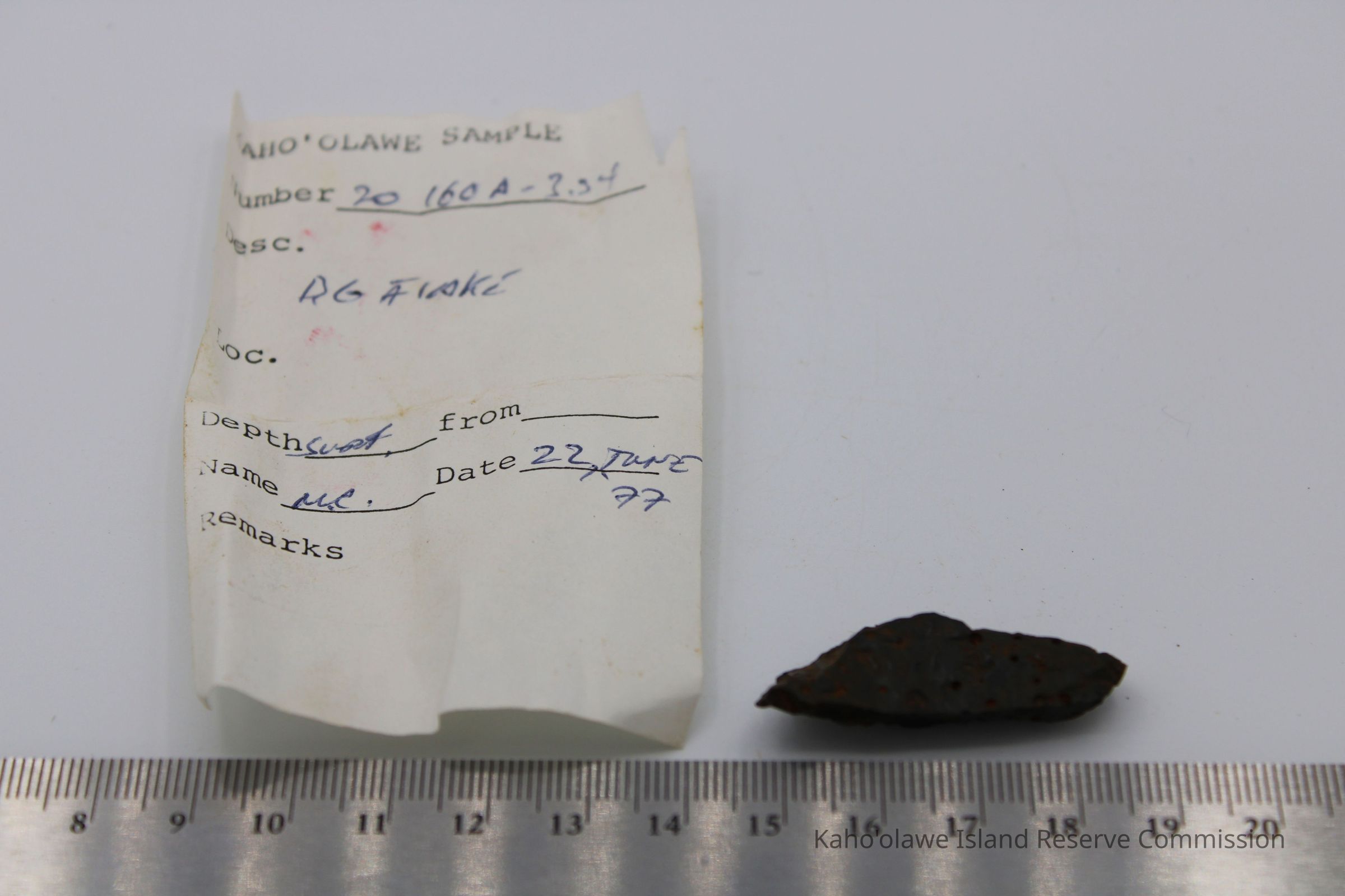 Flake of basaltic glass, roughly in the shape of a scalene triangle with jagged edges. Collected at 4:30 pm with unknown soil temperature per Sample Collection Record, [Hawai'i] State Historic Preservation Office.Collection