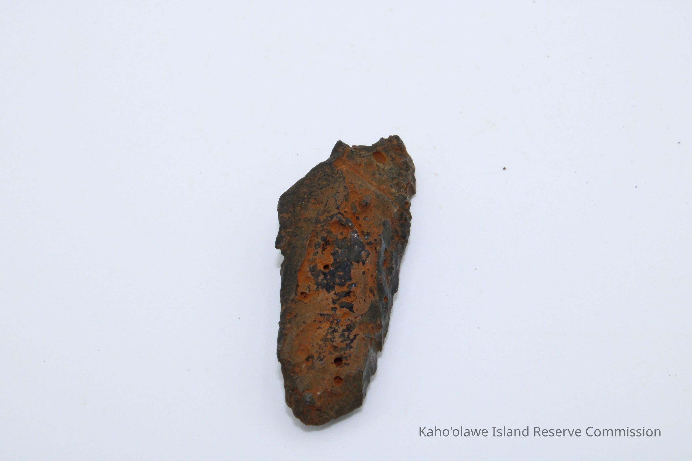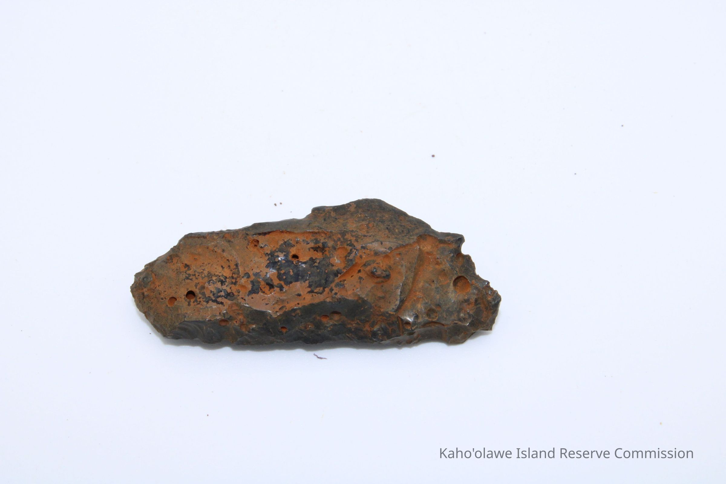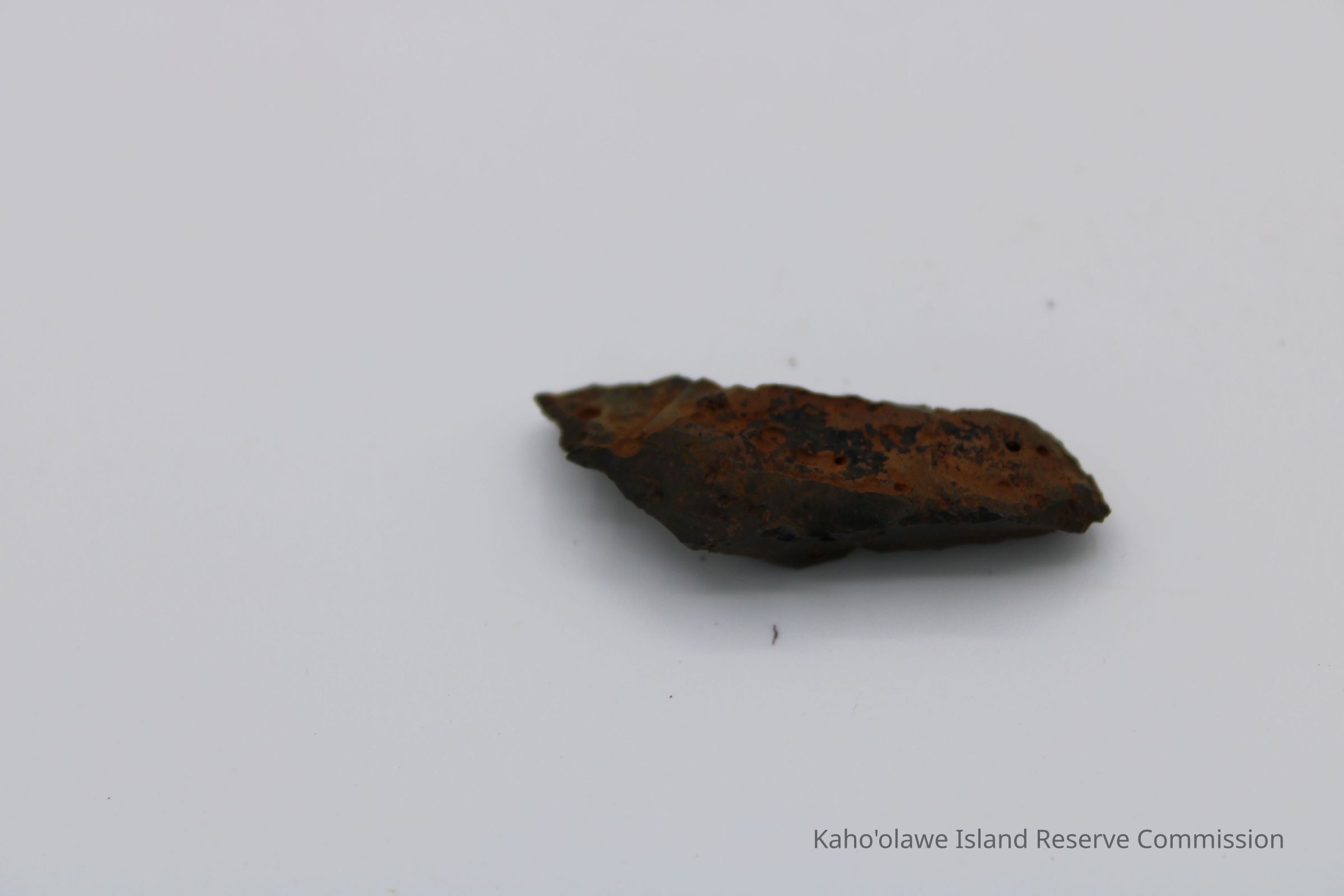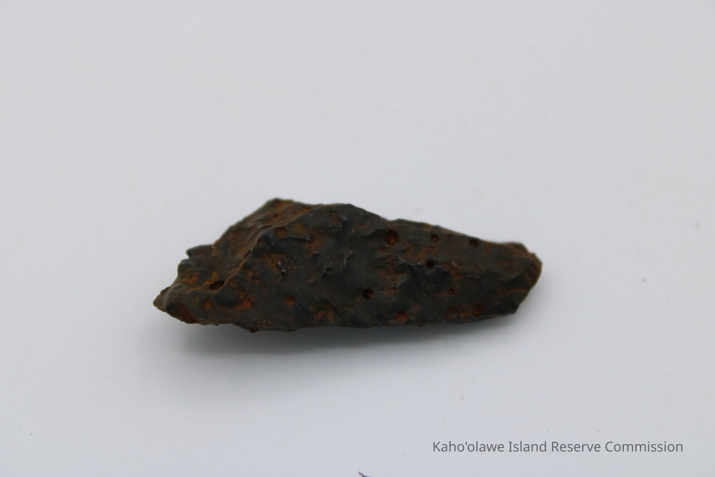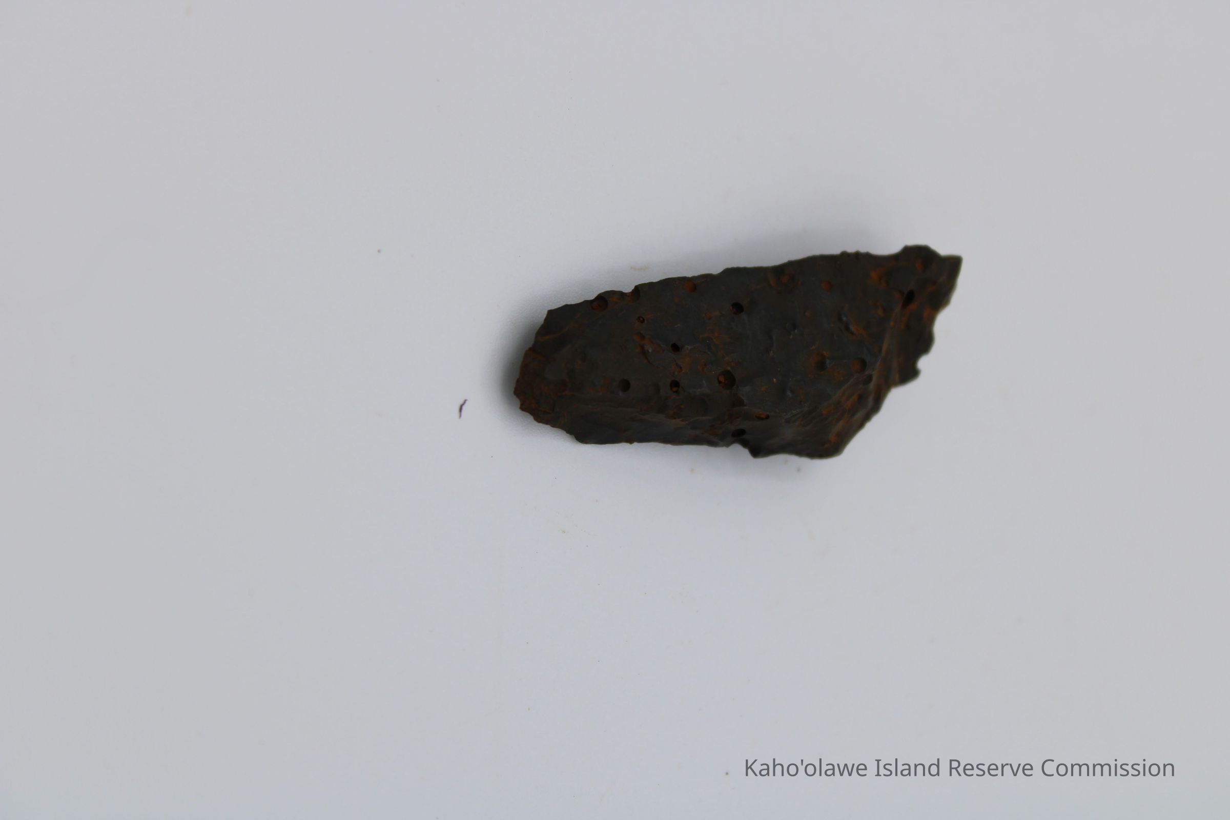 Flake of basaltic glass, roughly in the shape of a scalene triangle with jagged edges. Collected at 4:30 pm with unknown soil temperature per Sample Collection Record, [Hawai'i] State Historic Preservation Office.Collection