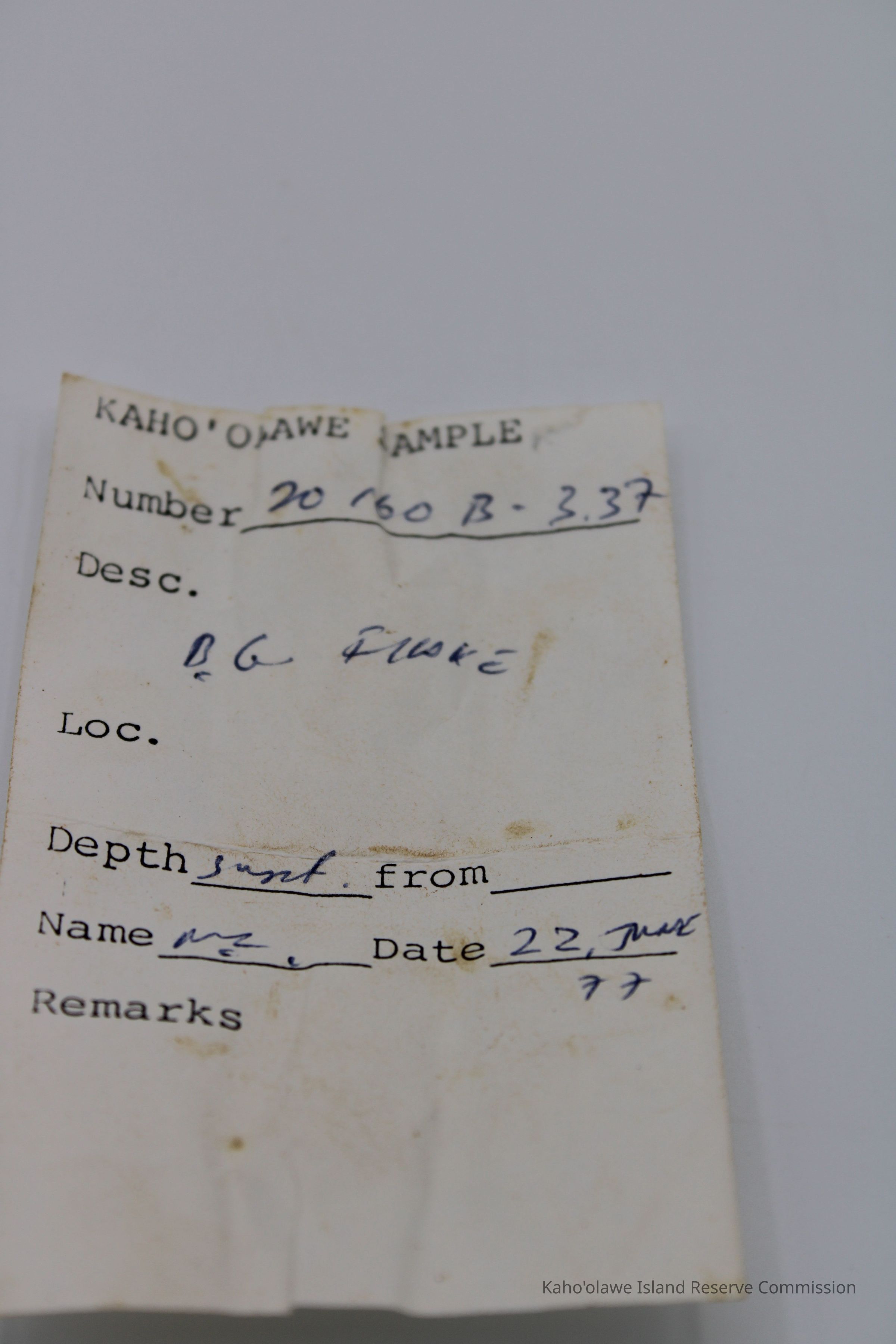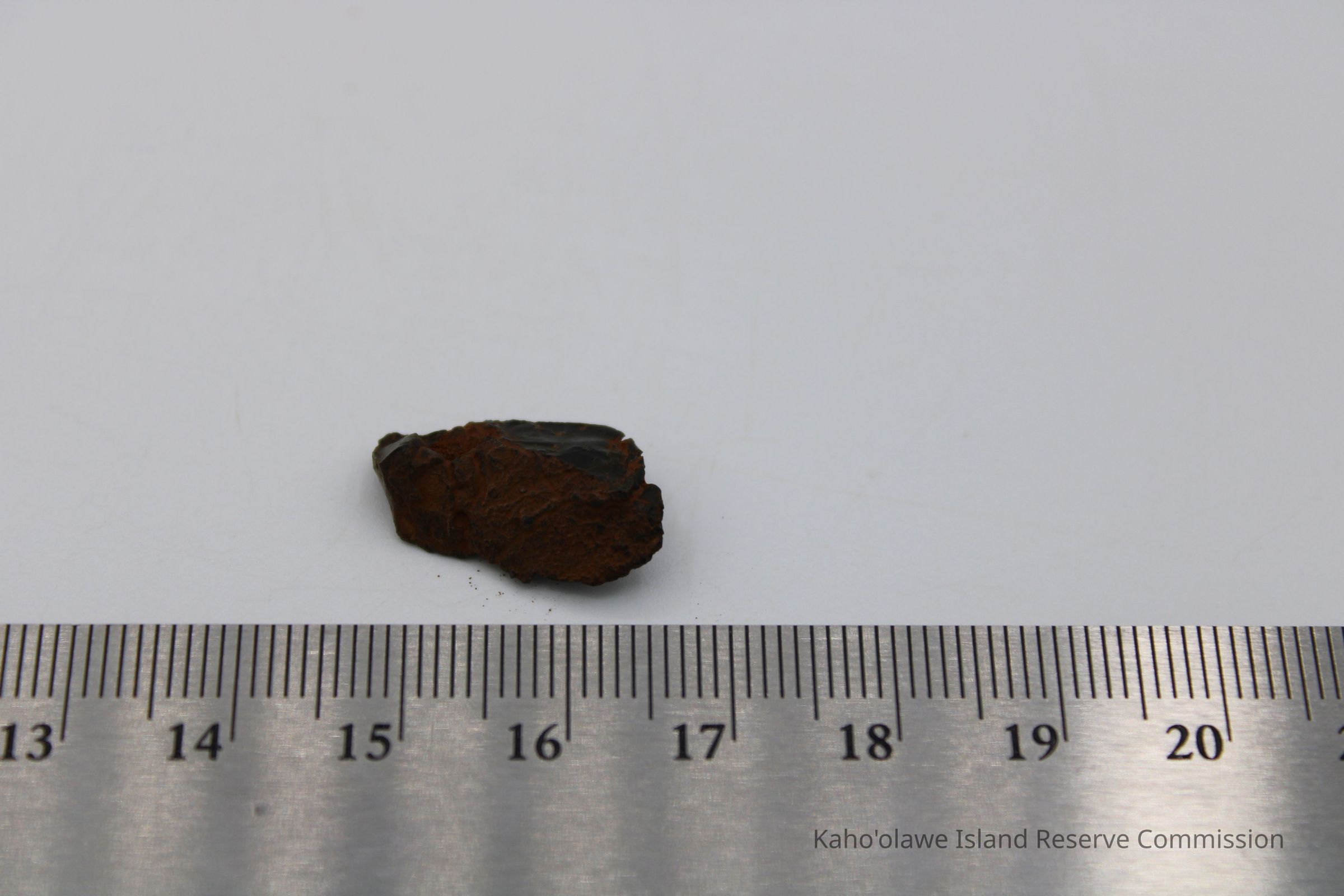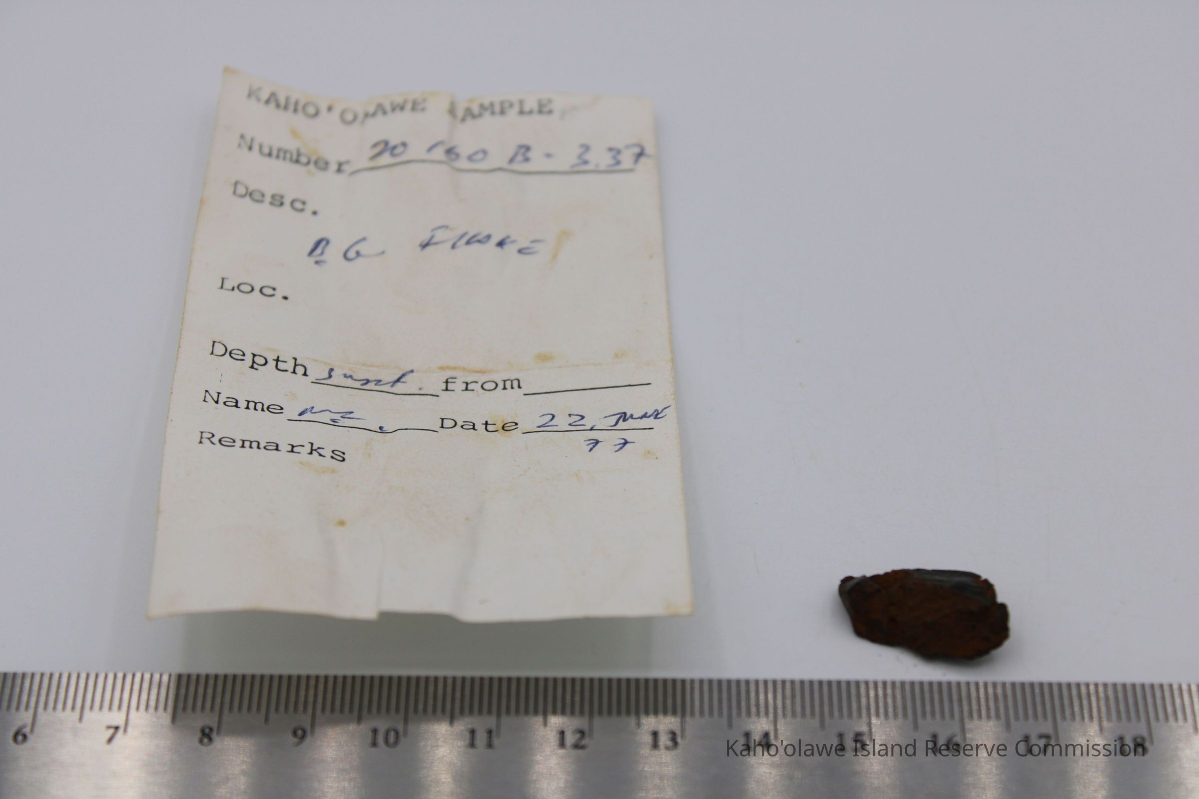 Small, irregularly shaped flake of basaltic glass; collected at 4:30 pm with unknown soil temperature per Sample Collection Record, [Hawai'i] State Historic Preservation Office.Collection