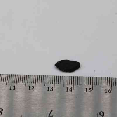 The image shows a labeled card beside a small black flake, with a ruler measuring its size.