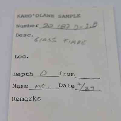 The image shows a labeled sample form with a glass flake artifact beside it, accompanied by a ruler for scale measurement.