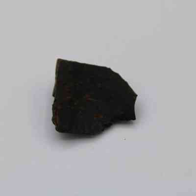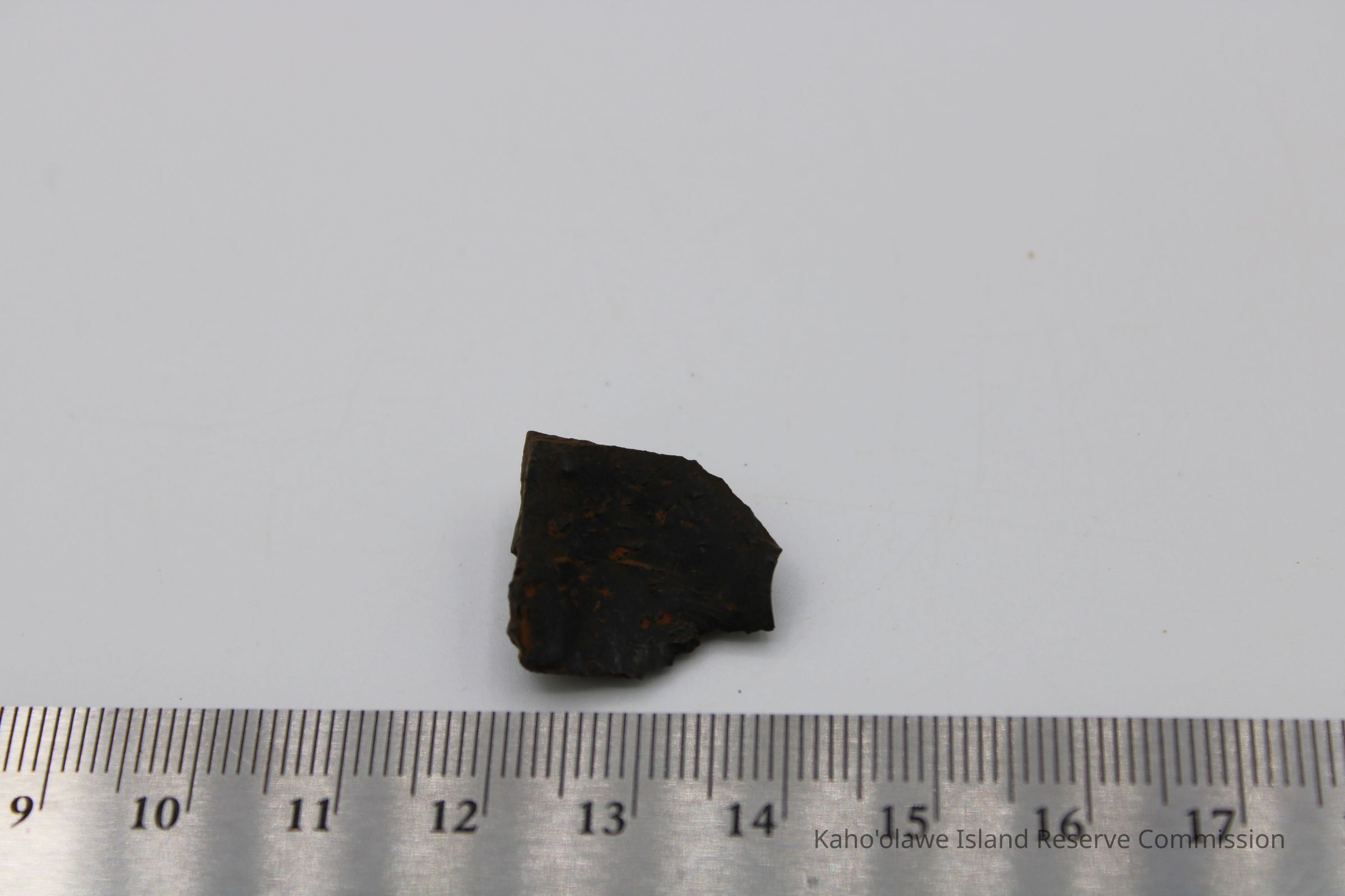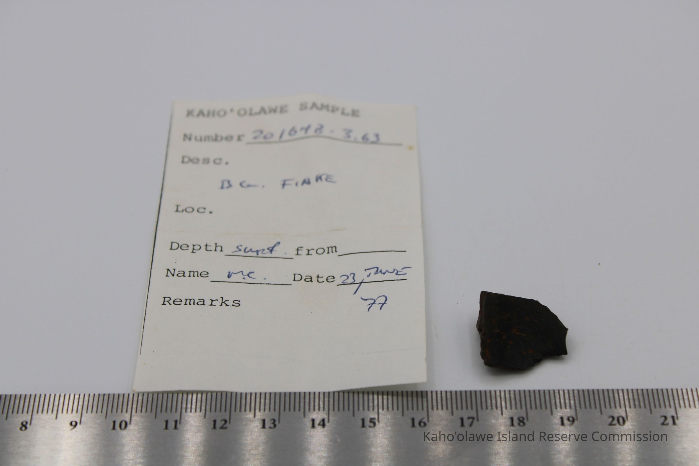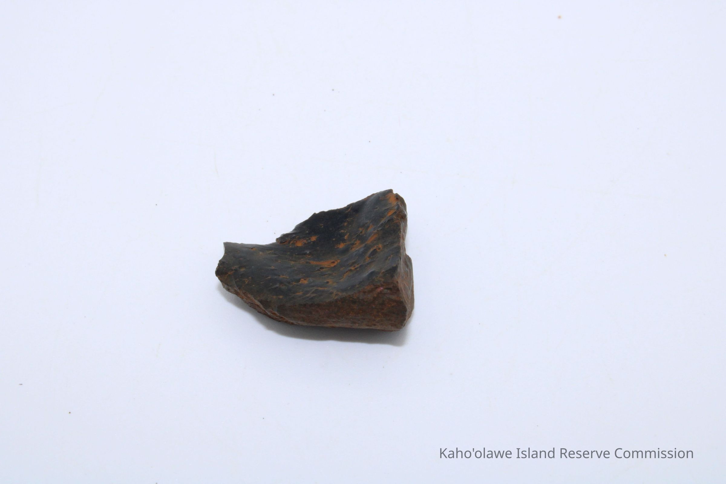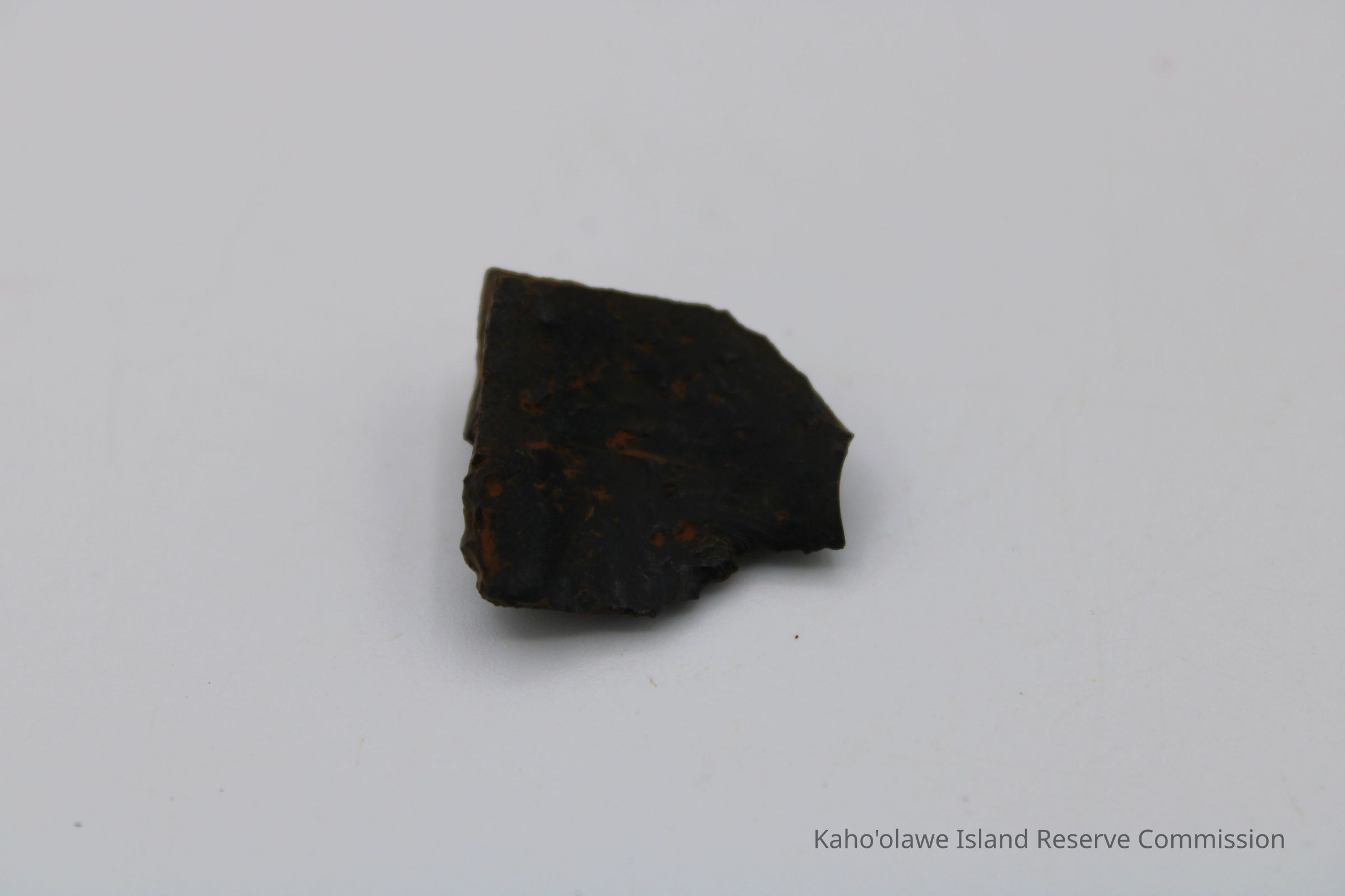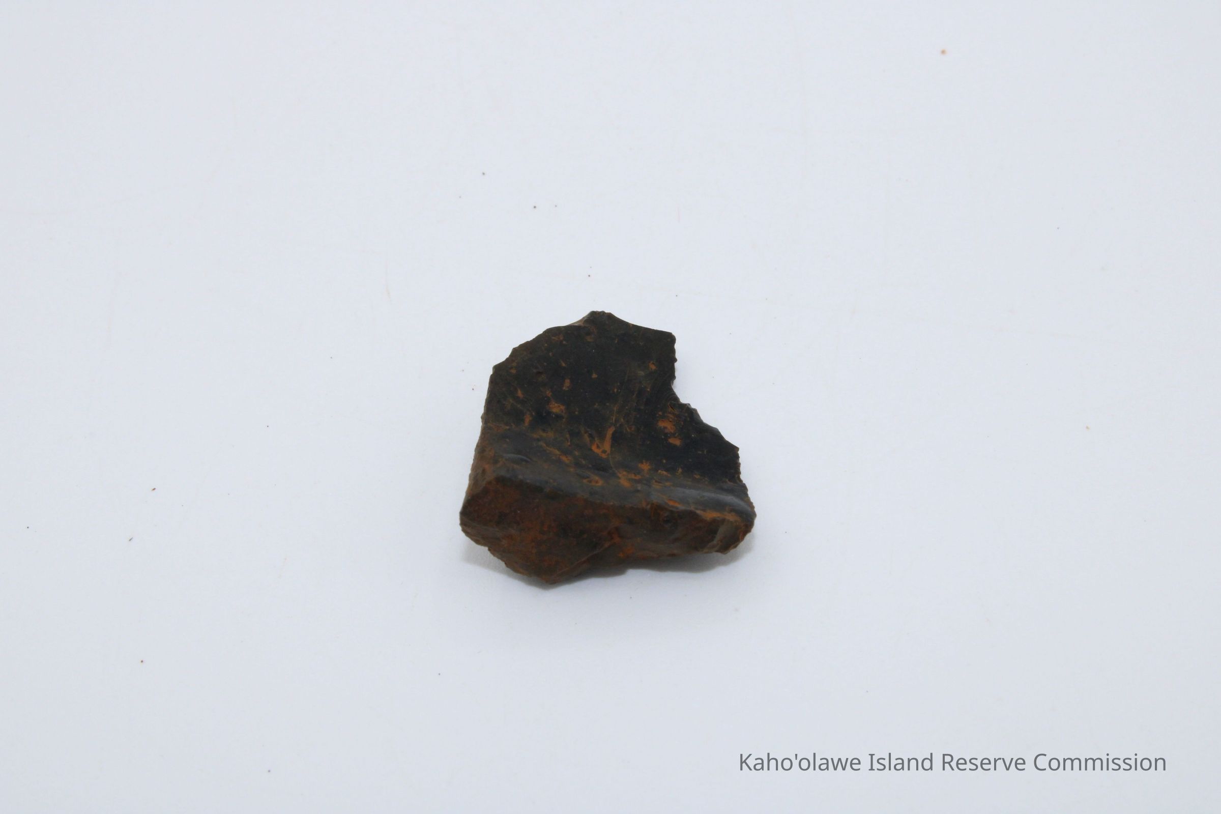 Small, semi-triangular flake of basaltic glass with one shiny black side and sharp point.Collection