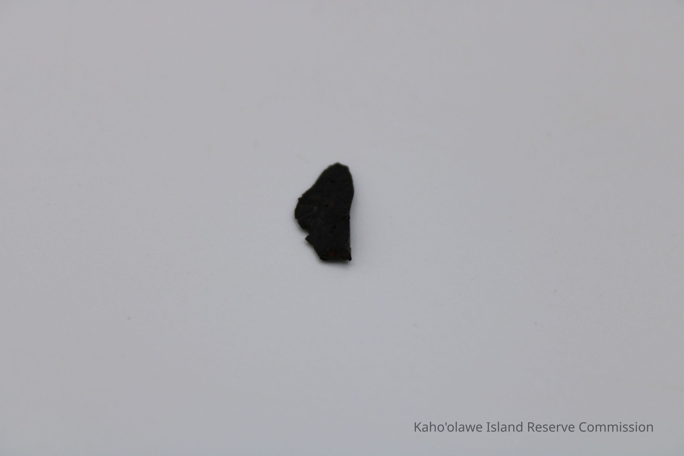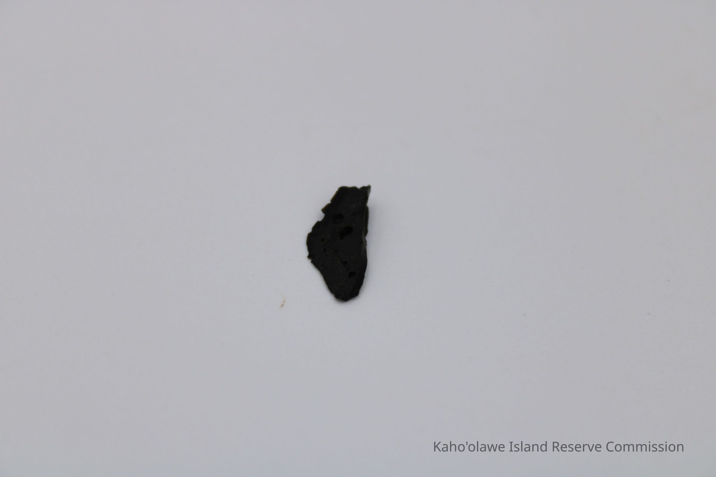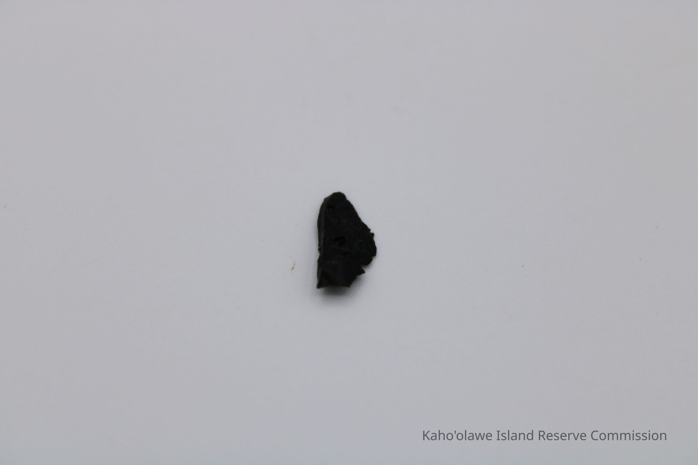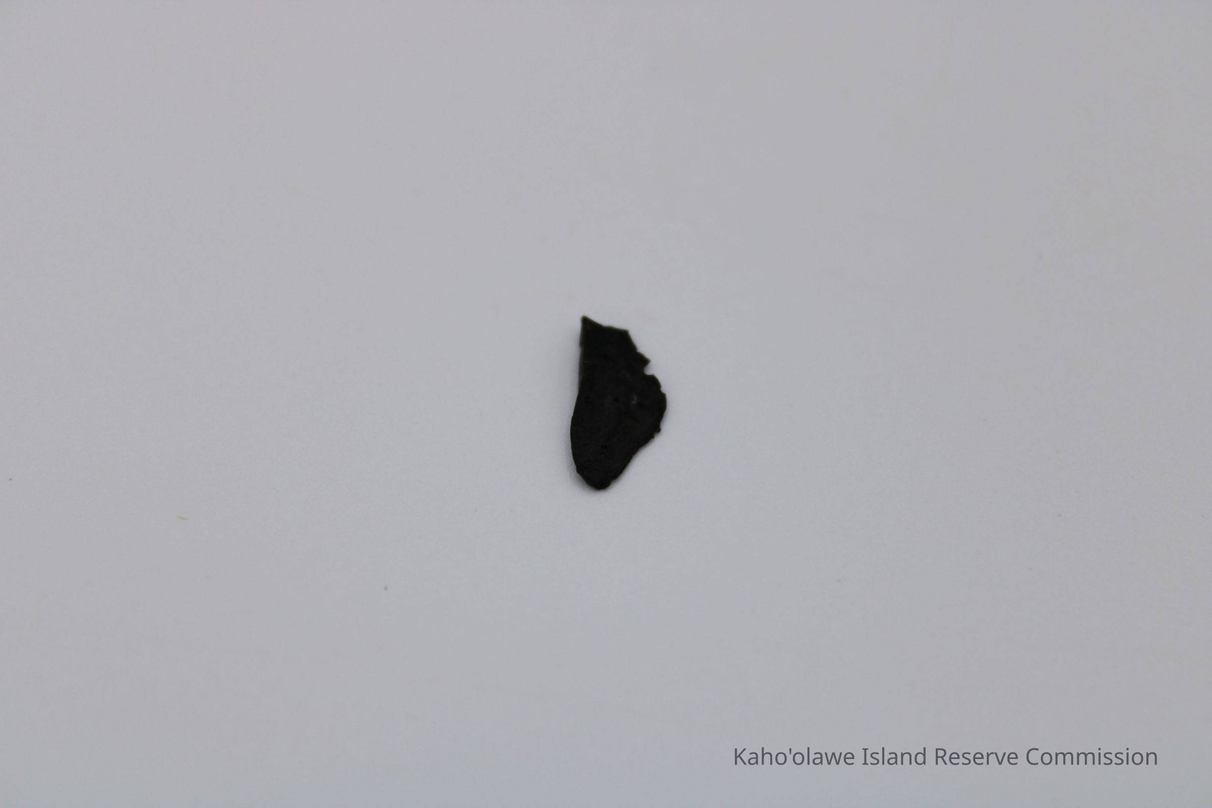 Tiny, roughly triangular flake of basaltic glass with sharp, uneven edges, D.H.P (?) collected at 10:45 am temperature 25.4 degrees C per Sample Collection Record, [Hawai'i] State Historic Preservation Office.Collection