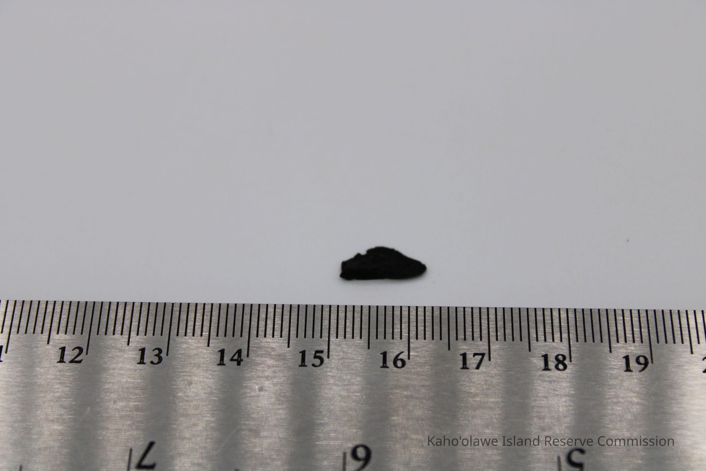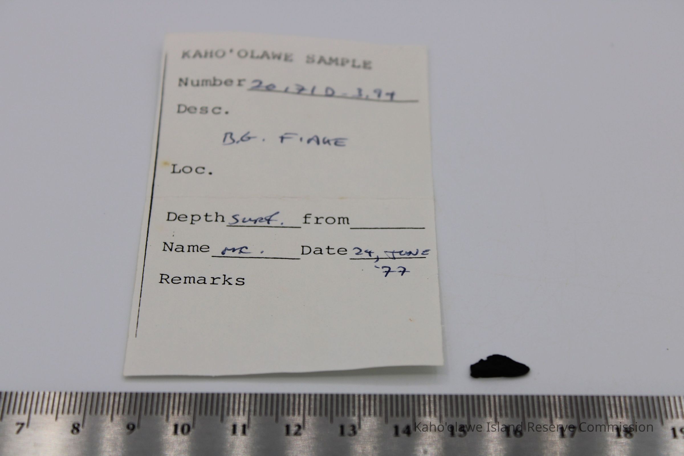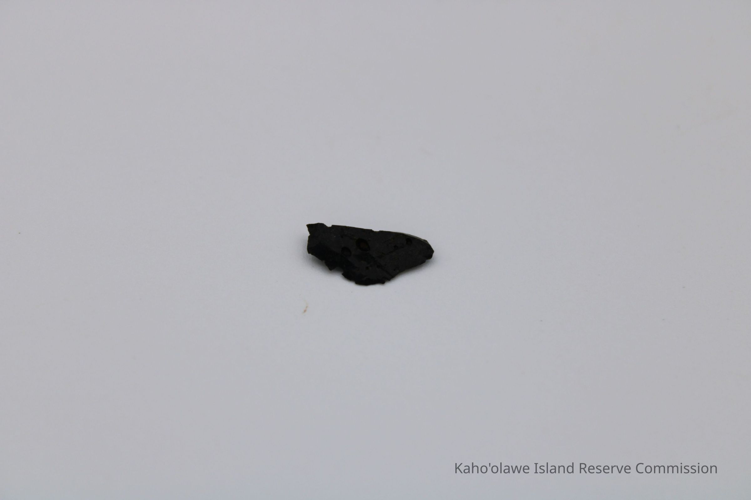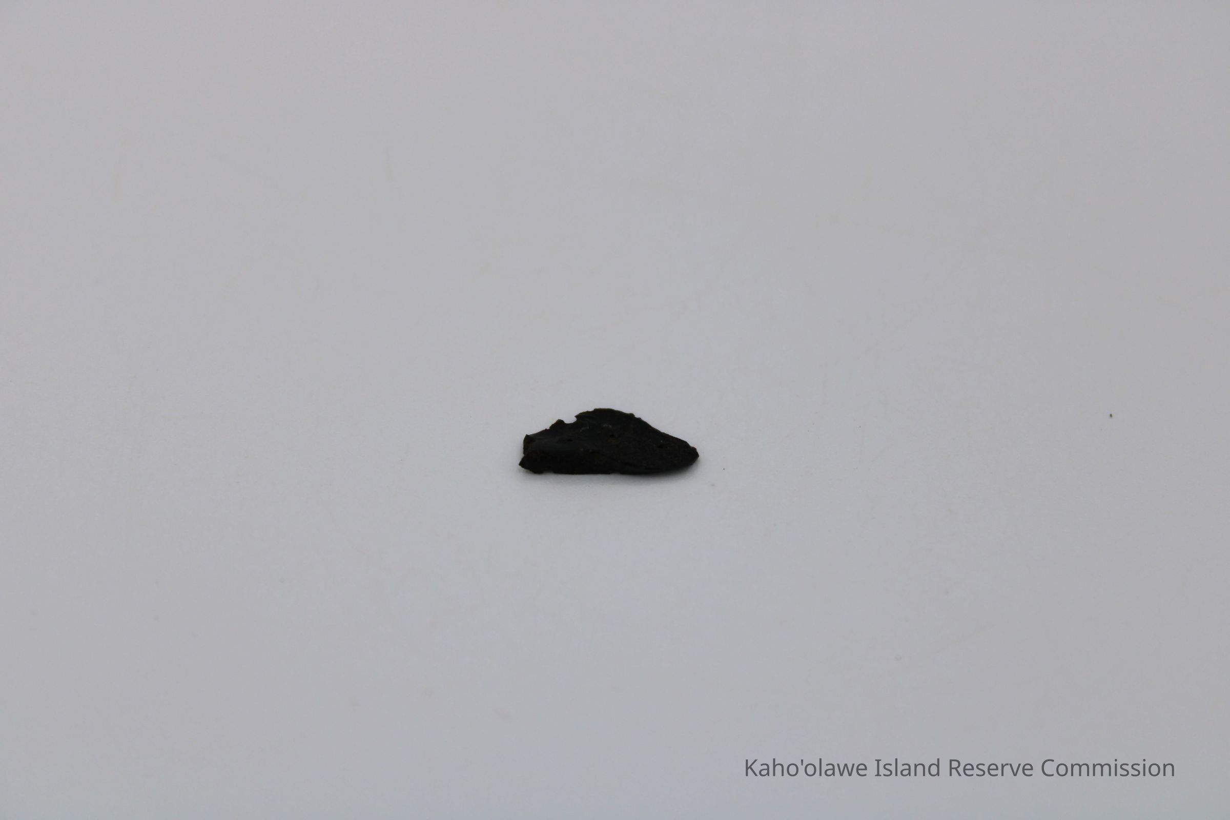 Tiny, roughly triangular flake of basaltic glass with sharp, uneven edges, D.H.P (?) collected at 10:45 am temperature 25.4 degrees C per Sample Collection Record, [Hawai'i] State Historic Preservation Office.Collection