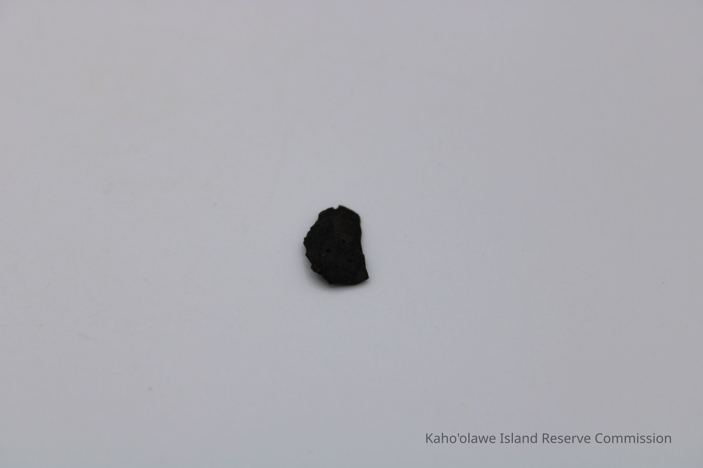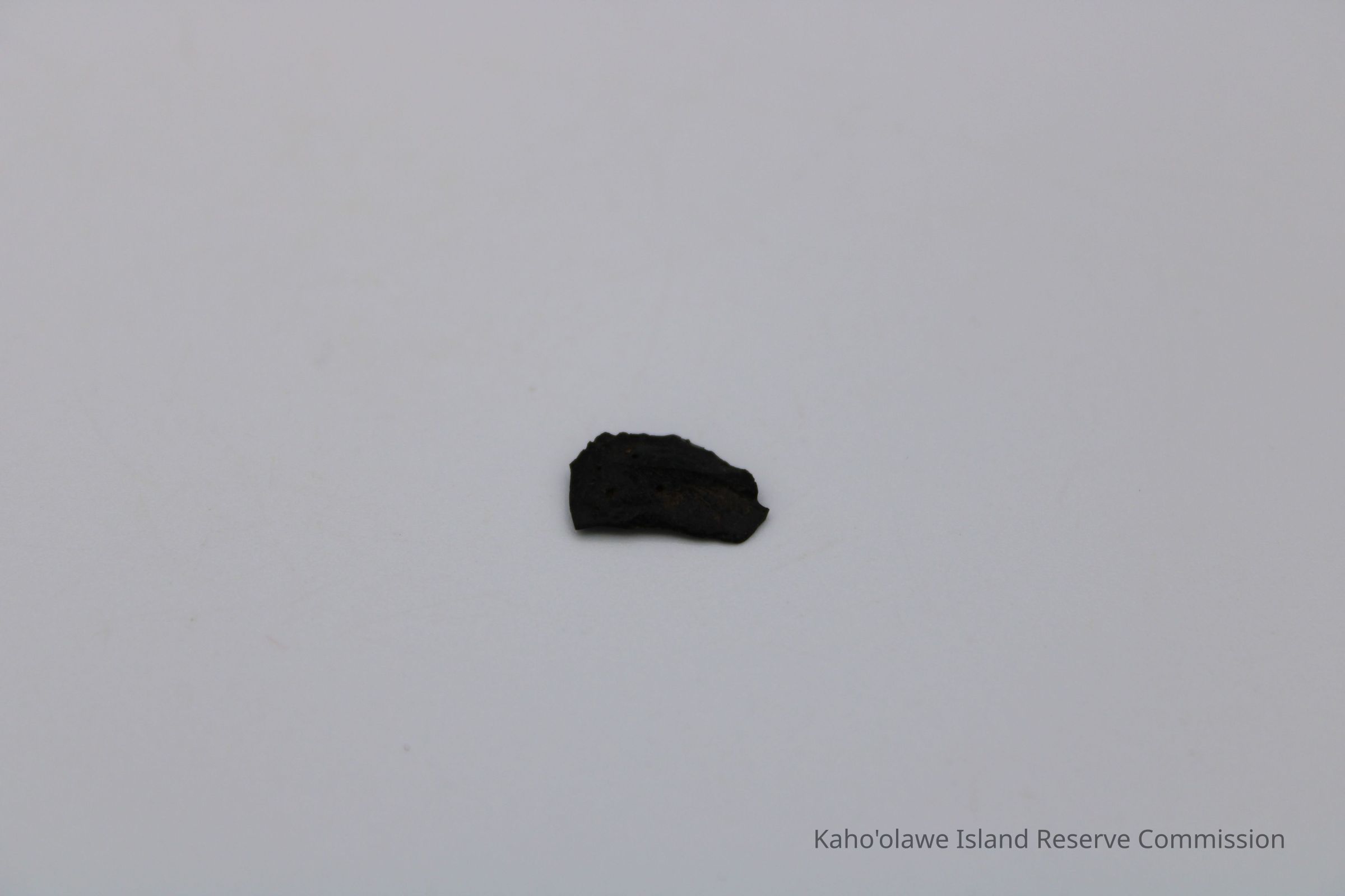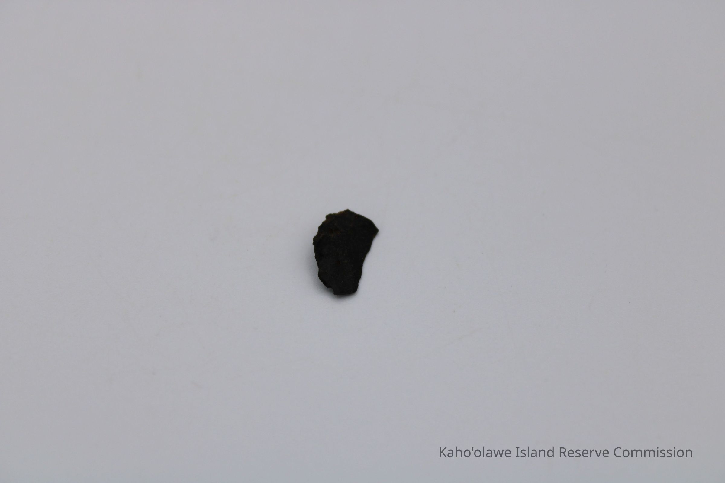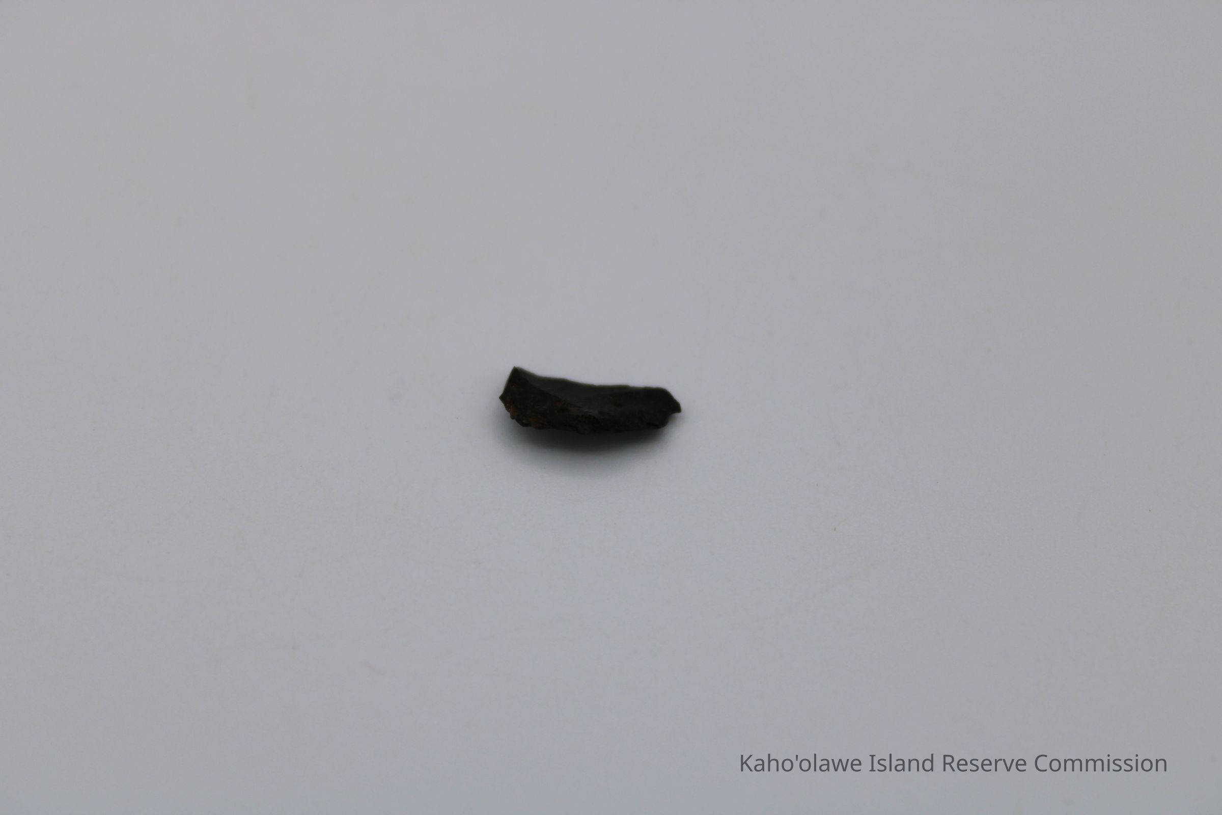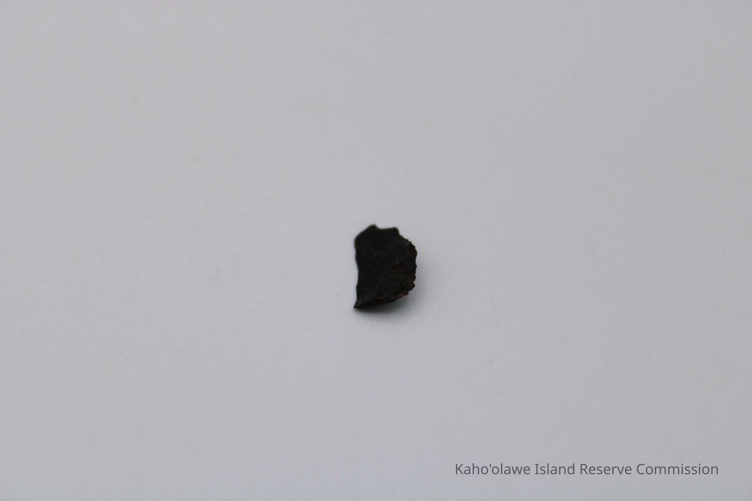 Very tiny half-crescent shaped flake of basaltic glass with jagged edges.Collection