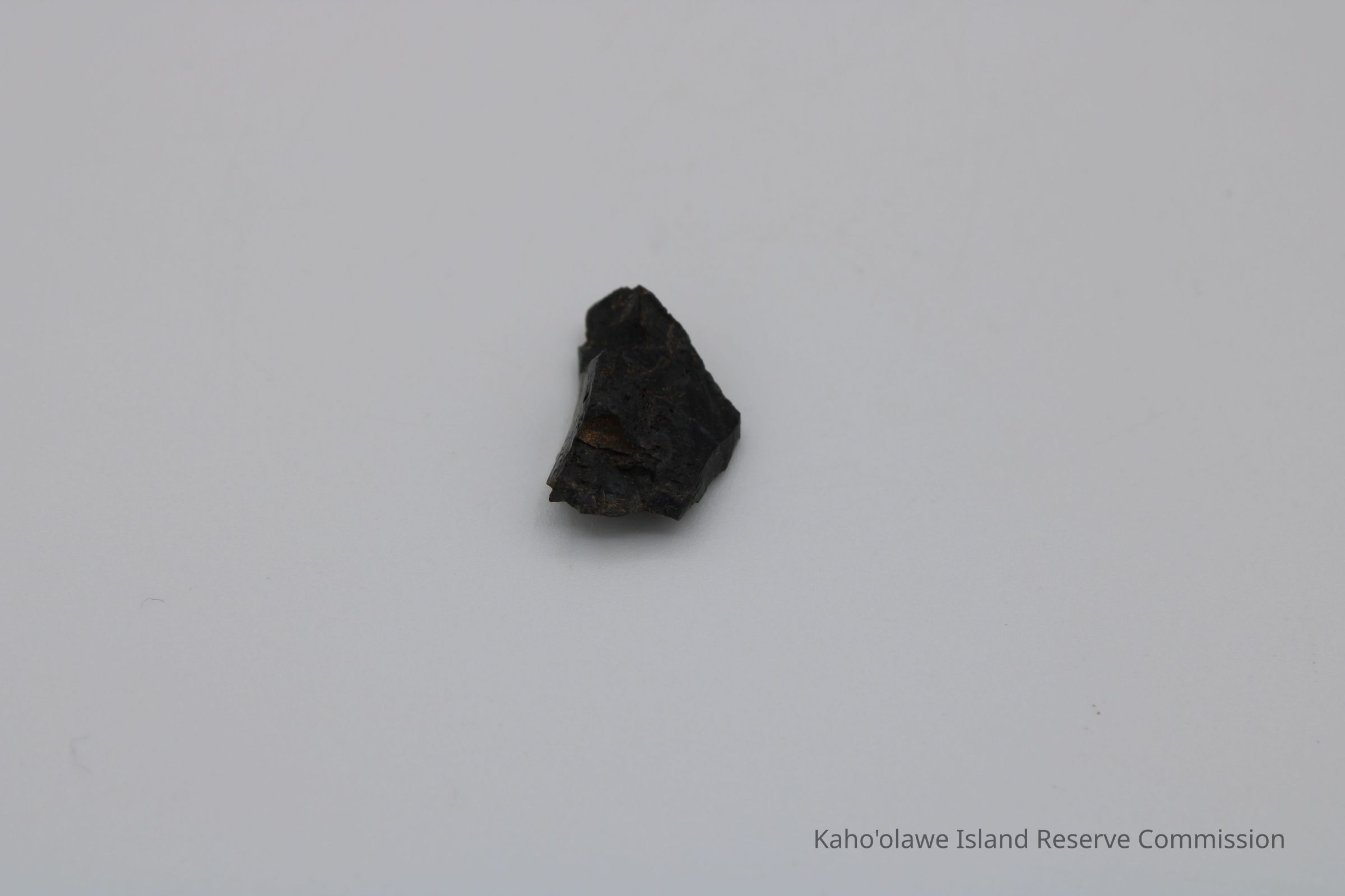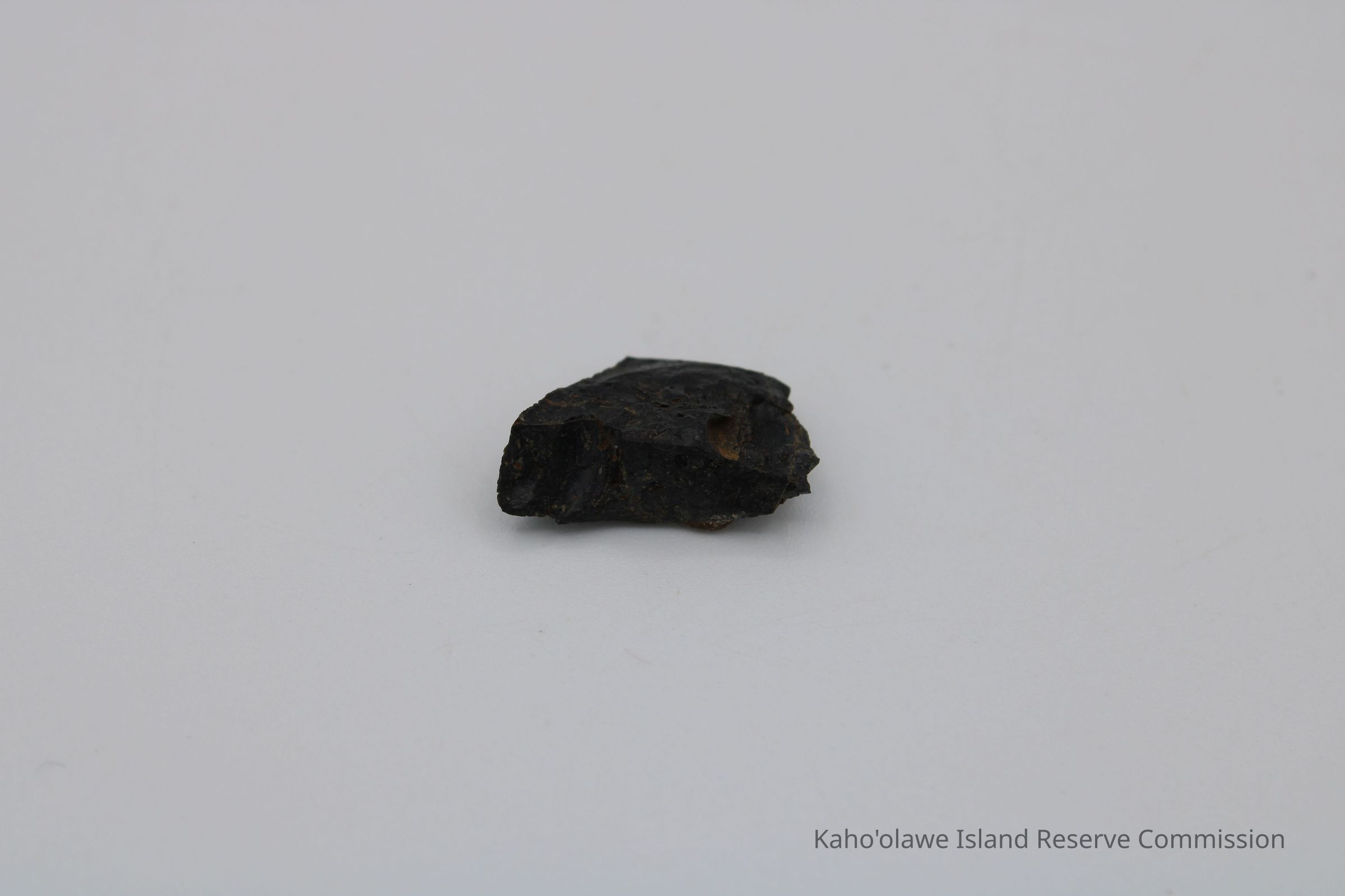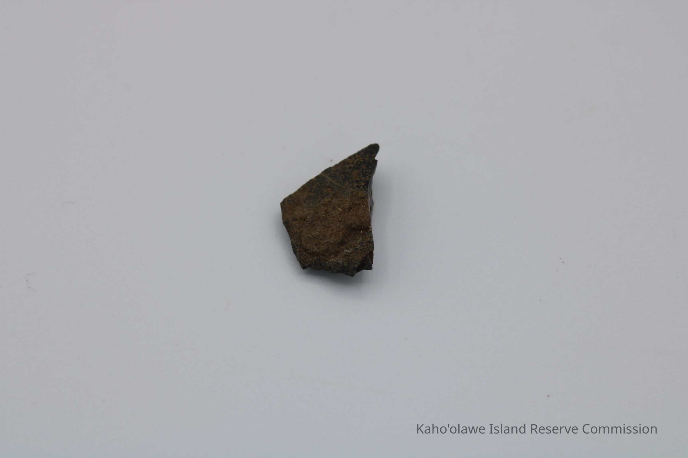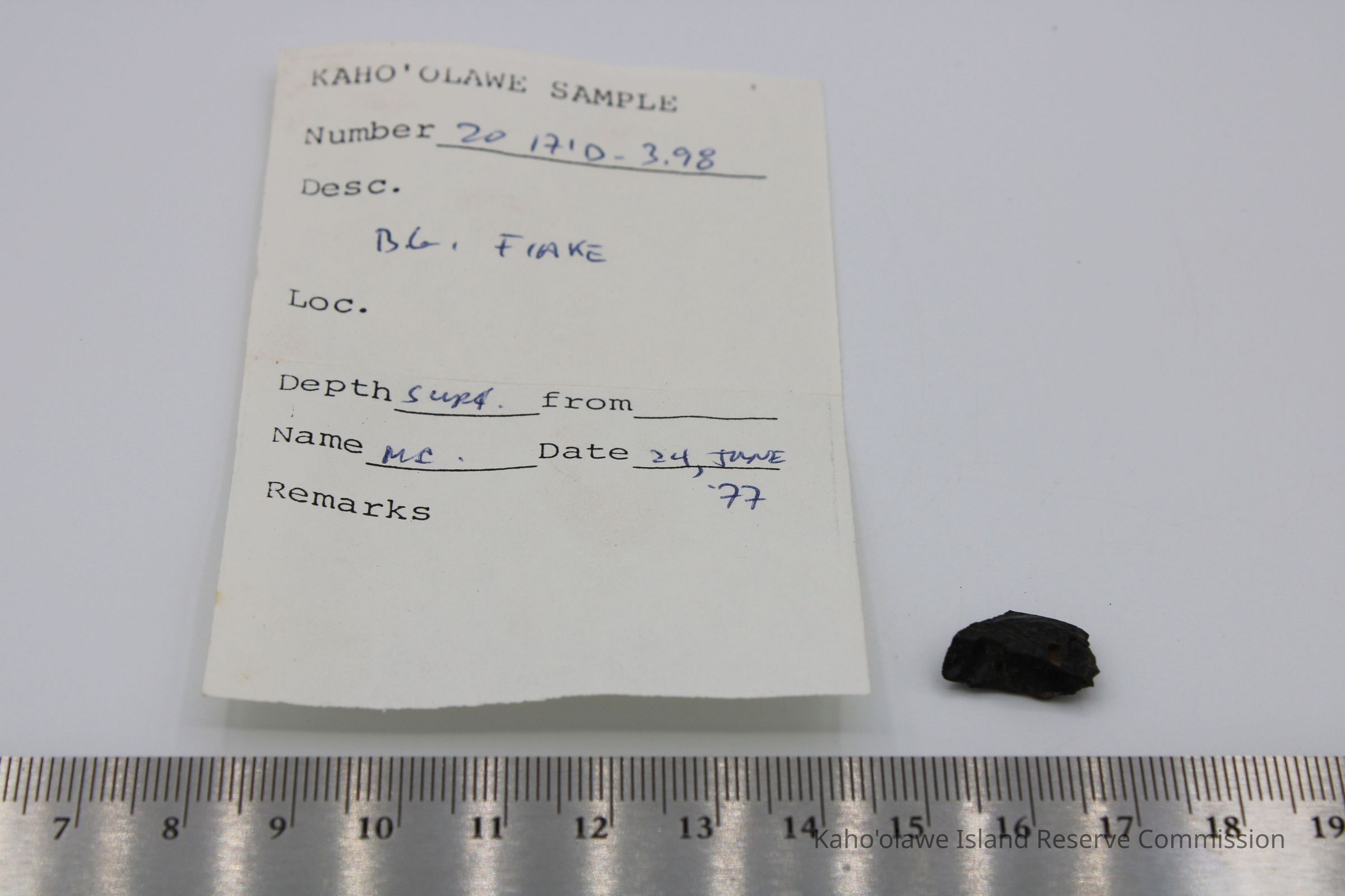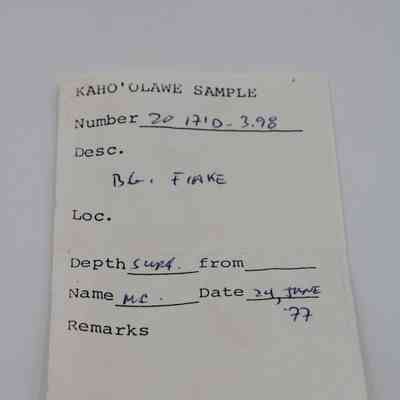 Small irregularly shaped flake of basaltic glass. Per Sample Collection Record, [Hawai'i] State Historic Preservation Office, the flake has grayish-brown per Munsell Color system with a value of 5/2 hue=2.54. D.H.P. 1000am=25.3 c, 1045 am=25.4 C and 1100 am=25.5 C (possibly soil temperature at recovery ?).Collection