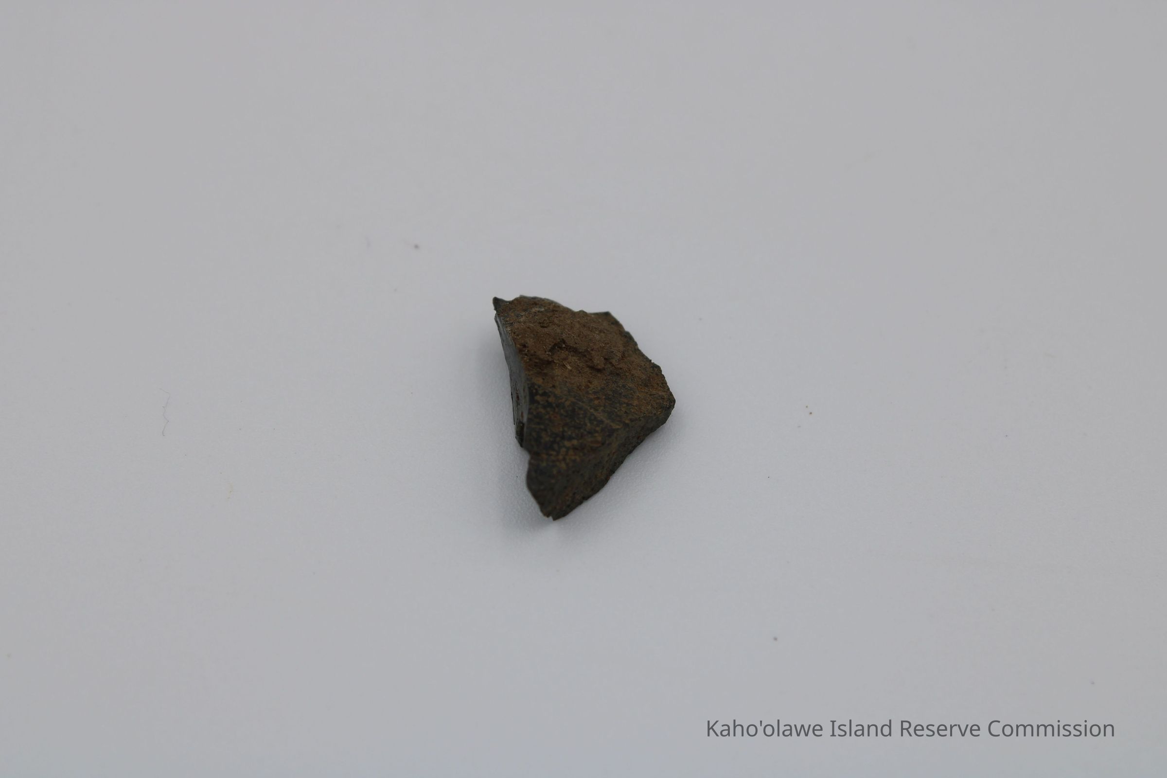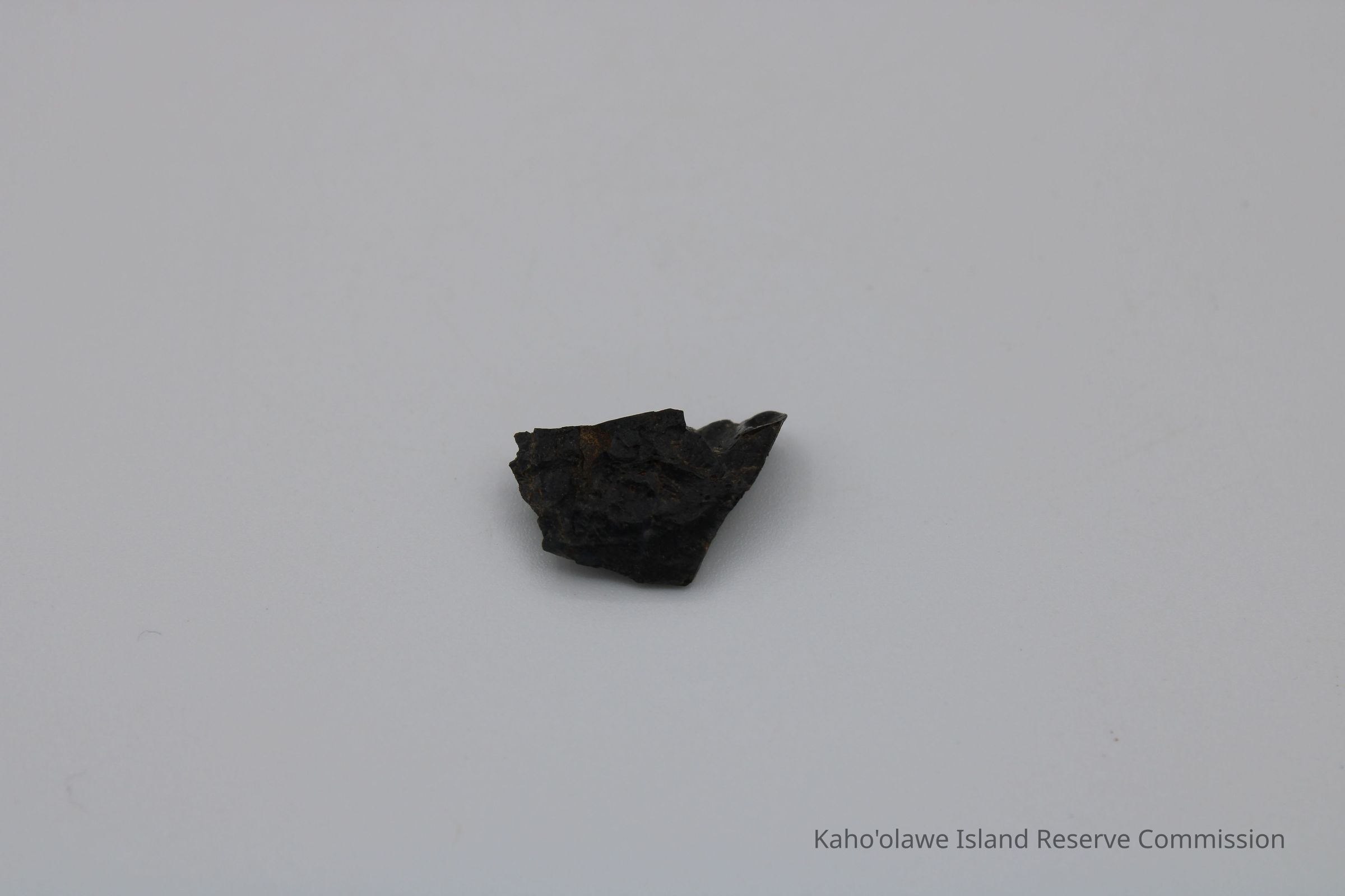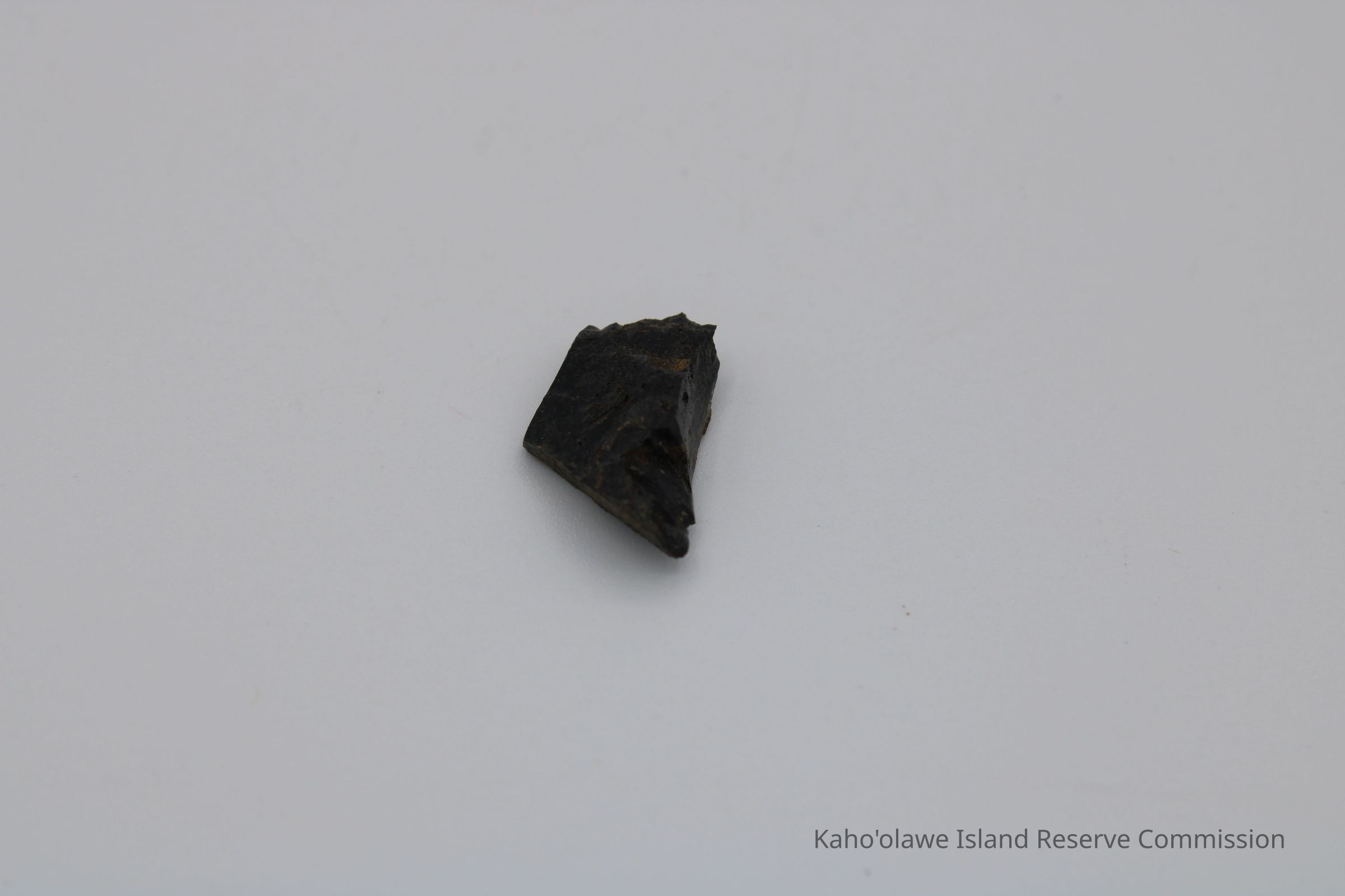 Small irregularly shaped flake of basaltic glass. Per Sample Collection Record, [Hawai'i] State Historic Preservation Office, the flake has grayish-brown per Munsell Color system with a value of 5/2 hue=2.54. D.H.P. 1000am=25.3 c, 1045 am=25.4 C and 1100 am=25.5 C (possibly soil temperature at recovery ?).Collection