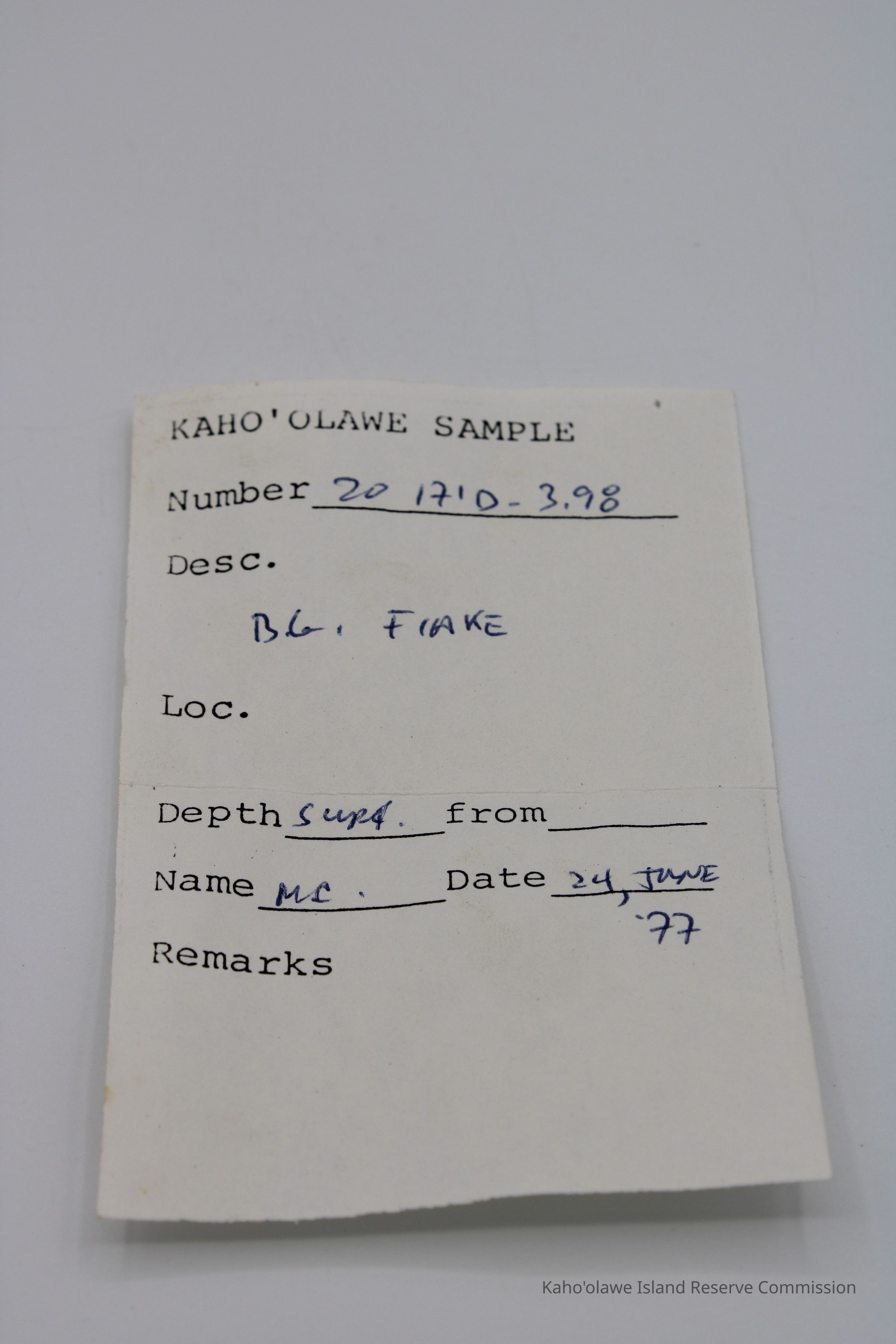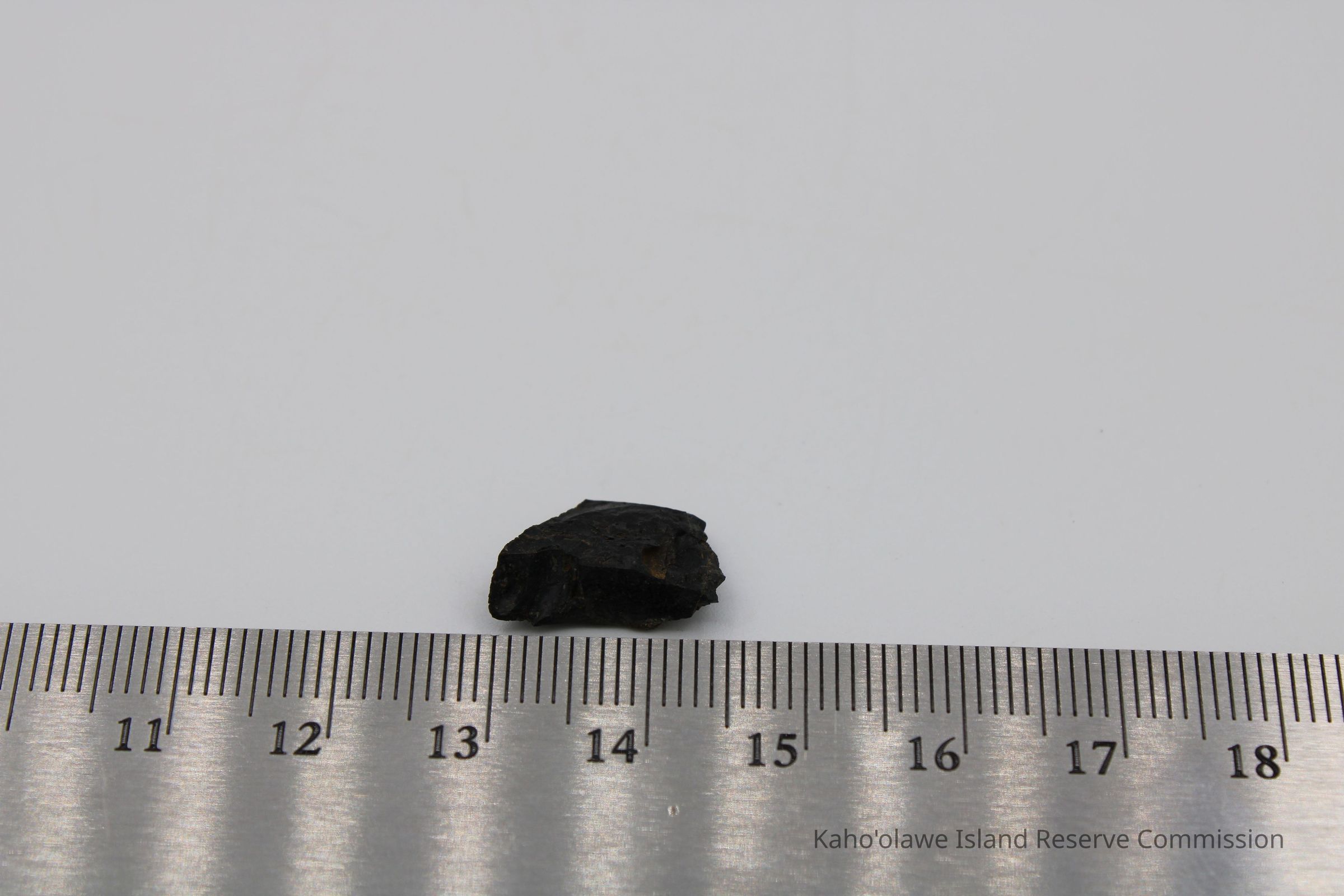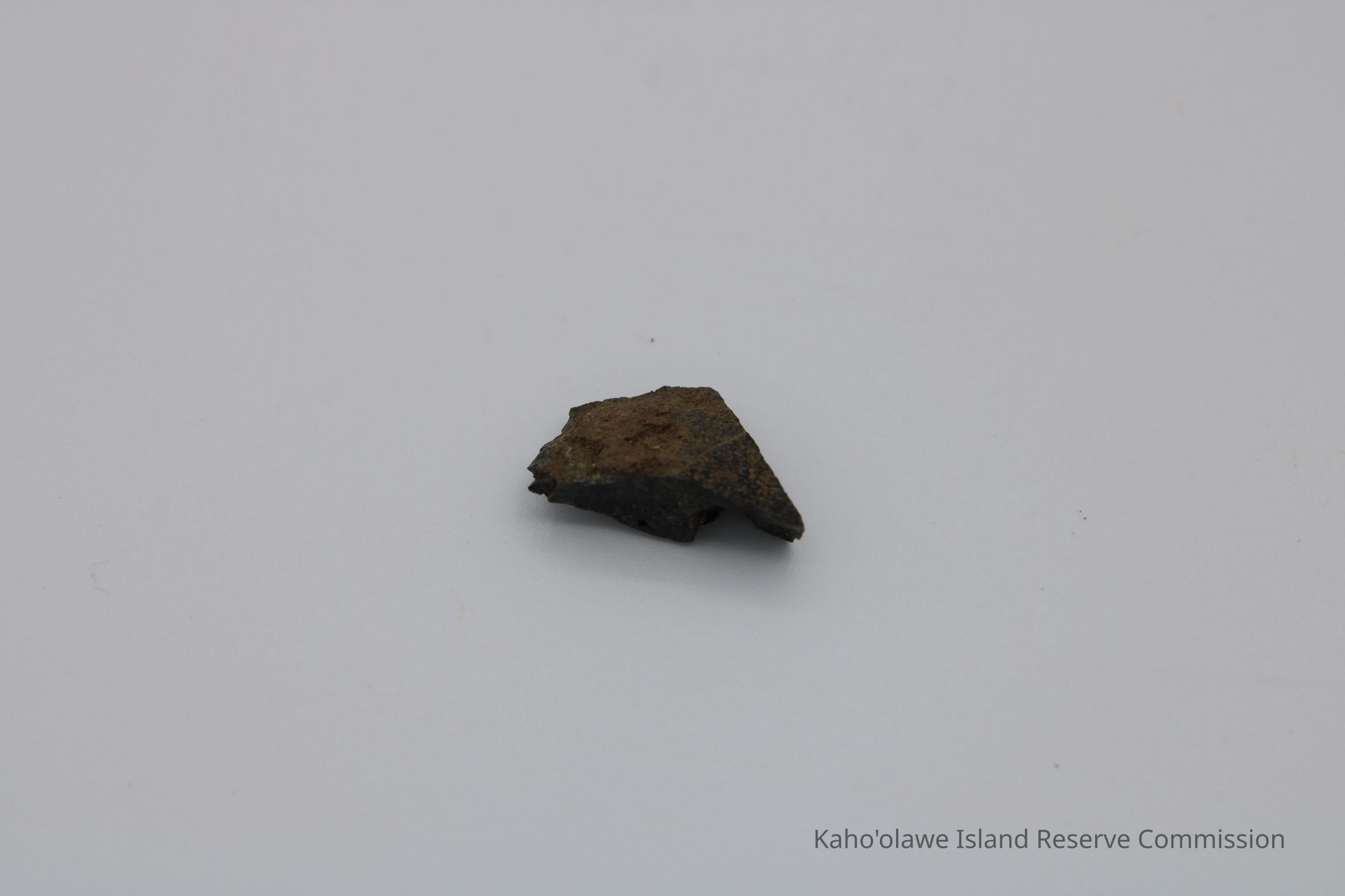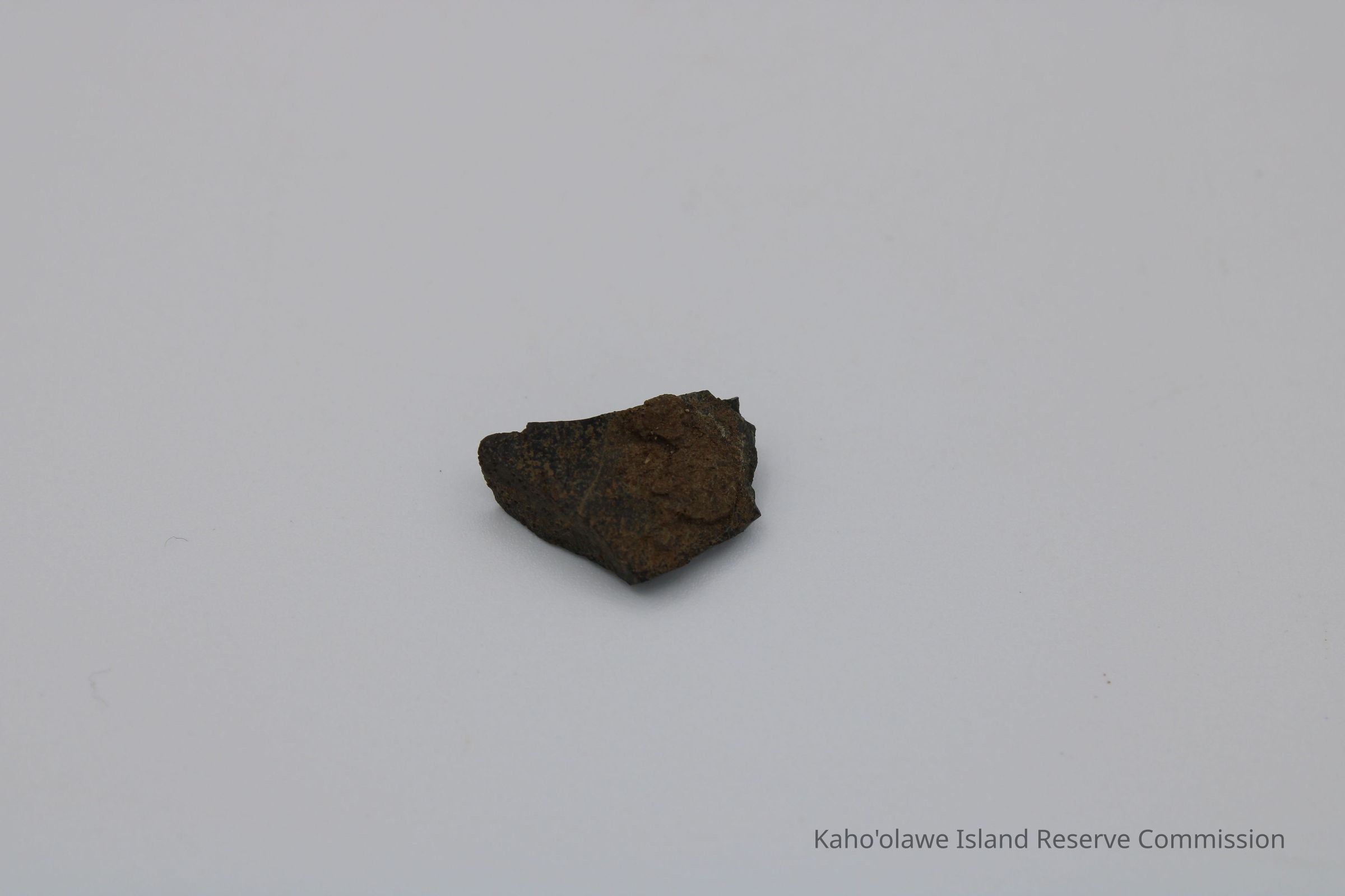 Small irregularly shaped flake of basaltic glass. Per Sample Collection Record, [Hawai'i] State Historic Preservation Office, the flake has grayish-brown per Munsell Color system with a value of 5/2 hue=2.54. D.H.P. 1000am=25.3 c, 1045 am=25.4 C and 1100 am=25.5 C (possibly soil temperature at recovery ?).Collection