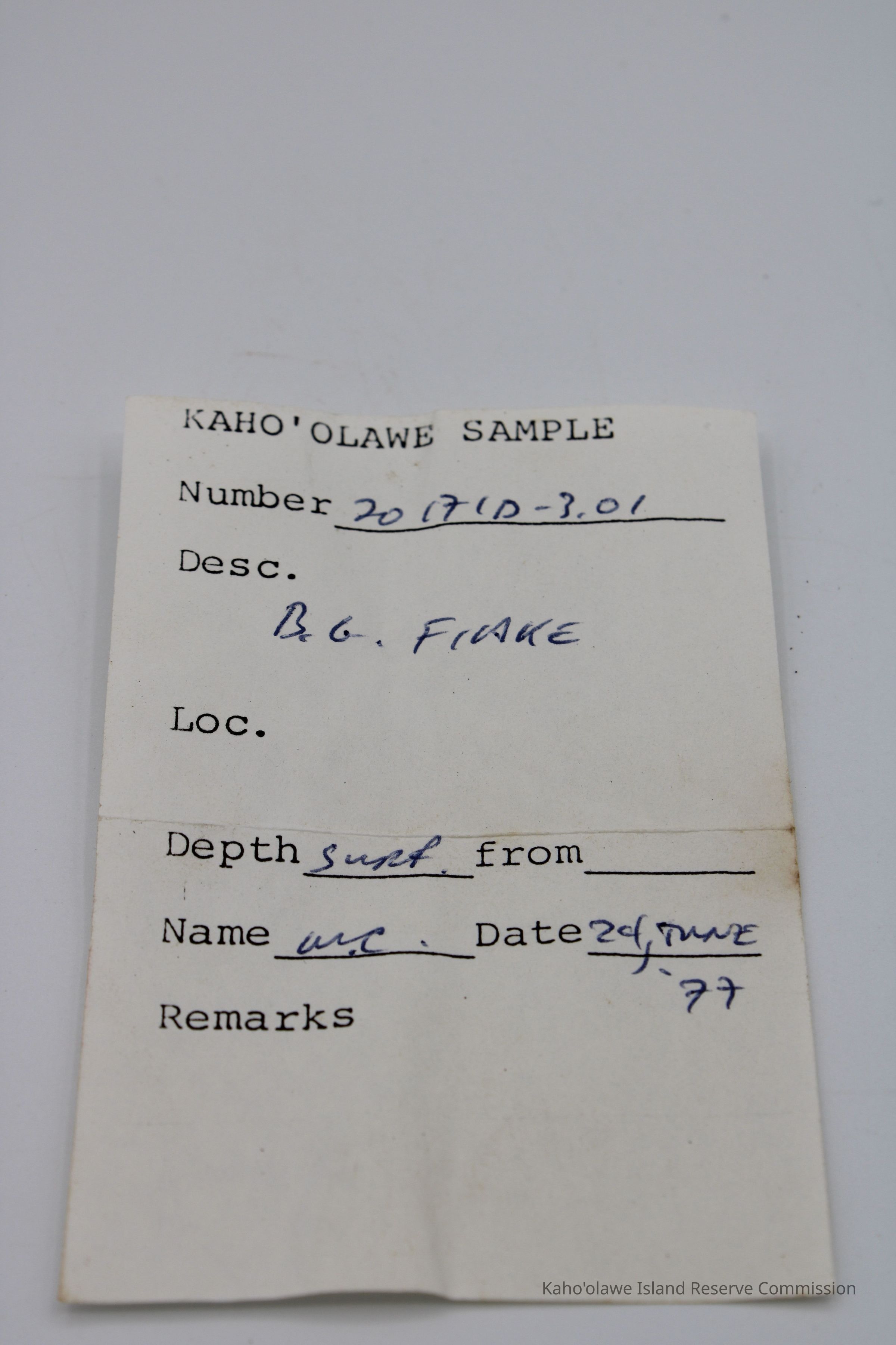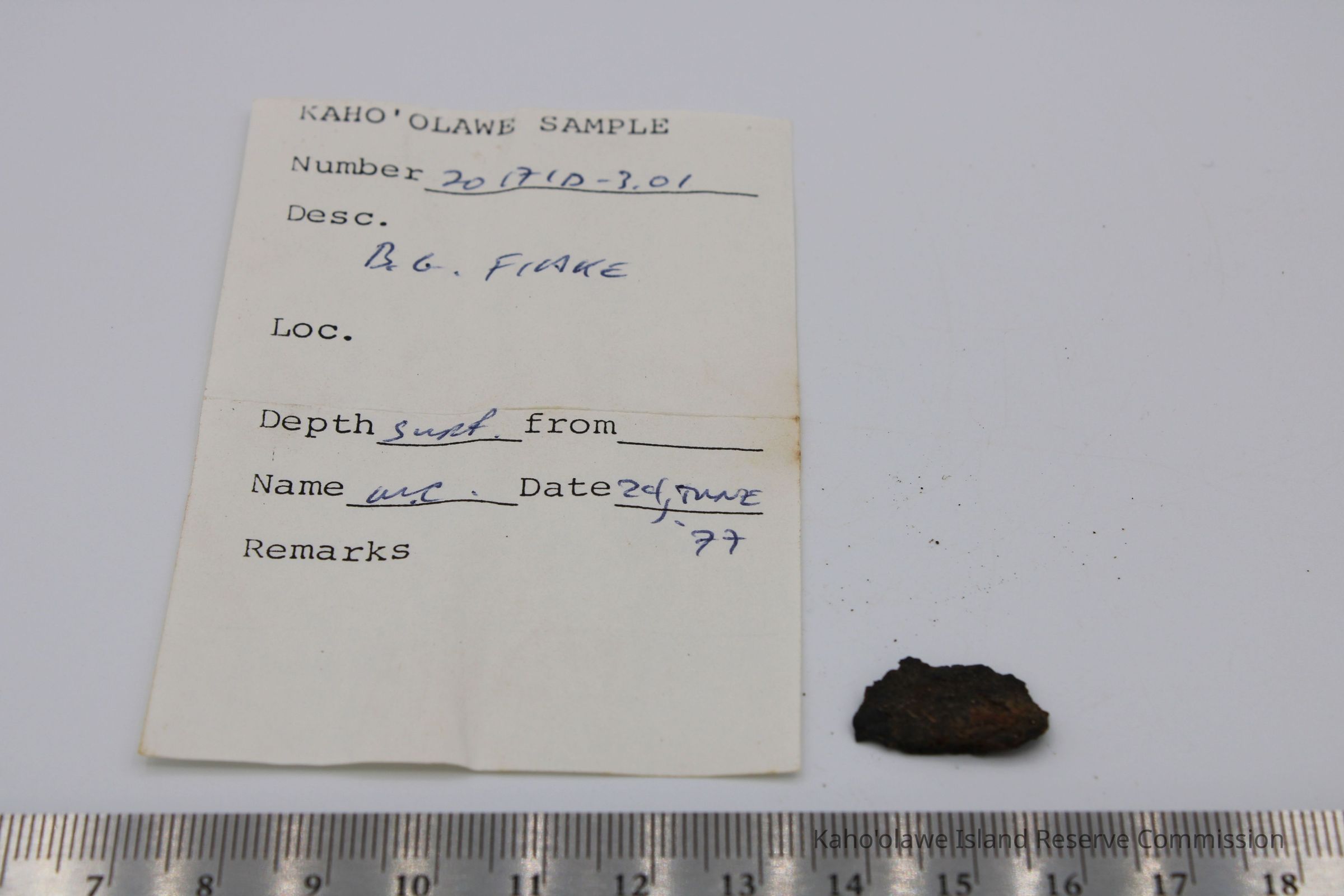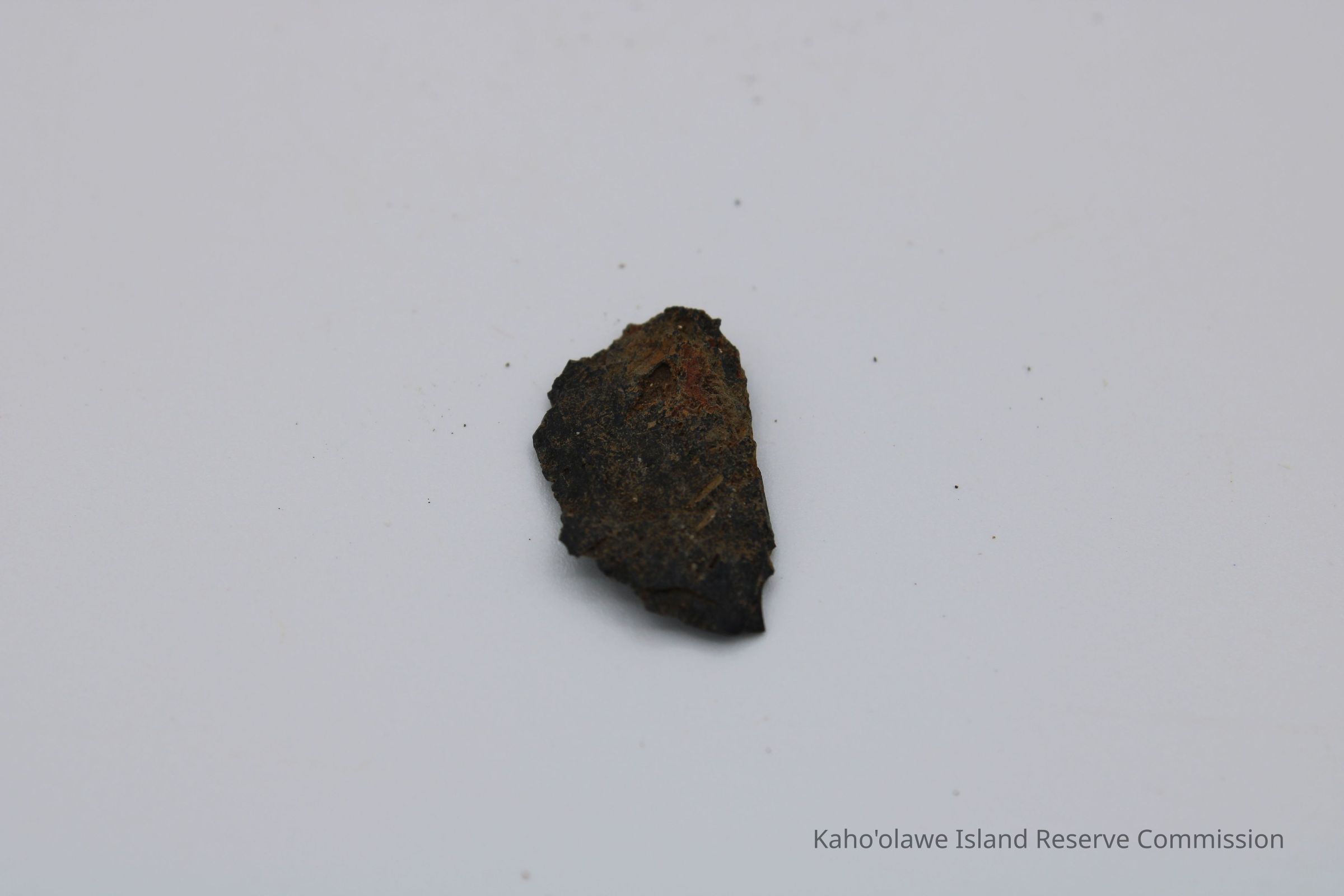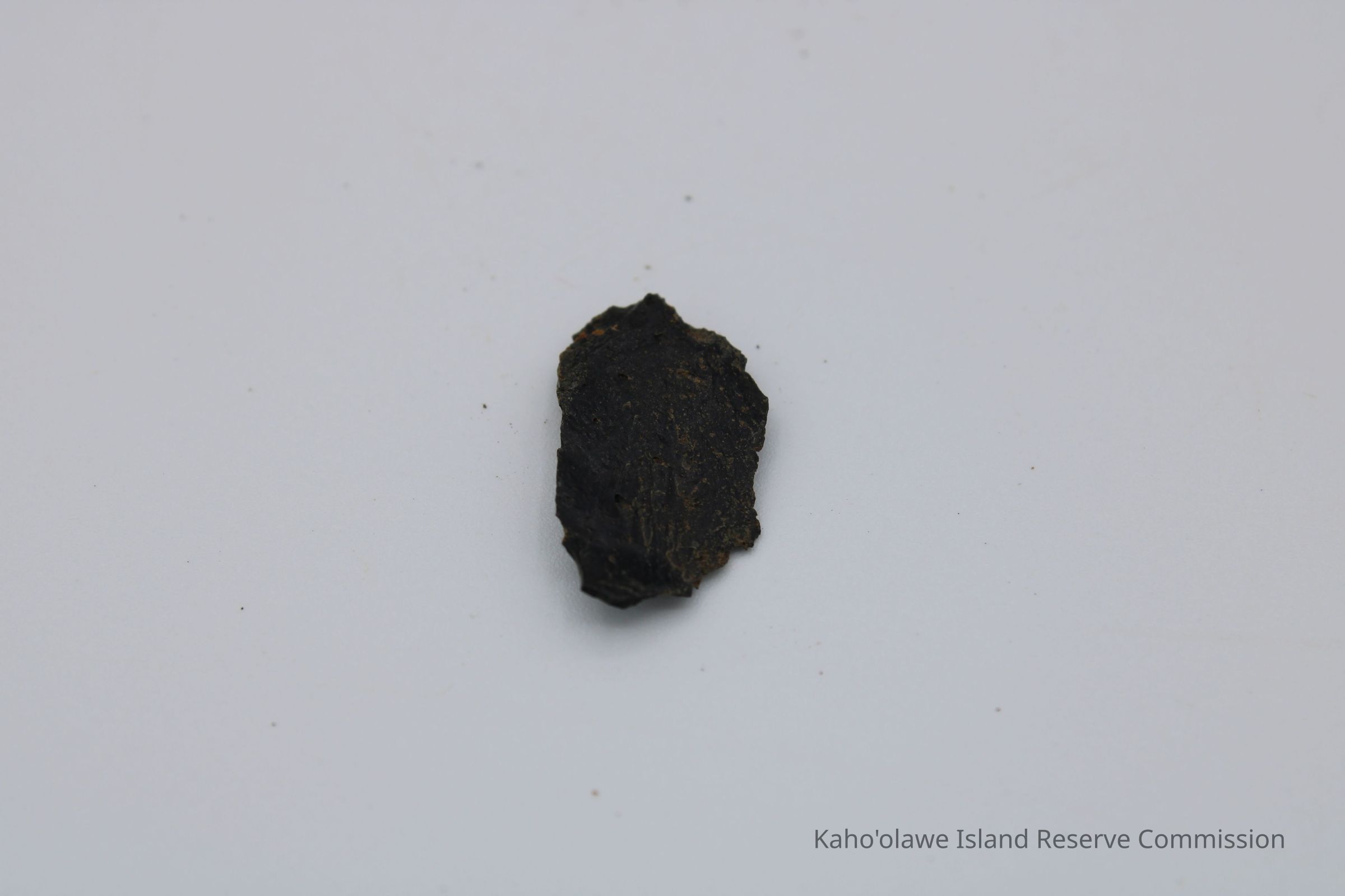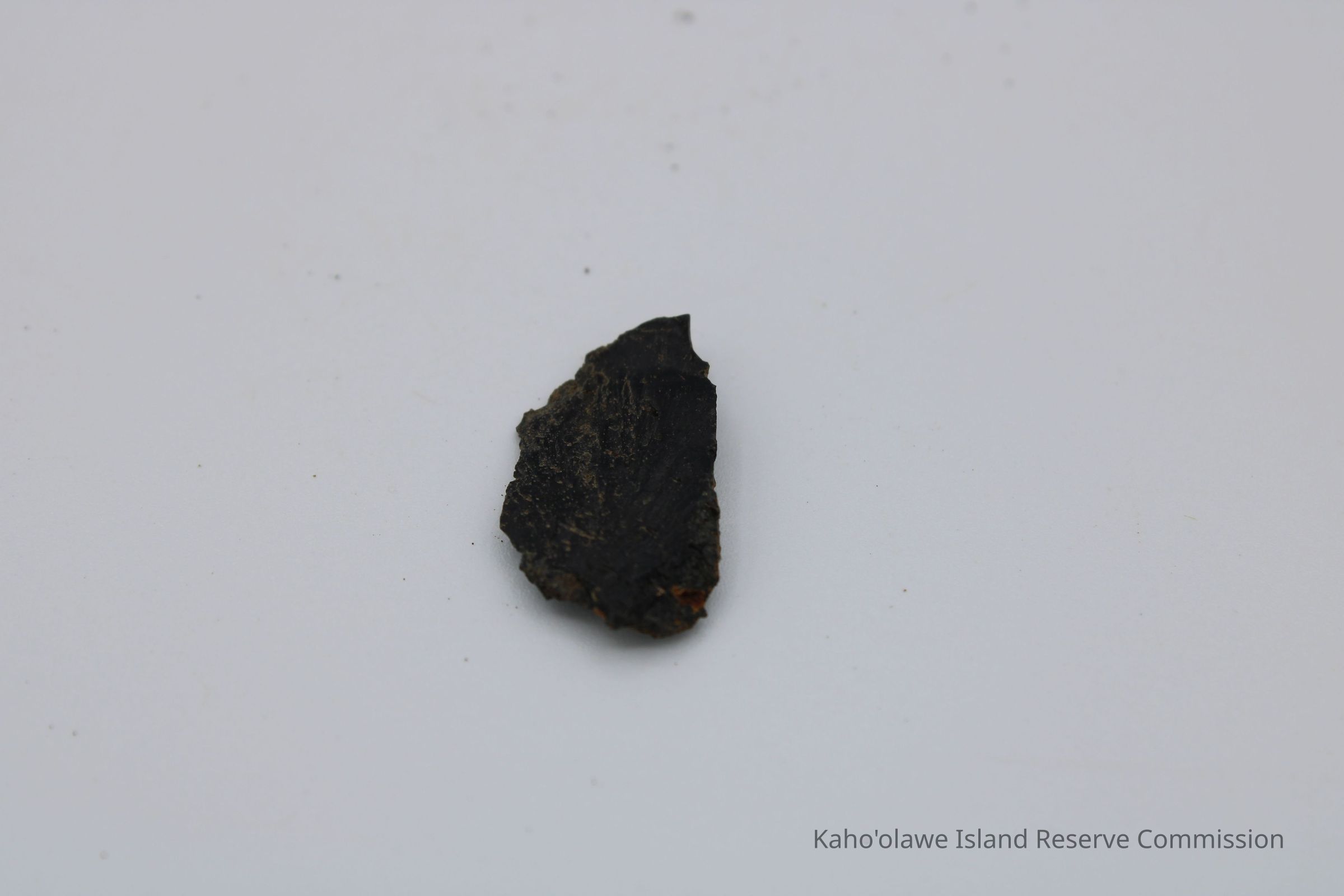 Small, irregularly-shpaed flake of basaltic glass with jagged edges and one smooth edge. Worked on one side. Flake may have been collected at D.H.P.11:00 am=25.5 degrees C per Sample Collection Record, [Hawai'i] State Historic Preservation Office.Collection