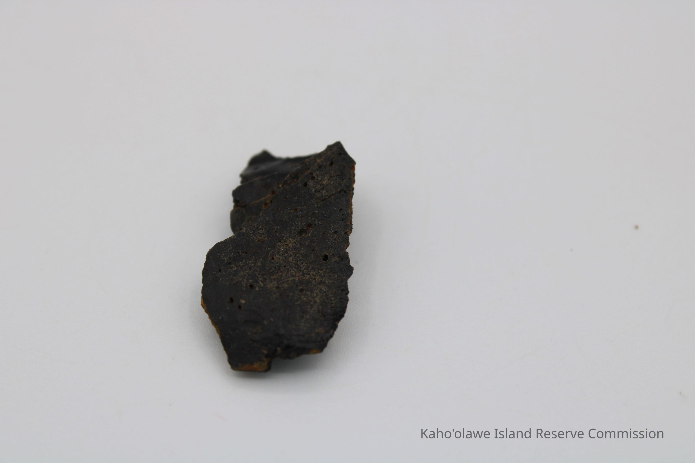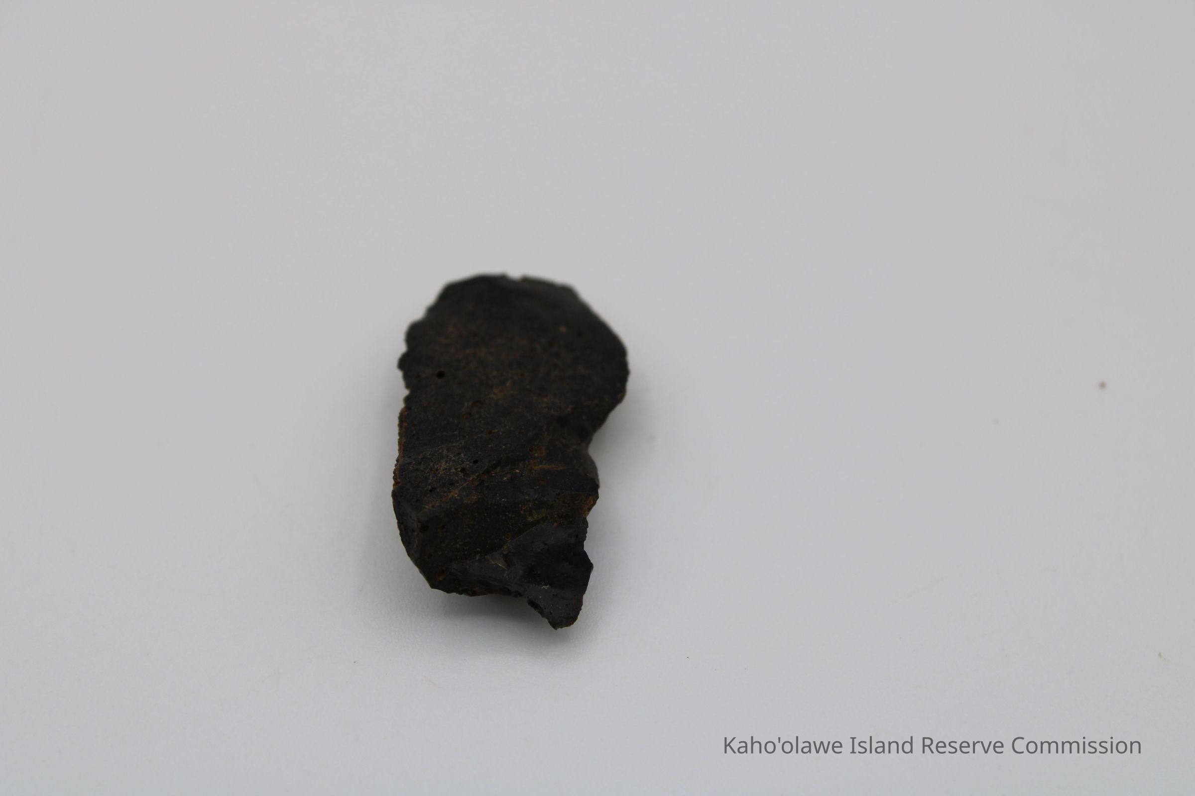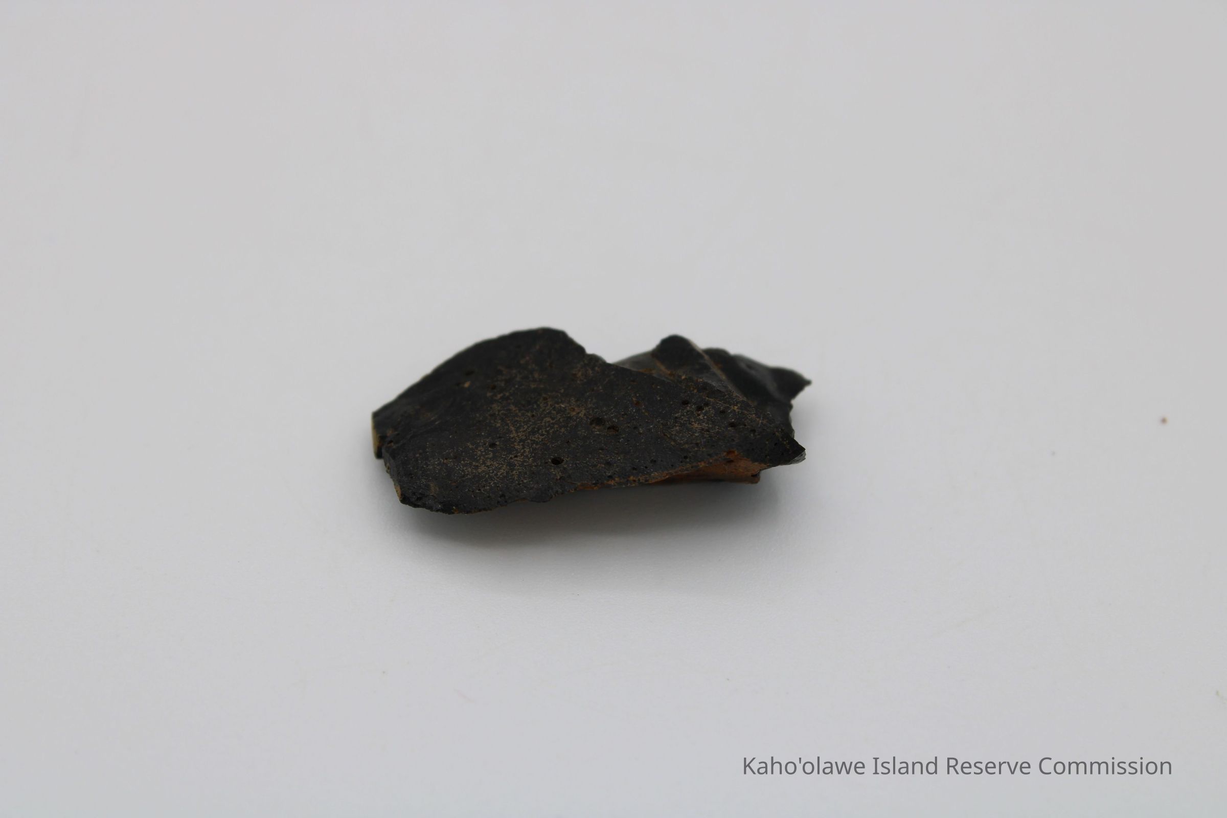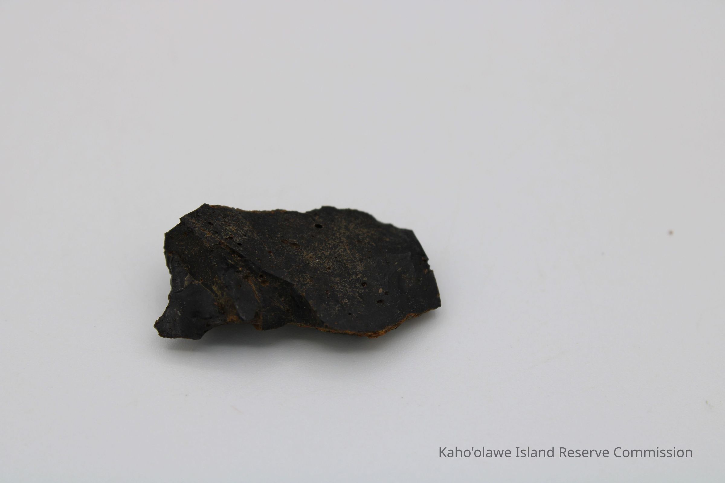 Flake of basaltic glass in roughly rectangular shape with three jagged edges. One side is black with small holes and light brown layer on opposite side.Collection