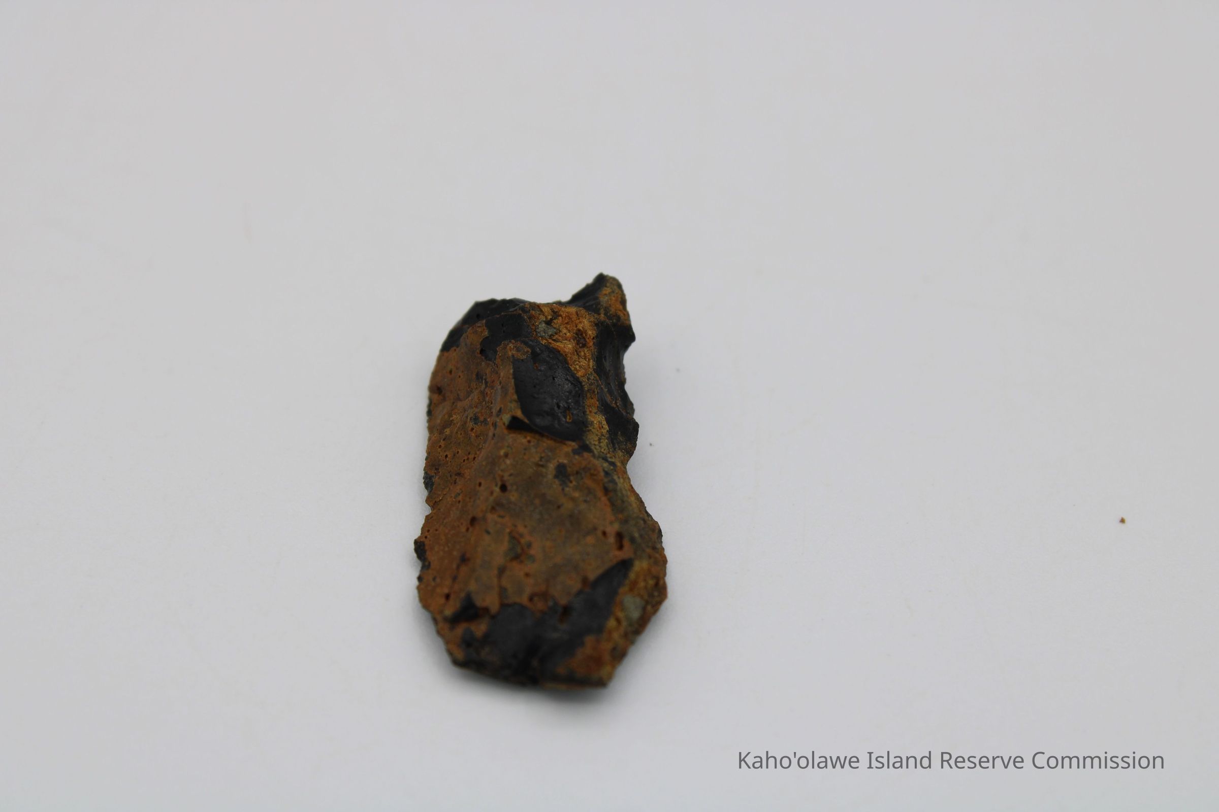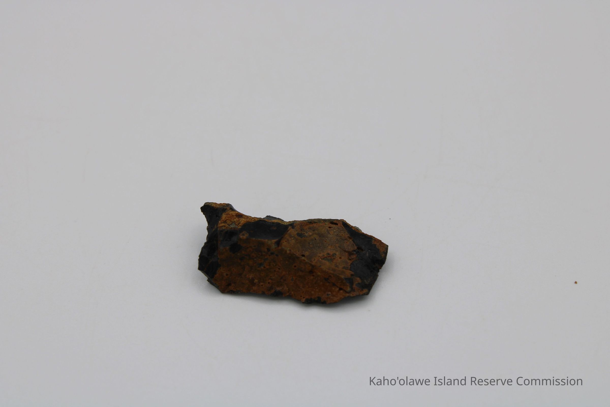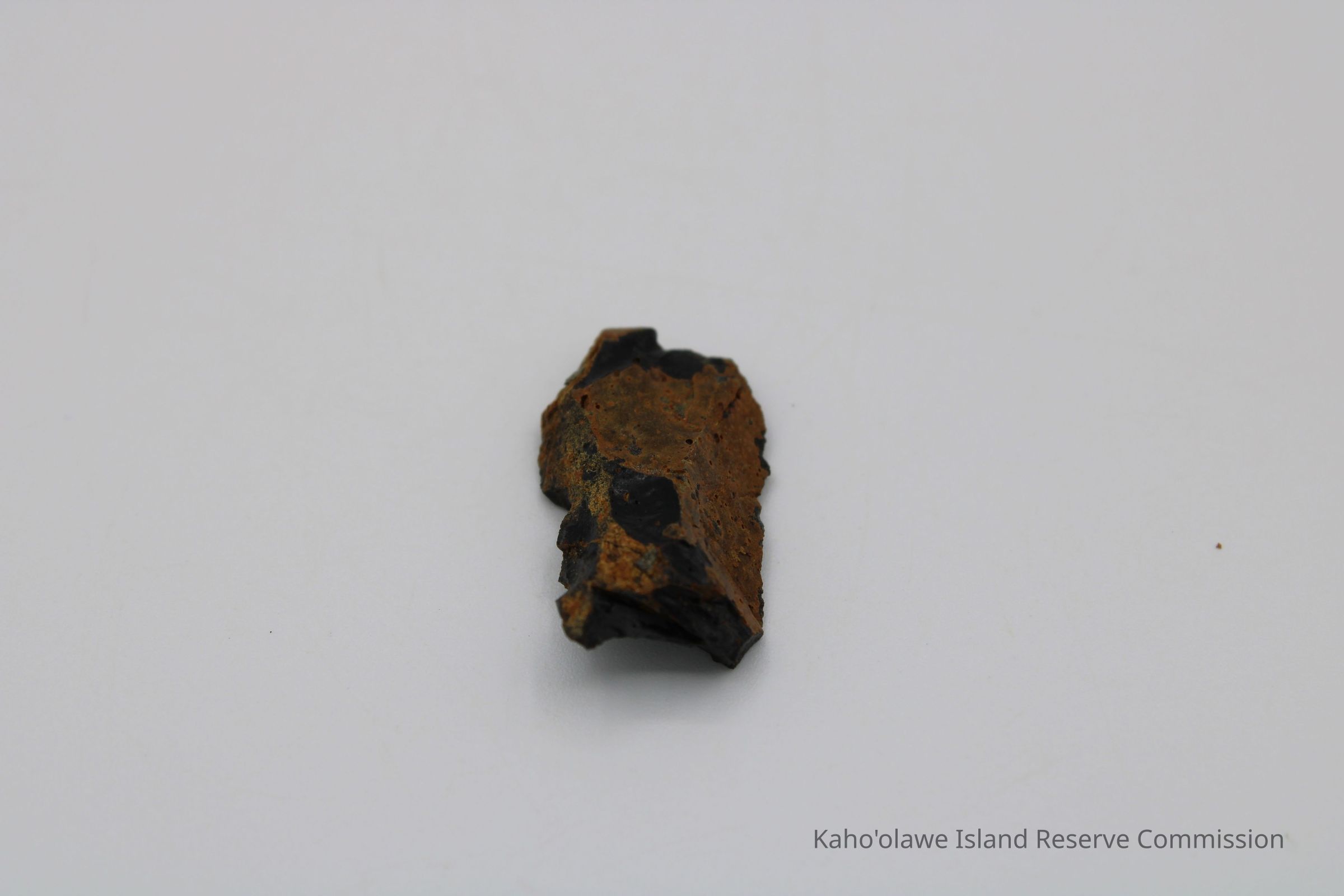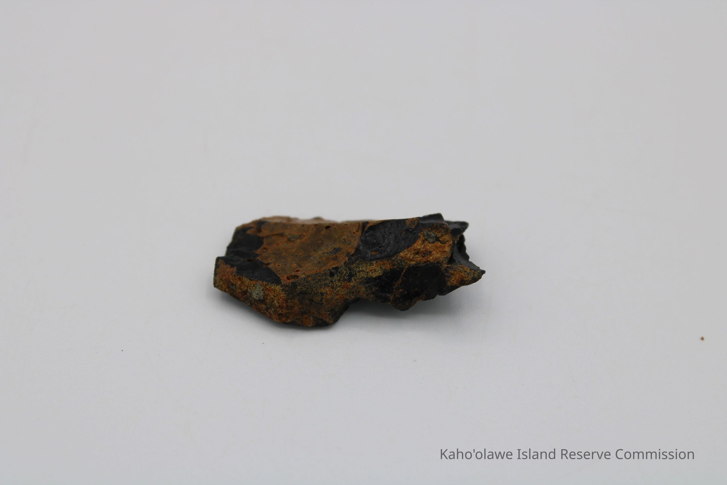 Flake of basaltic glass in roughly rectangular shape with three jagged edges. One side is black with small holes and light brown layer on opposite side.Collection