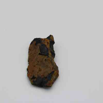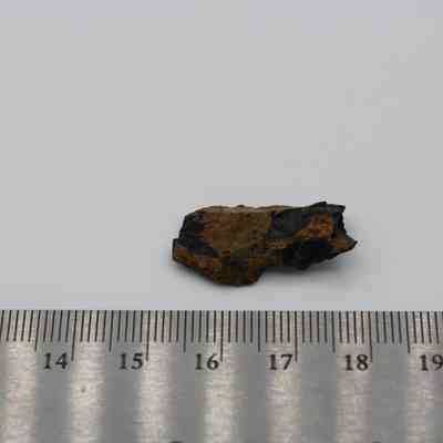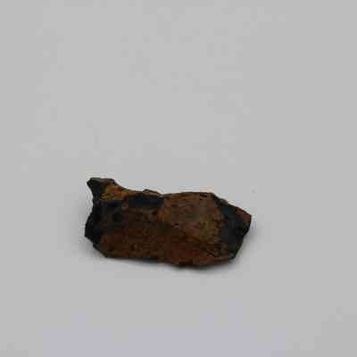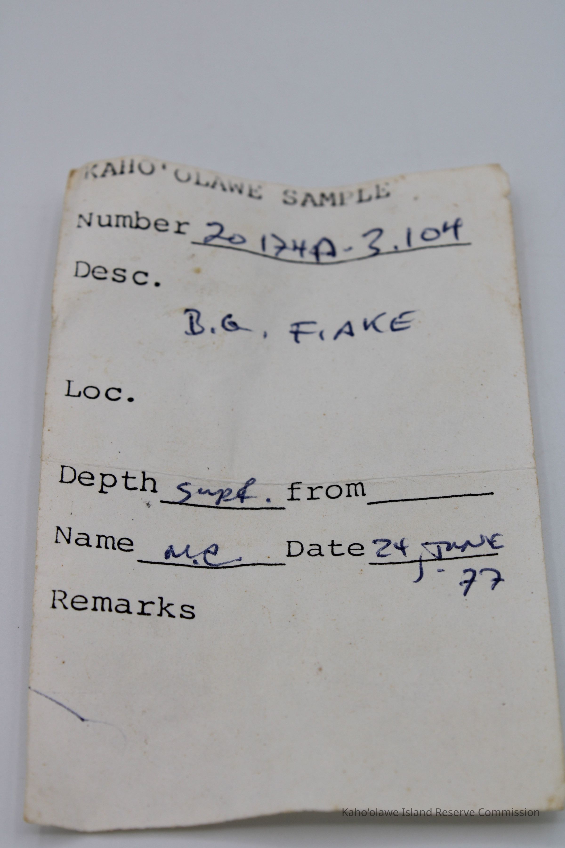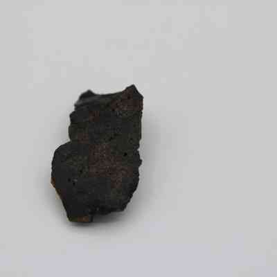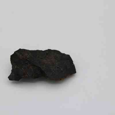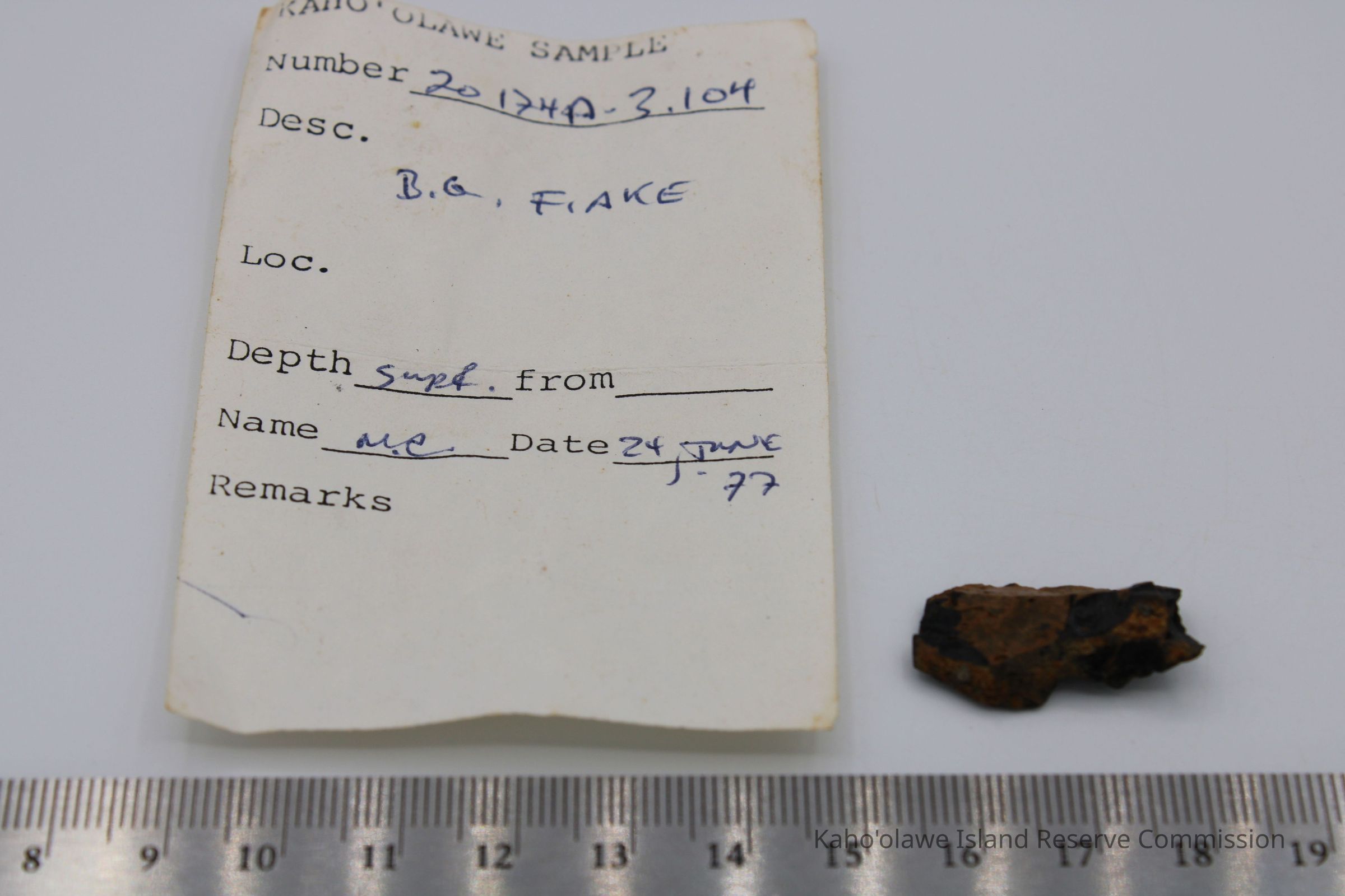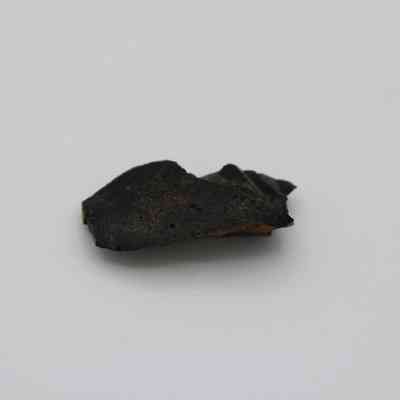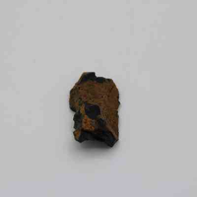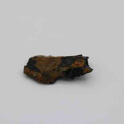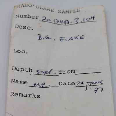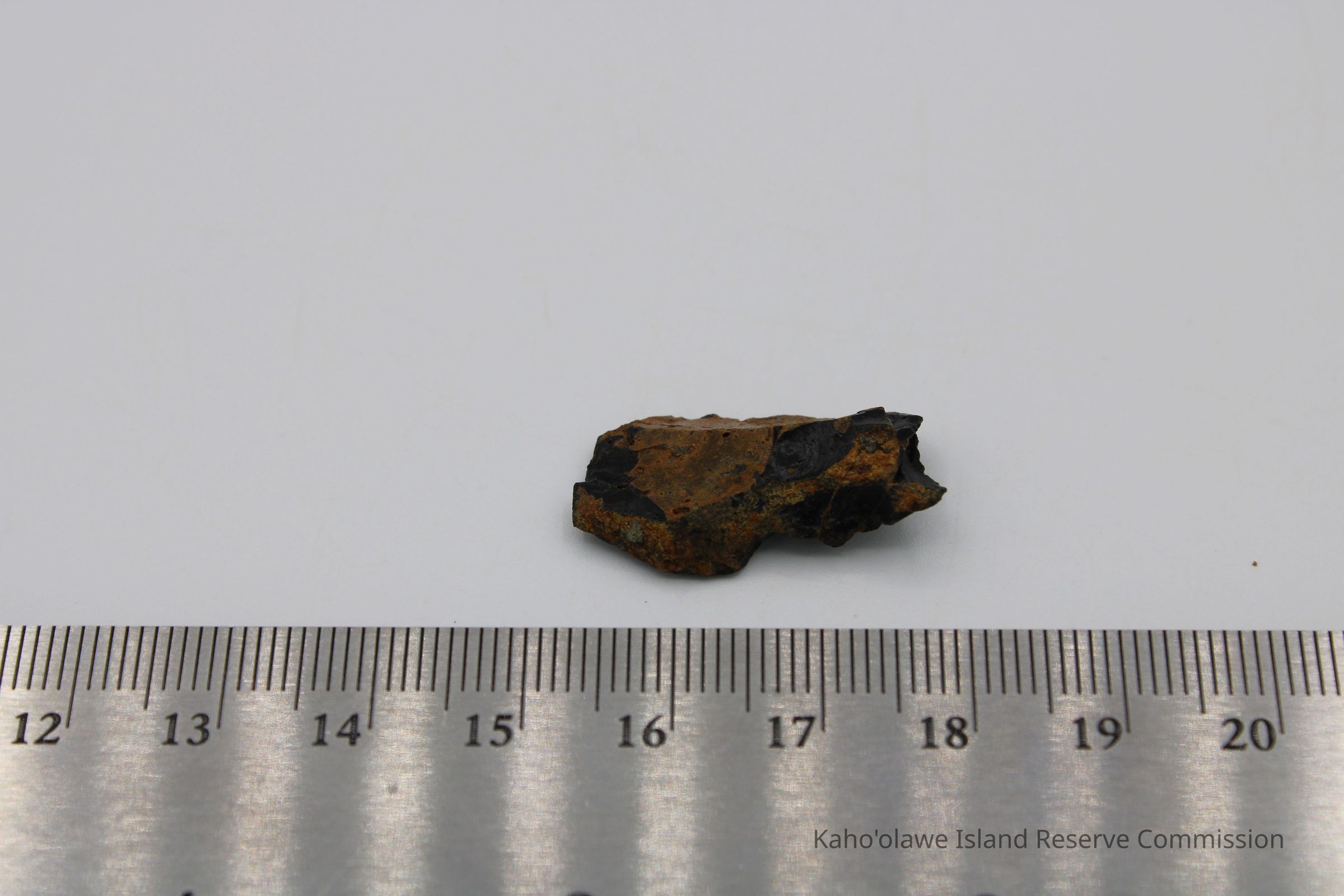 Flake of basaltic glass in roughly rectangular shape with three jagged edges. One side is black with small holes and light brown layer on opposite side.Collection