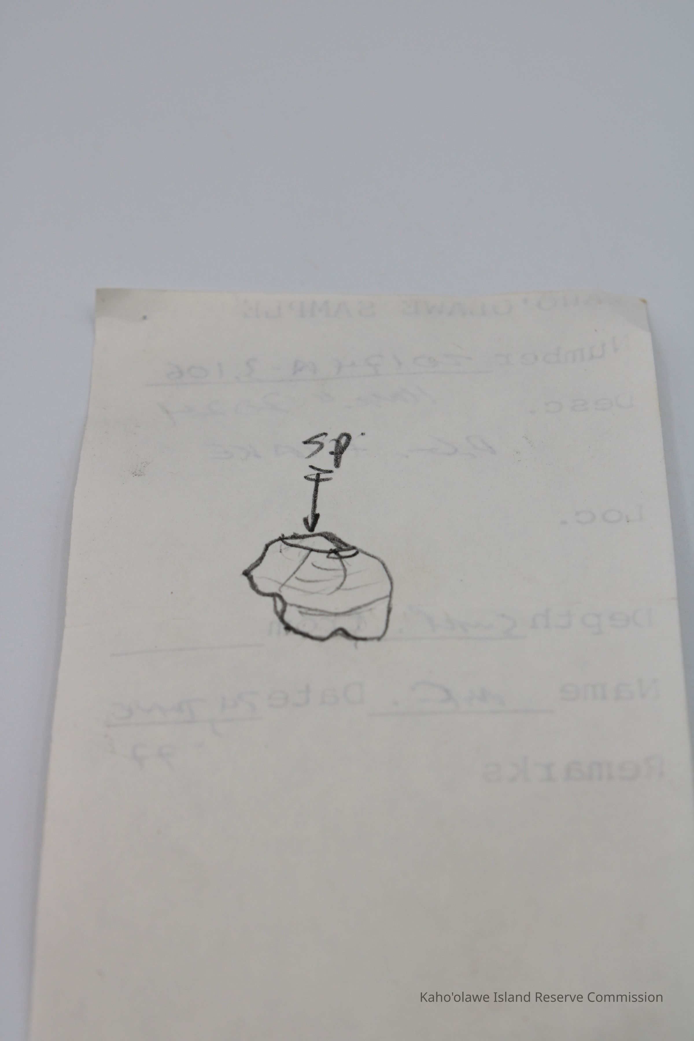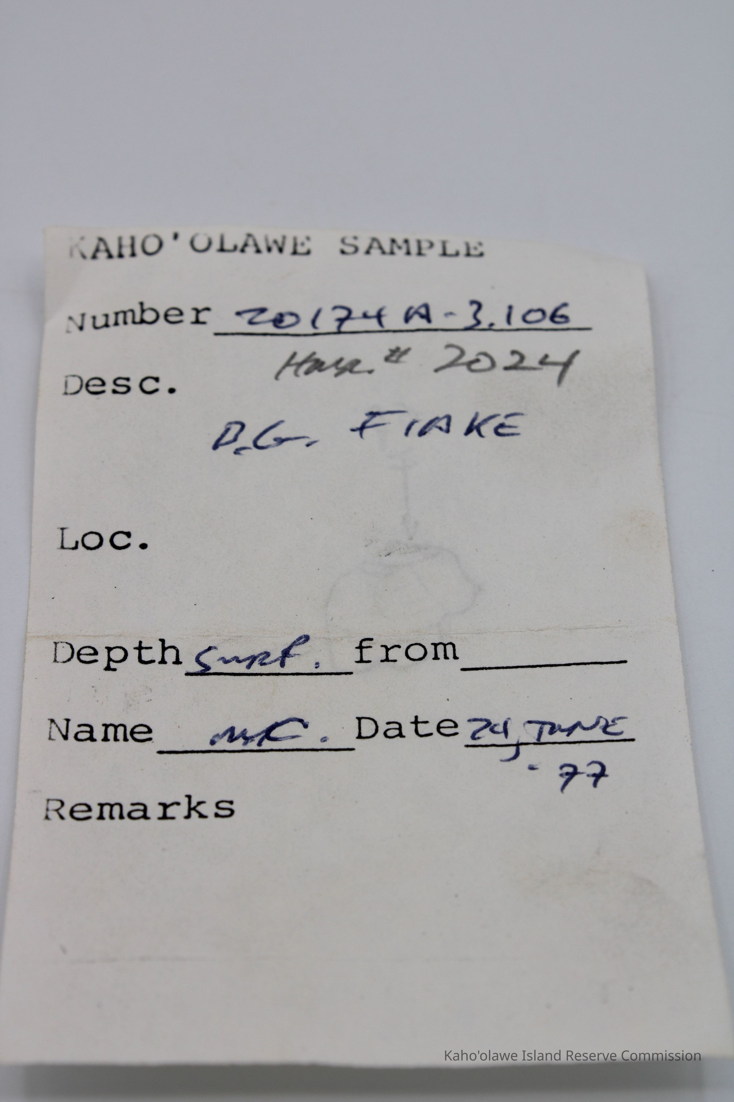 Basaltic glass flake (only storage bag and artifact slip located). It may have been removed for lab analysis.Collection