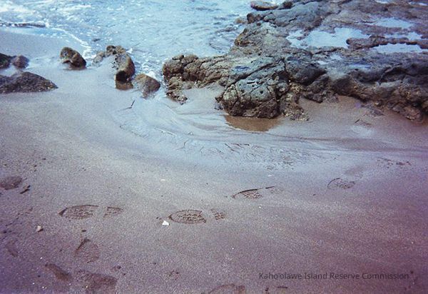 Color photo of footprints in wet sand along rocky shoreline at Hilu'ula.