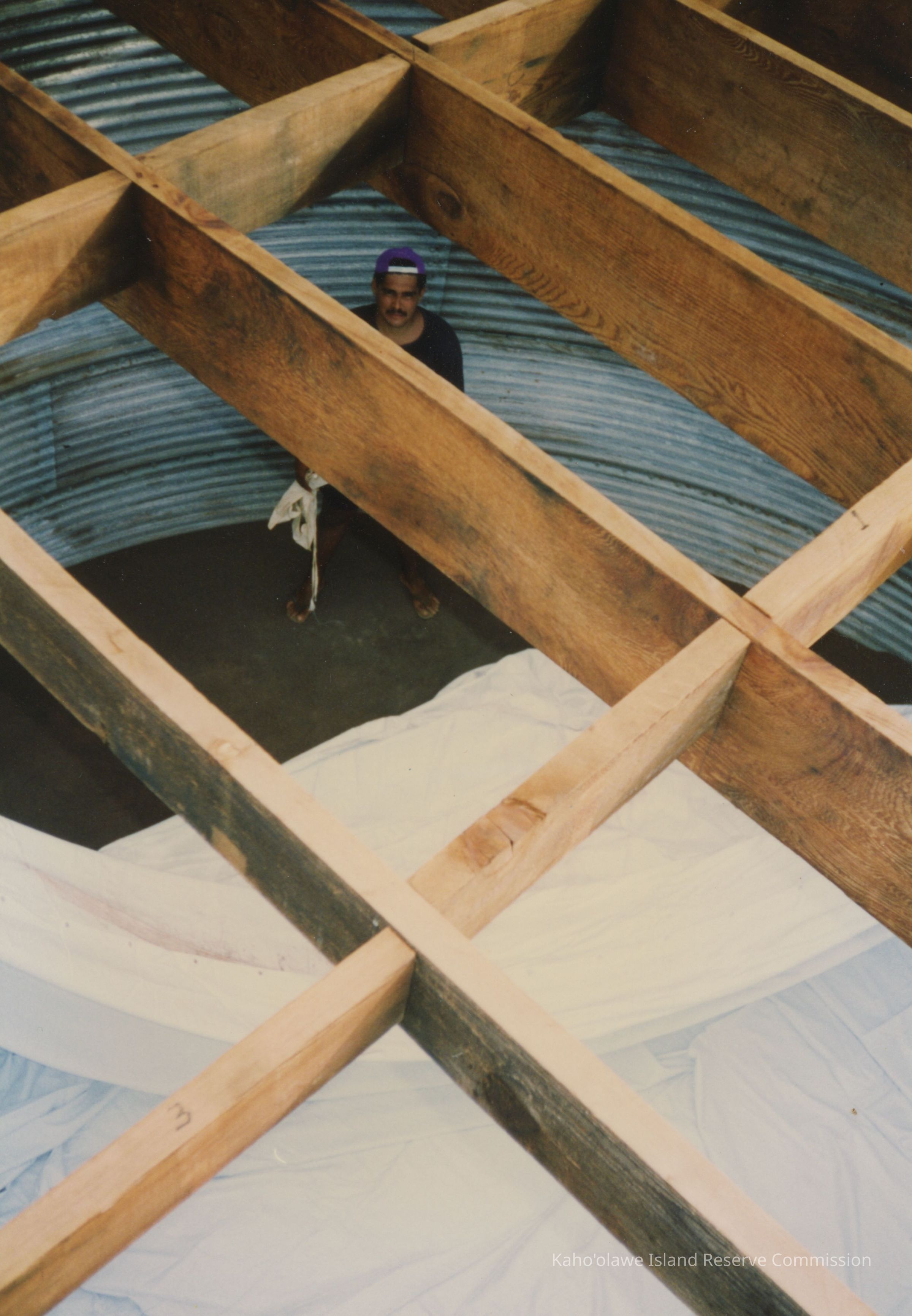 Color photograph of an unidentified man standing on hardpan looking up through wooden frame on top of a water tank.