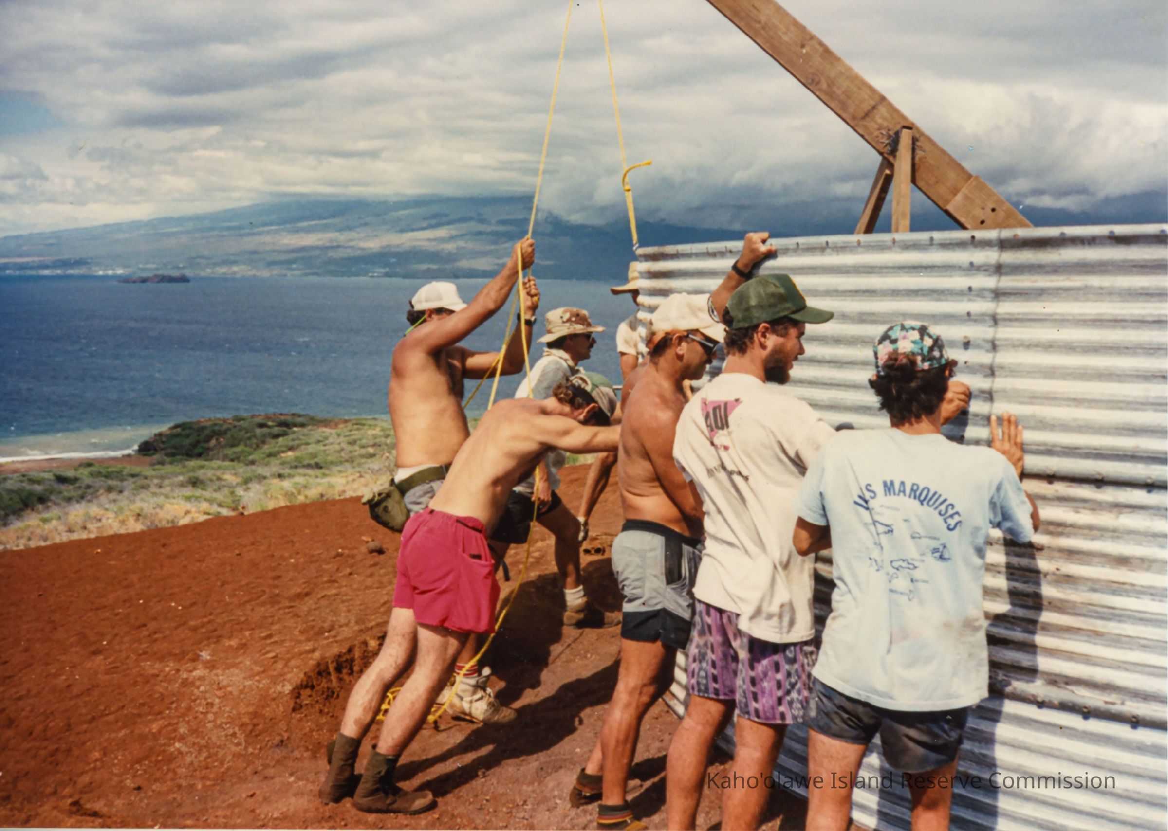 Group of men assembling round metal corrugated walls. This photo was probably taken during the PKO (Protect Kahoolawe 'Ohana) access to construct a water catchment.