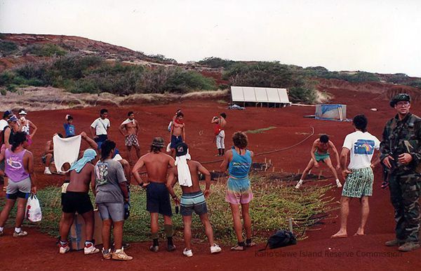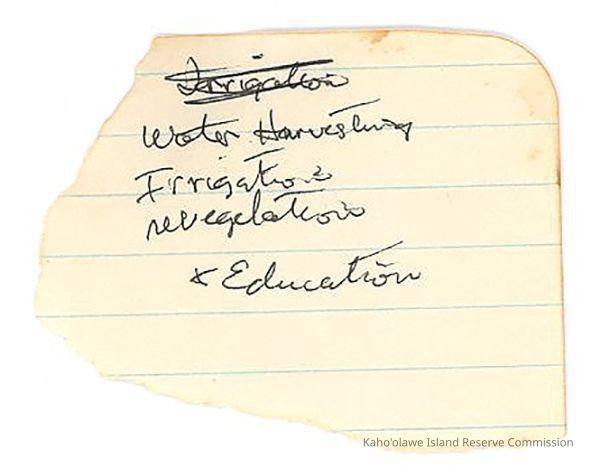 Color photo of a group of unidentified people standing around a planting of pa'u 'o Hi'iaka on hard pan with water tank in the background. According to the handwritten note originally found with the photo it was this event was focused on water harvesting, irrigation, revegetation and education.Collection