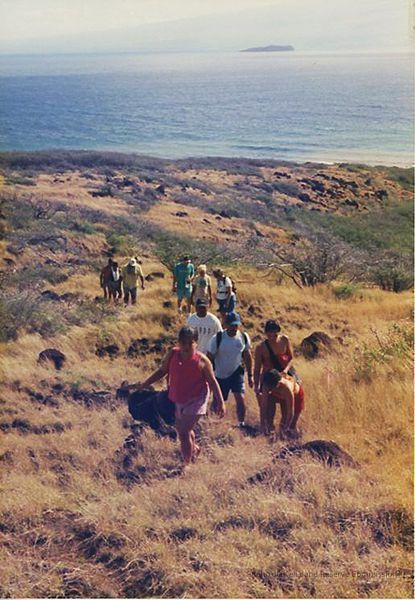 Color photo of a group of unidentified people (possibly from the Legal Aid Society (Moloka'i ) hiking up a trail with Molokini and Maui in the distant background.
