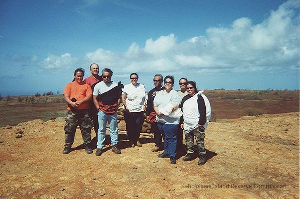 Color photo of a group of people standing in front of a rain ko'a (shrine) at Pu'u 'O Moa'ula Nui looking toward Luamakika. From left to right: Mark Tsuha, unknown (in back), unknown; unknown, unknown; Hokulani Holt; unknown (in back); Lei IshikawaCollection