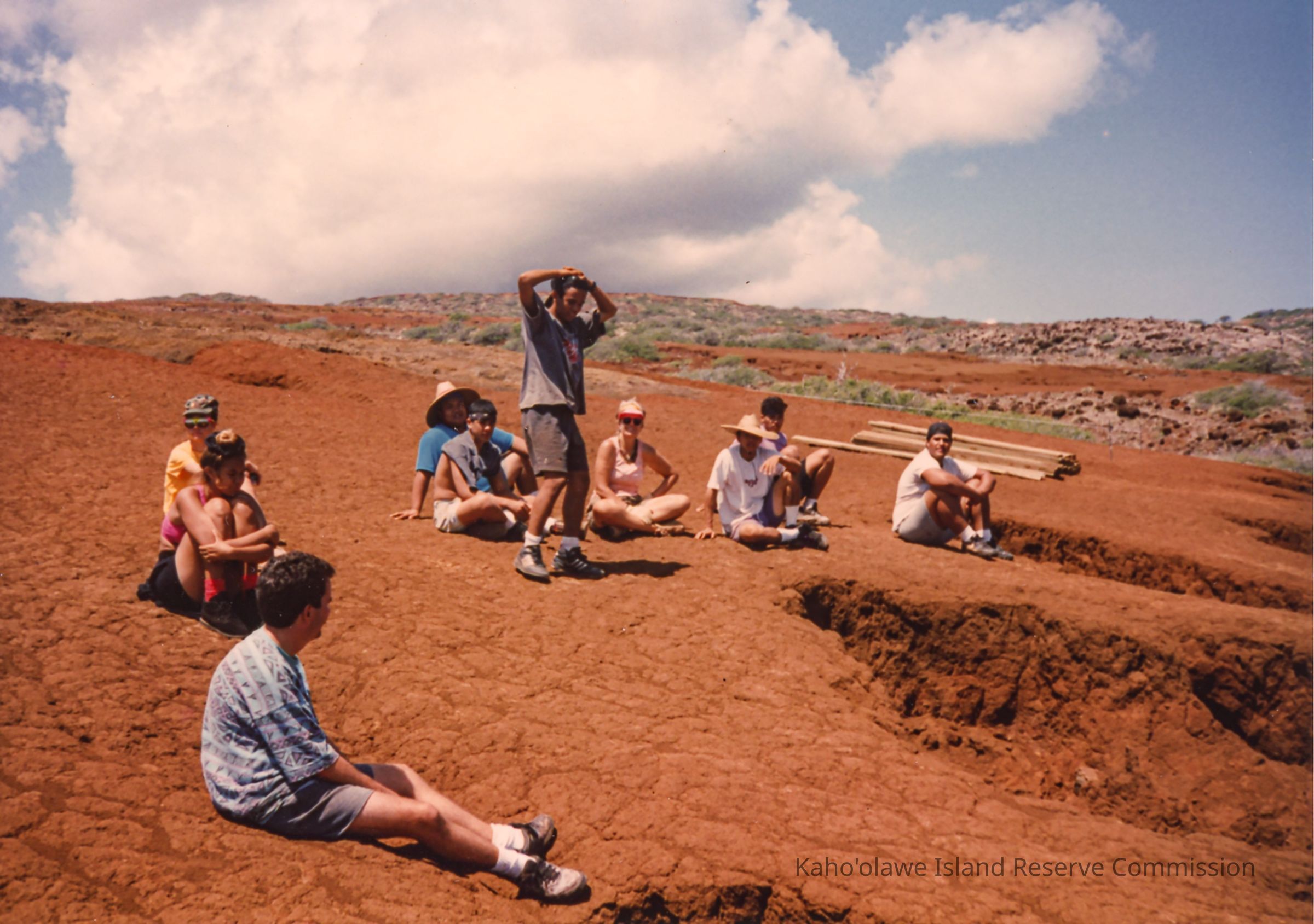 A group of people resting on a sunny day on a dry, reddish terrain, surrounded by open skies and sparse vegetation.