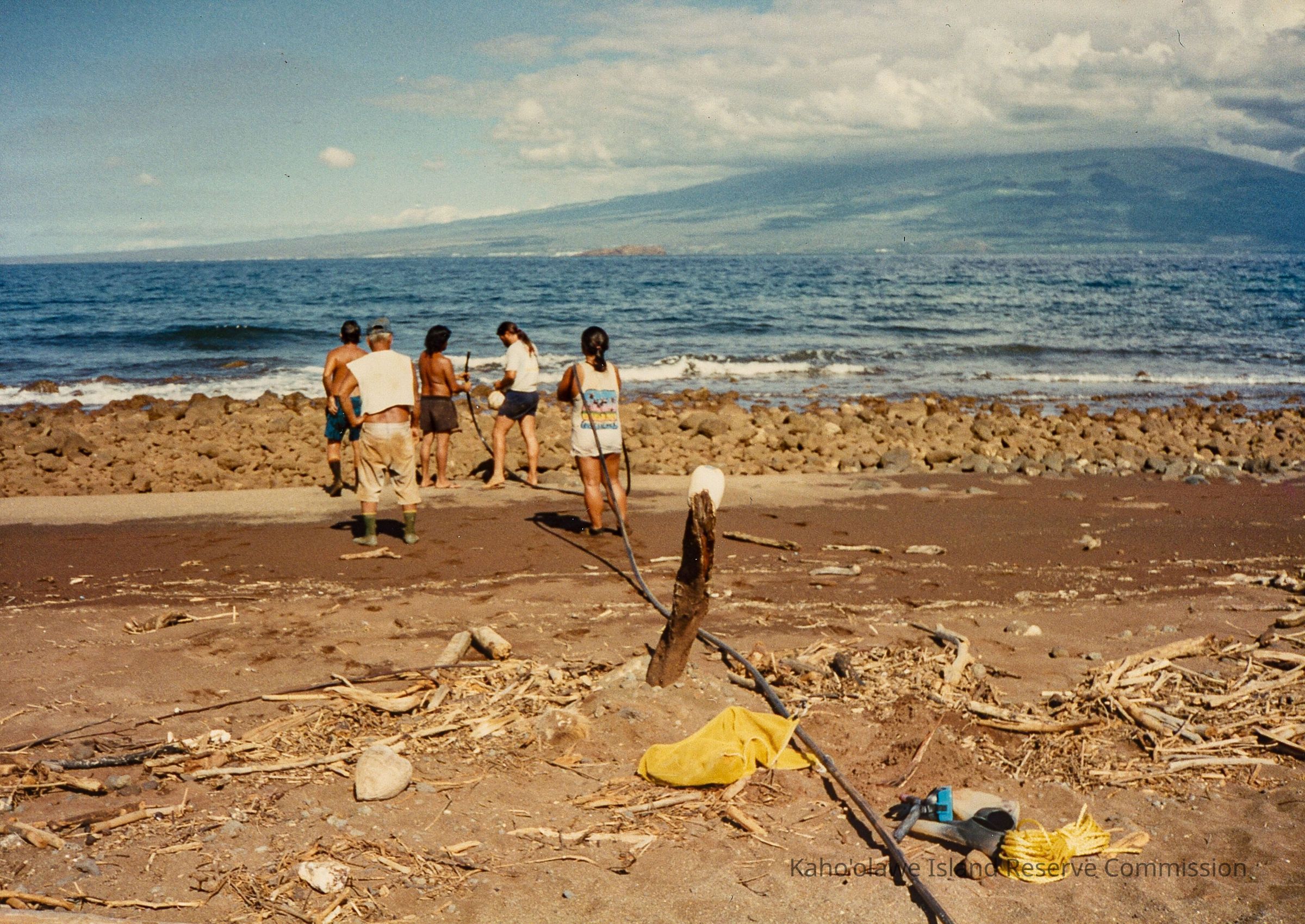Color photograph of five unidentified people working to uncoil black hose and standing on a beach with a rocky coastline, possibly Hakioawa Beach with Molokini and Maui in the background. The hand-written notation on a page several pages ahead of the original photo album page with this photo read: "November 14-17 1993; Advance Crew Before Makahiki."Photograph Details