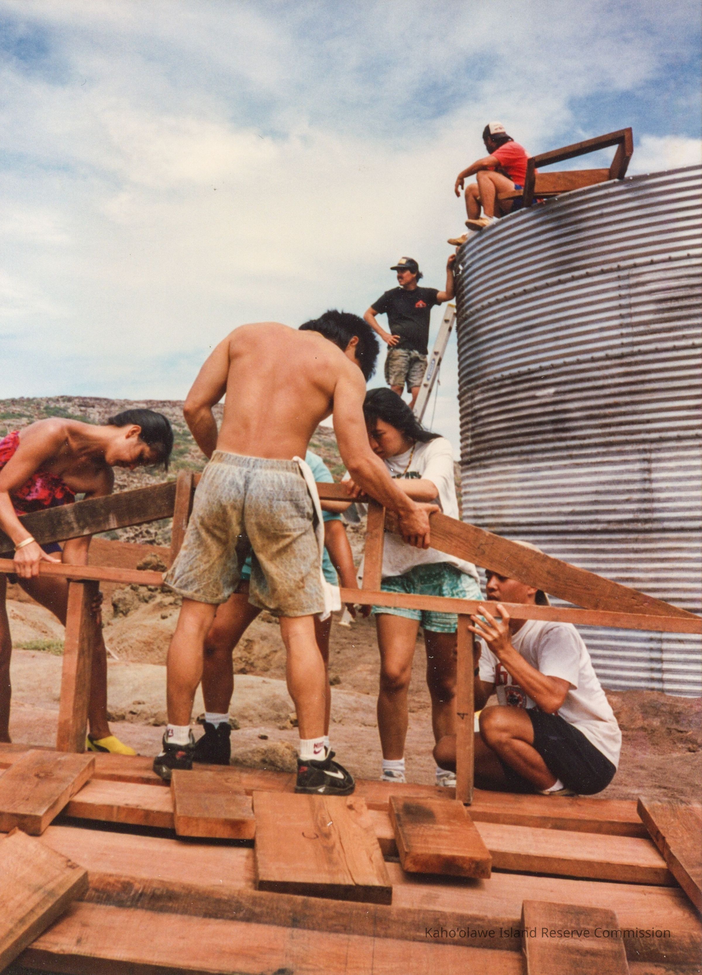 Color photo of a group of unidentified people working on assembling a wooden frame. There are two people on the water catchment structure in the background. One is standing on a metal ladder leaning against the structure and another sitting on its top.