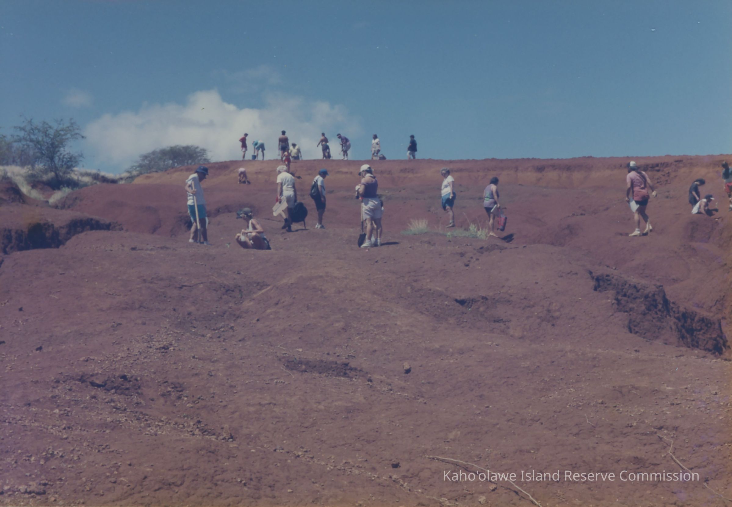 A color photo of a group of unidentified people planting in a hard pan area. There are a couple of trees in the far backgroundPhotograph Details
