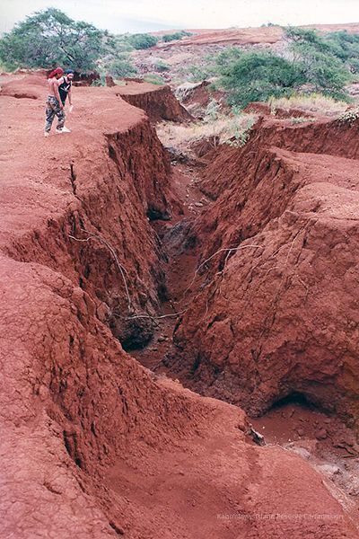 Color photo of two unidentified men looking into a erosion gully and hard pan.