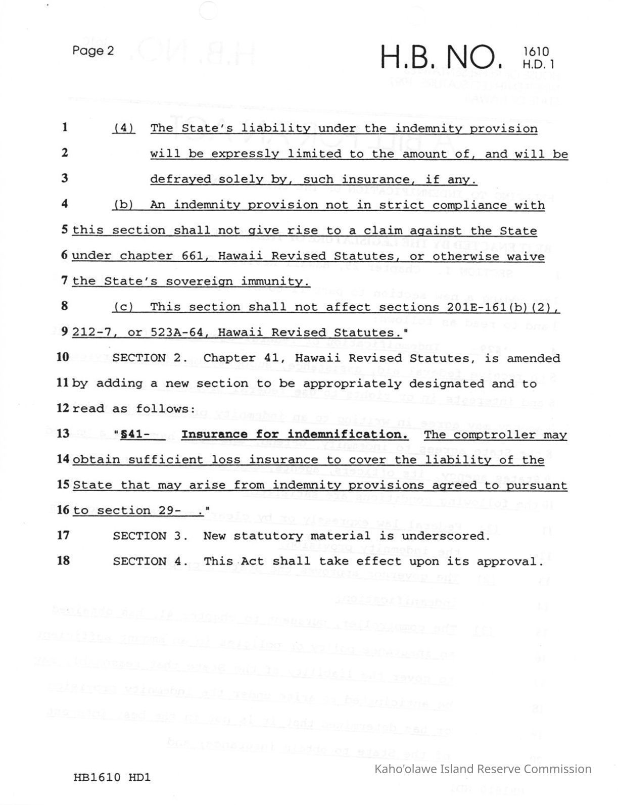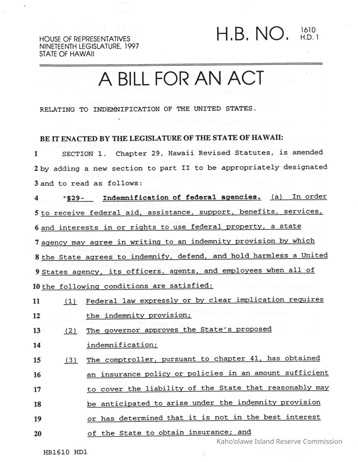 H.B. (House Bill) 1610 H.D. (House Draft) 1, A Bill for an Act Relating to Indemnification of the United StatesContainer