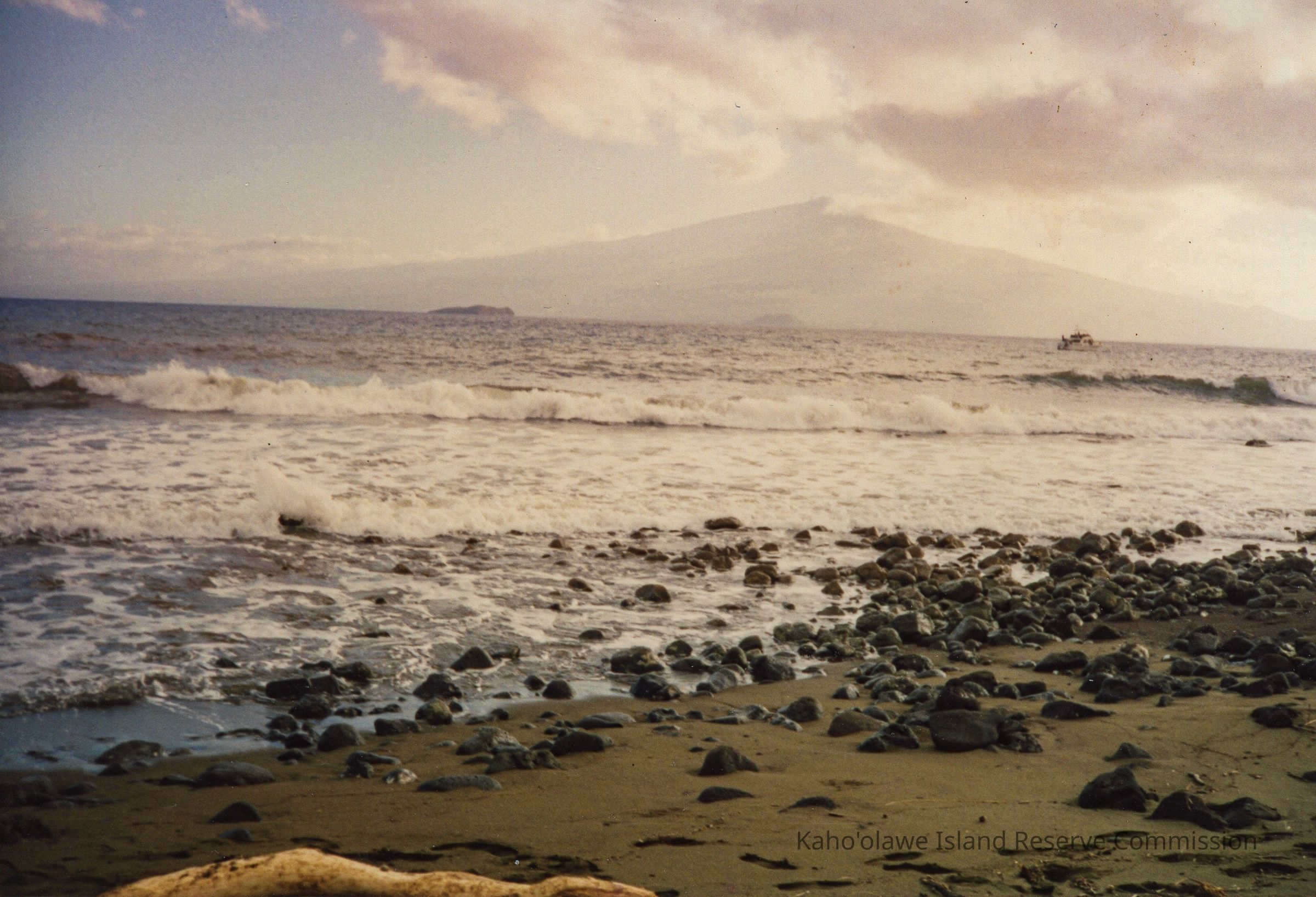 Color photo of Hakioawa Bay with rocky part of Hakioawa Beach in the forefront. There is a boat to the right. Molokini and Haleakala in the far background. The notation on the original photo album page notes: "October 31, 1993, Zodi broken. Gotta "Tow Line" Everone [sic]/Thing."Photograph Details