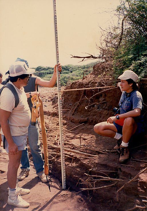 Color photo of four unidentified people at left bank at mouth of Hakioawa stream working on channel geometry. Channel geometry is the description of the size and shape of the channels that water flows through.