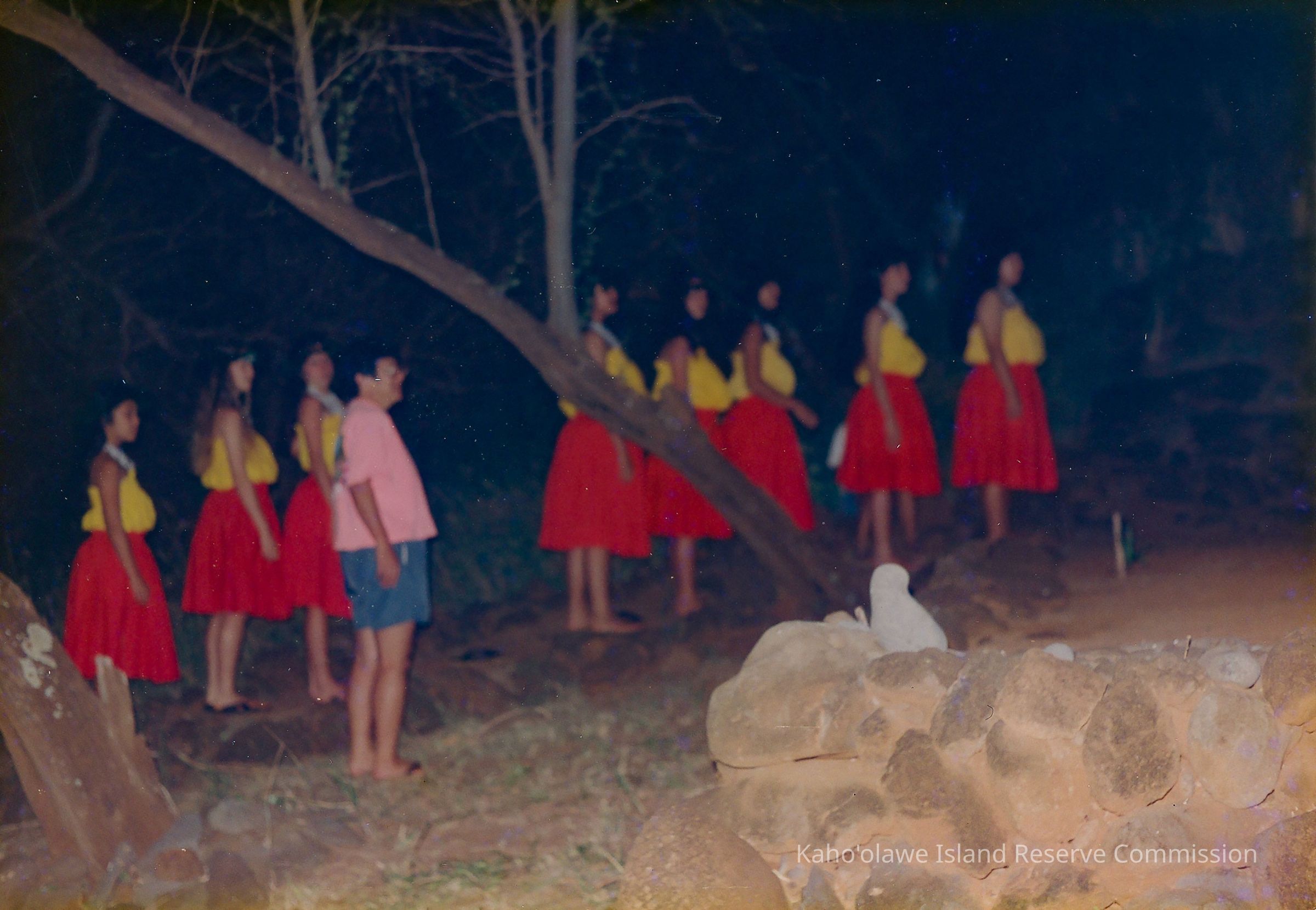 In the image, a group of women in yellow tops and red skirts stand in a line outdoors at night, alongside a person in a pink shirt